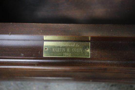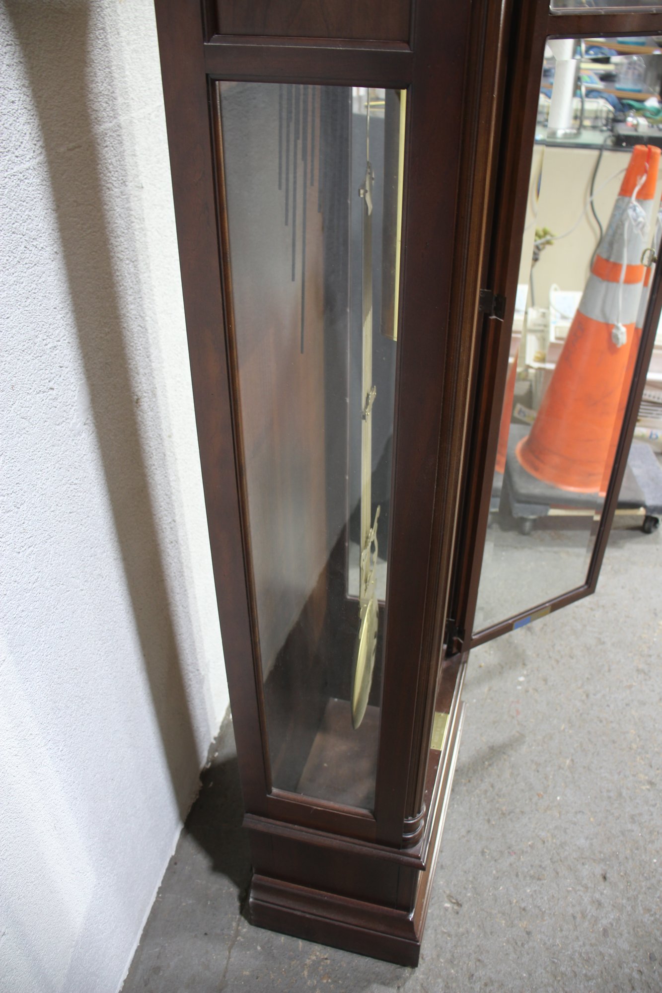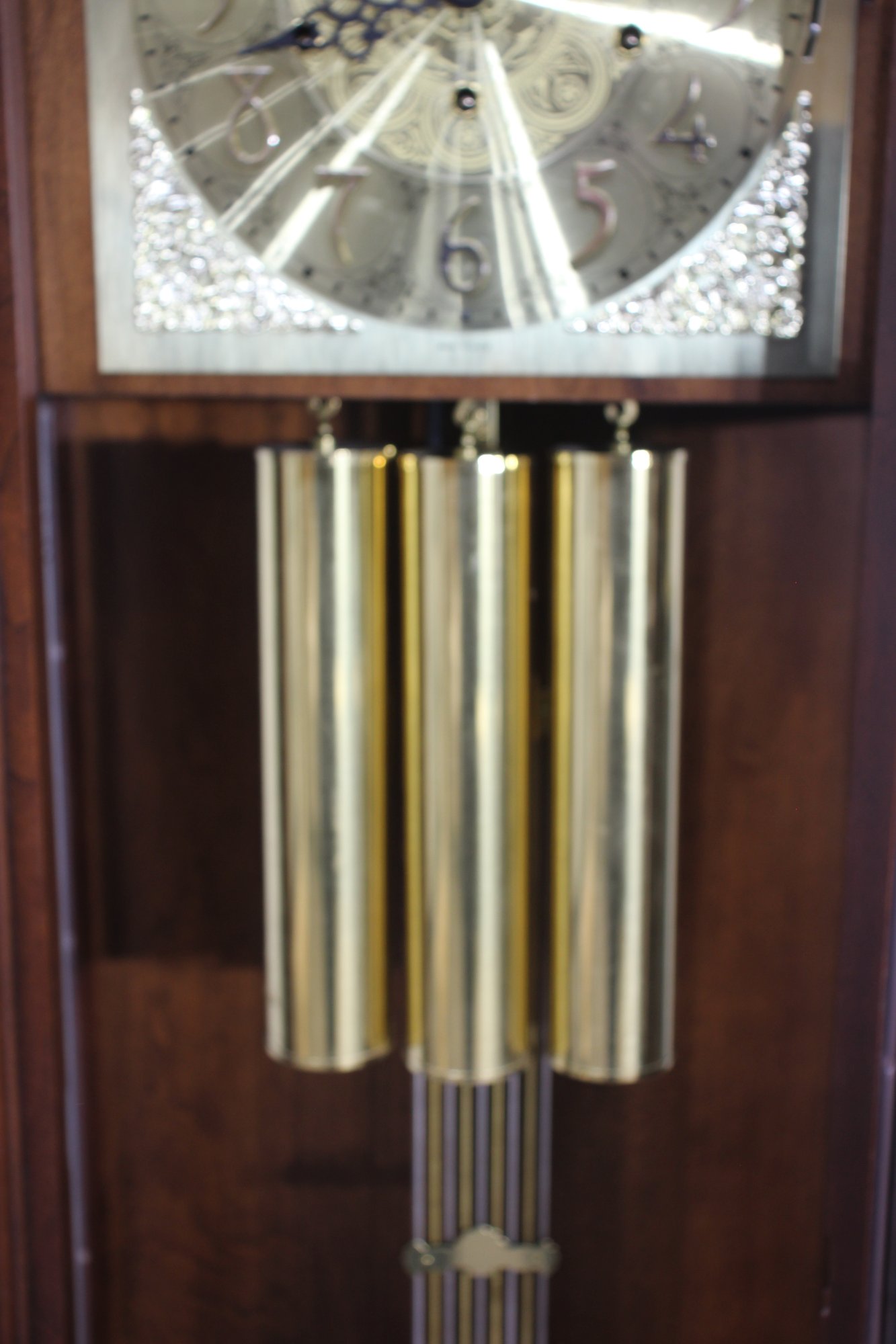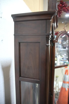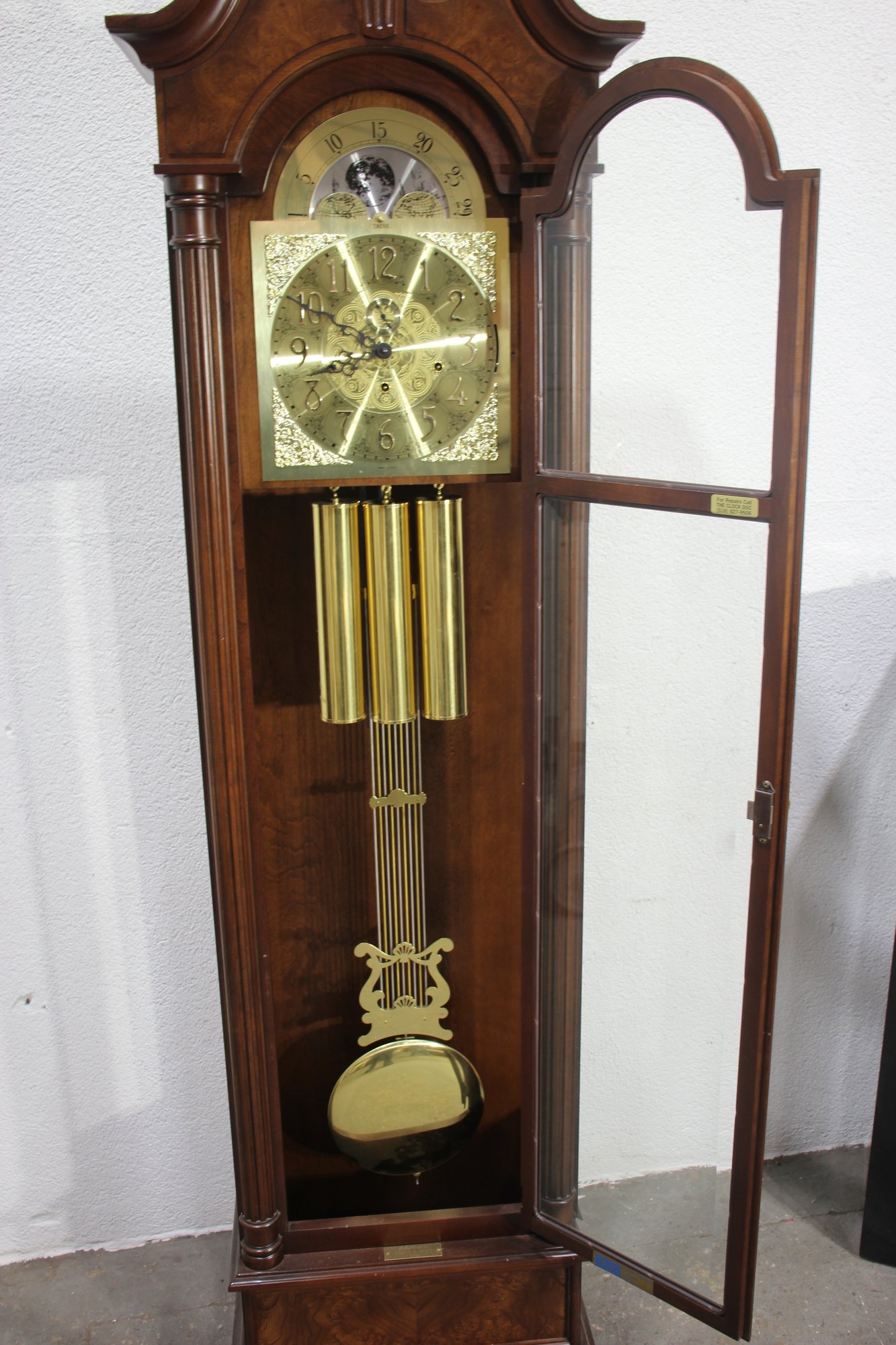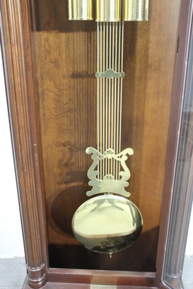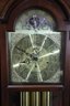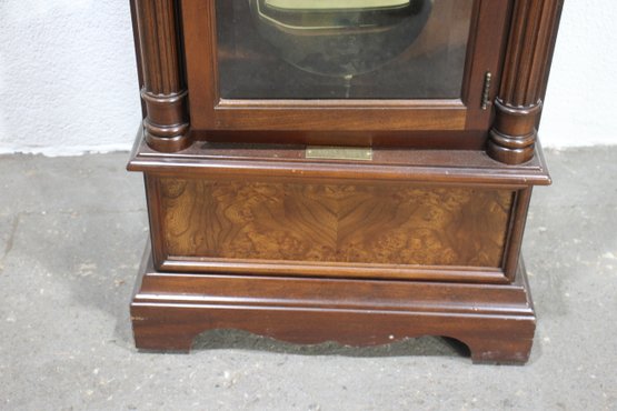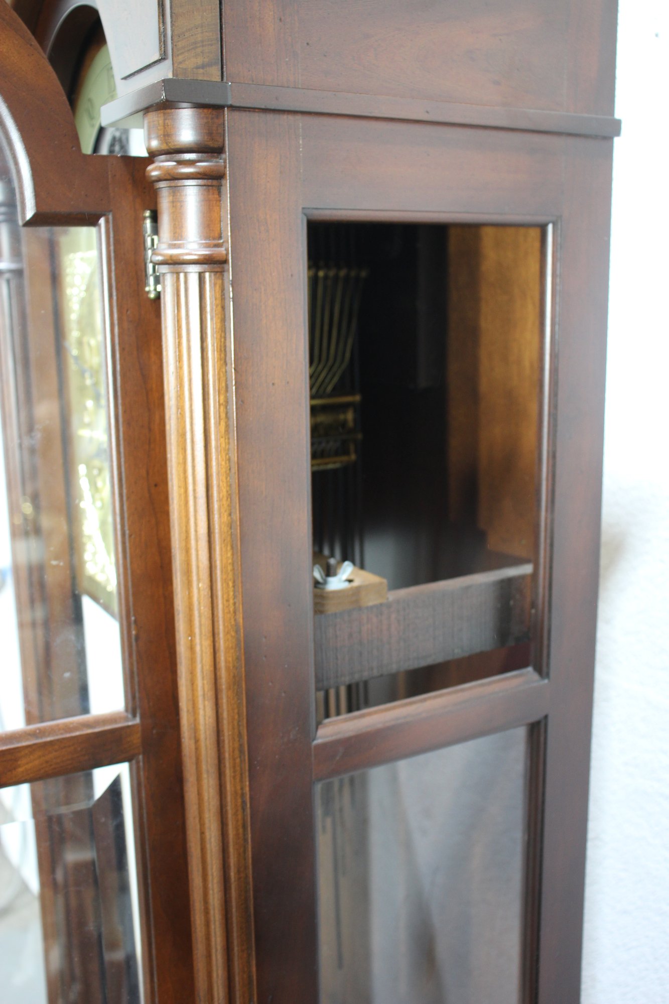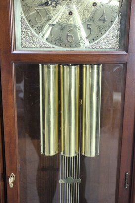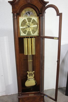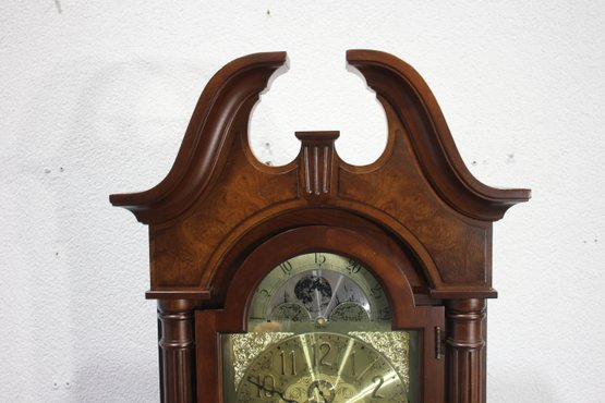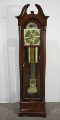 Vintage Grandfather Clock By Sligh - Elegant mahogany case with a rich finish and classic swan-neck pediment, accented by fluted columns and intricate detailing.