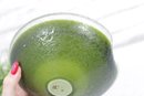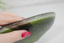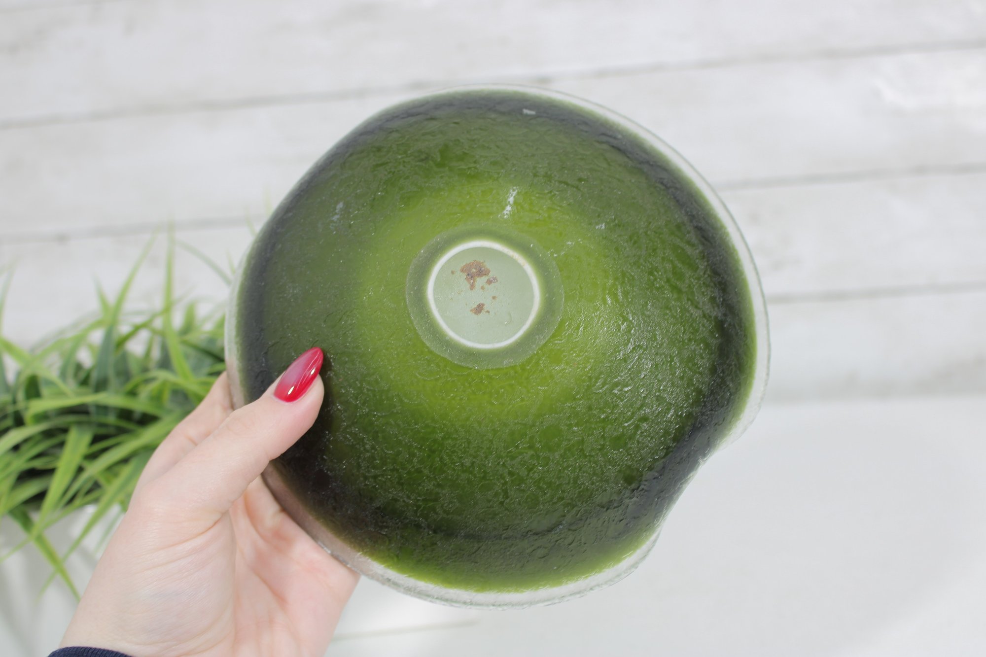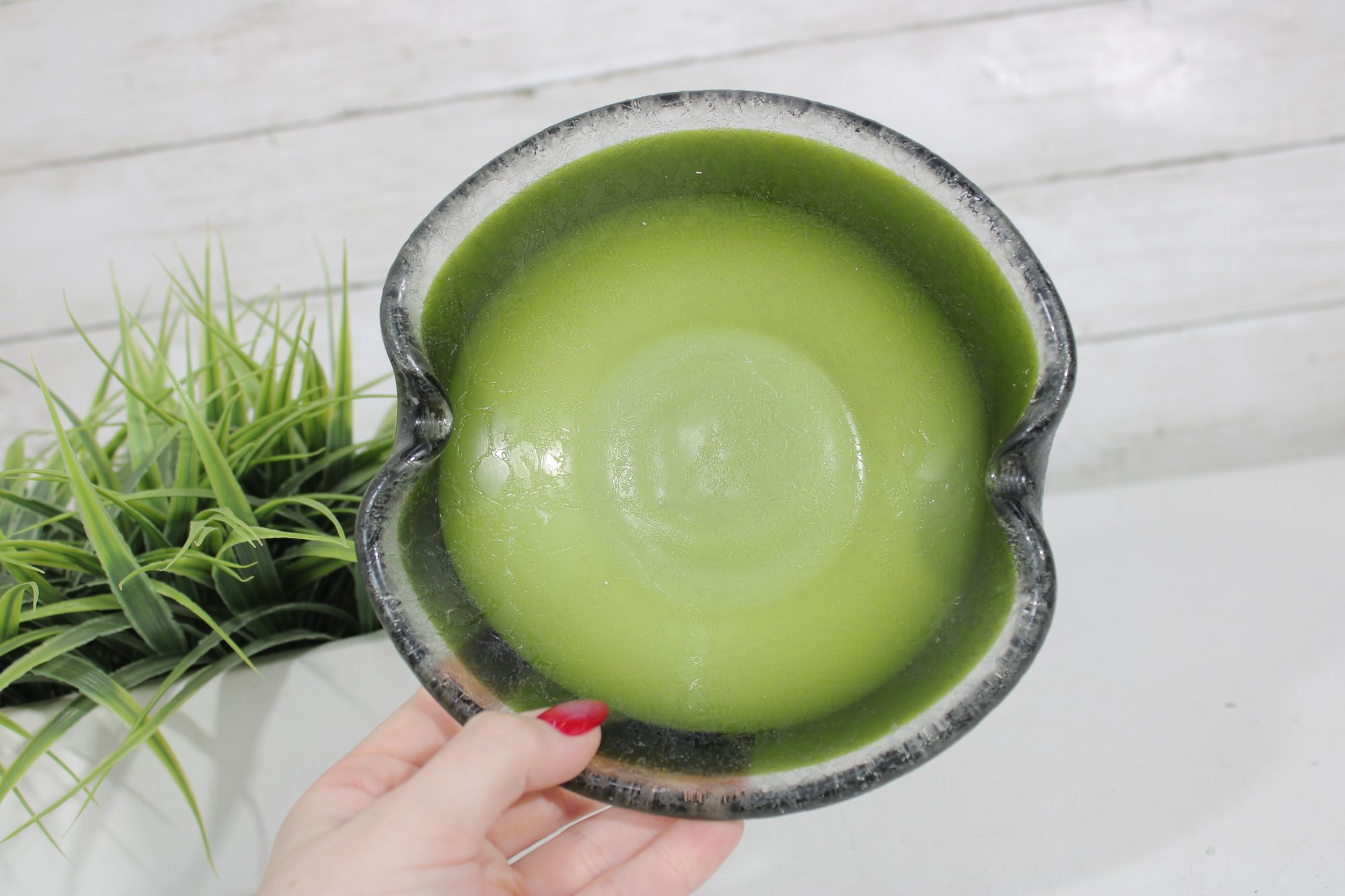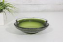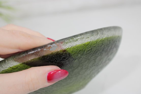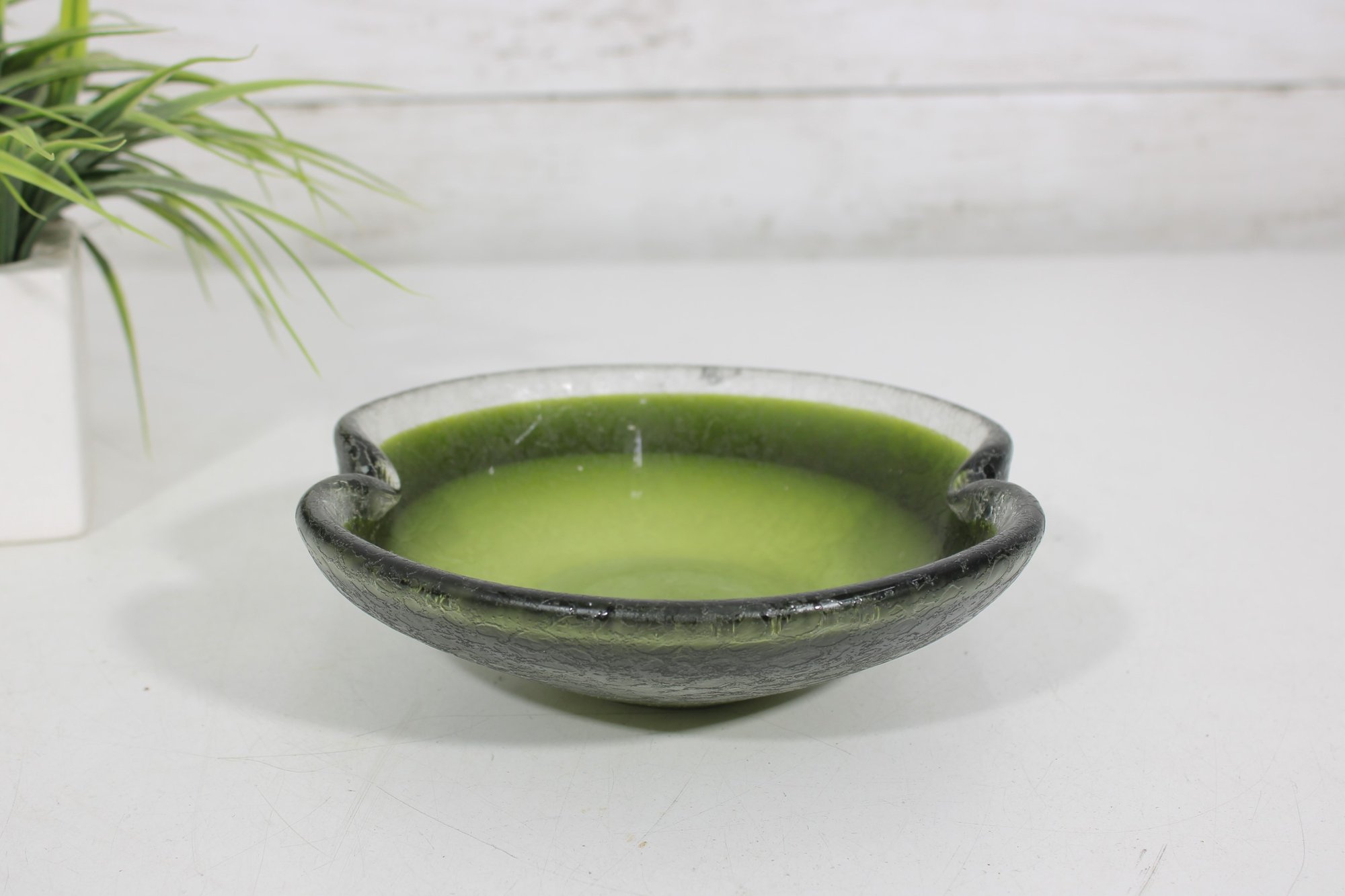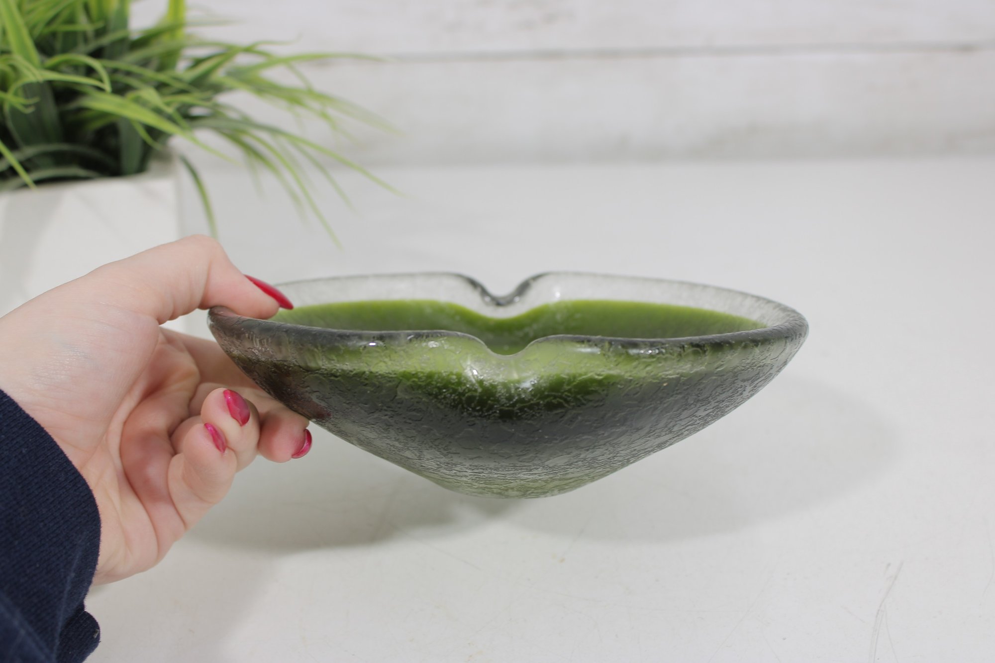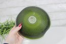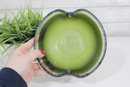 Striking vintage art glass bowl featuring a vibrant green interior that fades into a darker, textured exterior. The piece is designed with two subtle opposing spouts, giving it a unique organic shape and functional appeal.