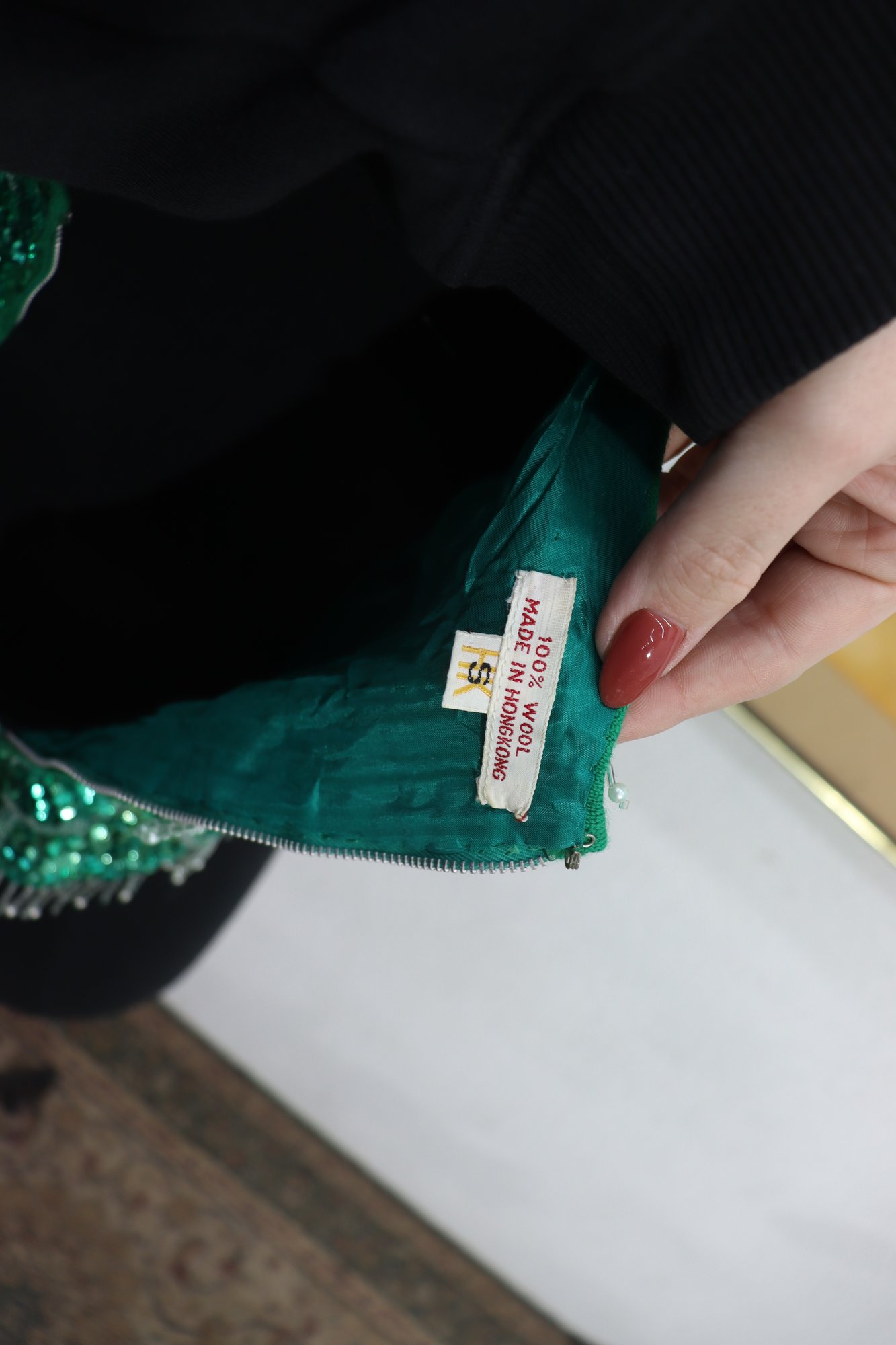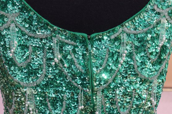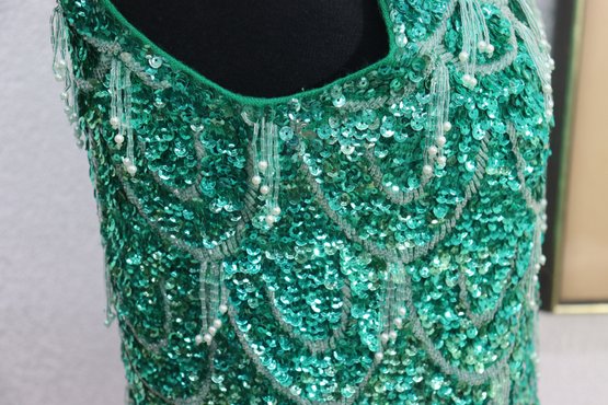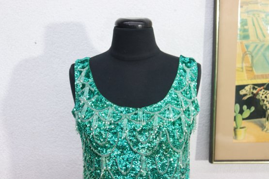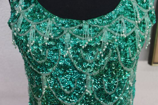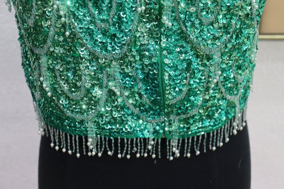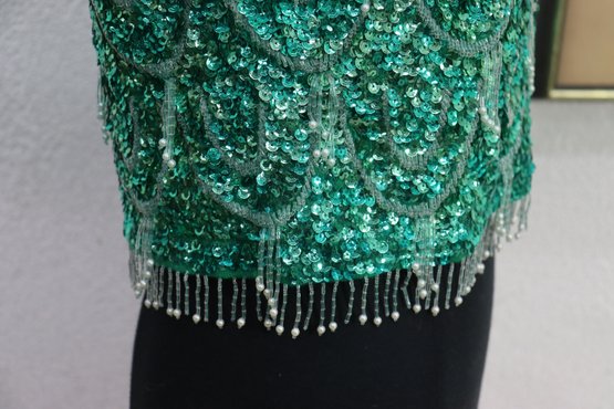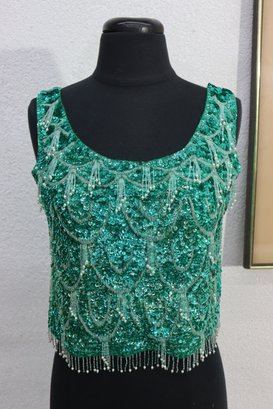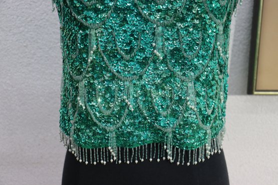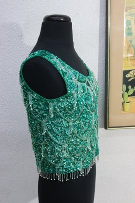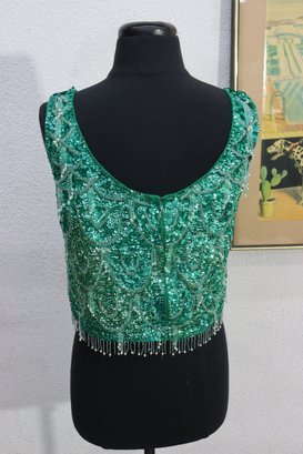 Eye-catching vintage evening top in a rich emerald green, lavishly embellished with dense sequins and beadwork in an ornate, geometric pattern. The sleeveless design features a classic scoop neckline and a straight hem finished with delicate beaded fringe that adds movement and sparkle with every step.