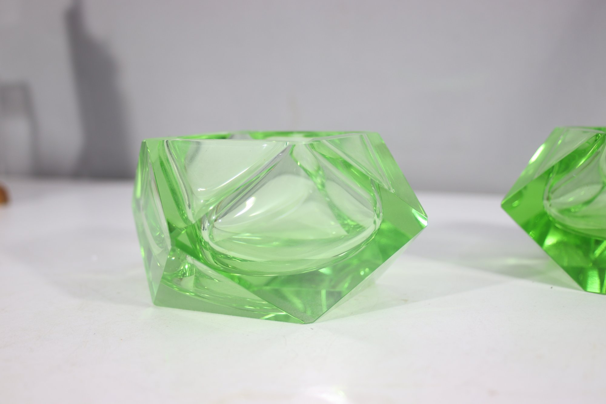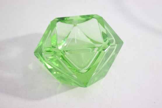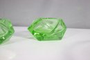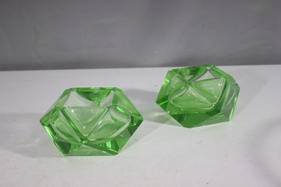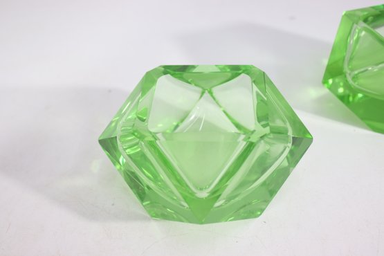 pair of vintage green cut glass ashtrays, featuring a bold geometric diamond shape with a brilliant faceted design. The translucent green glass gives off a luminous glow, making them an elegant addition to any mid-century modern or Art Deco collection.