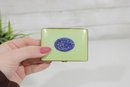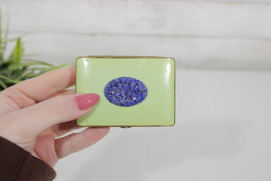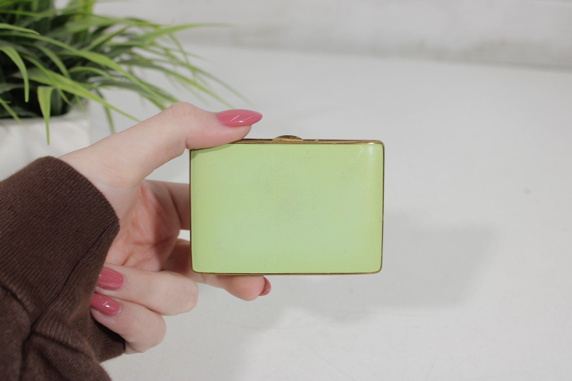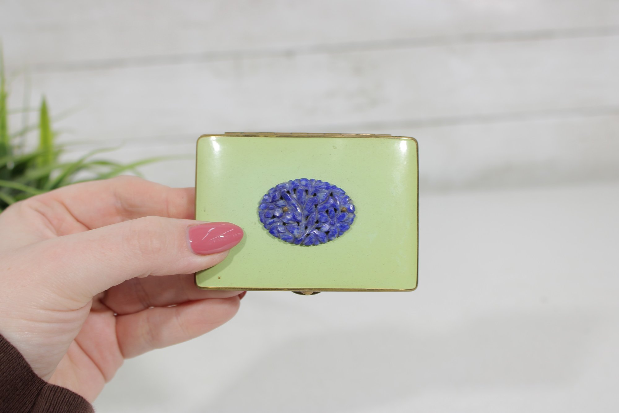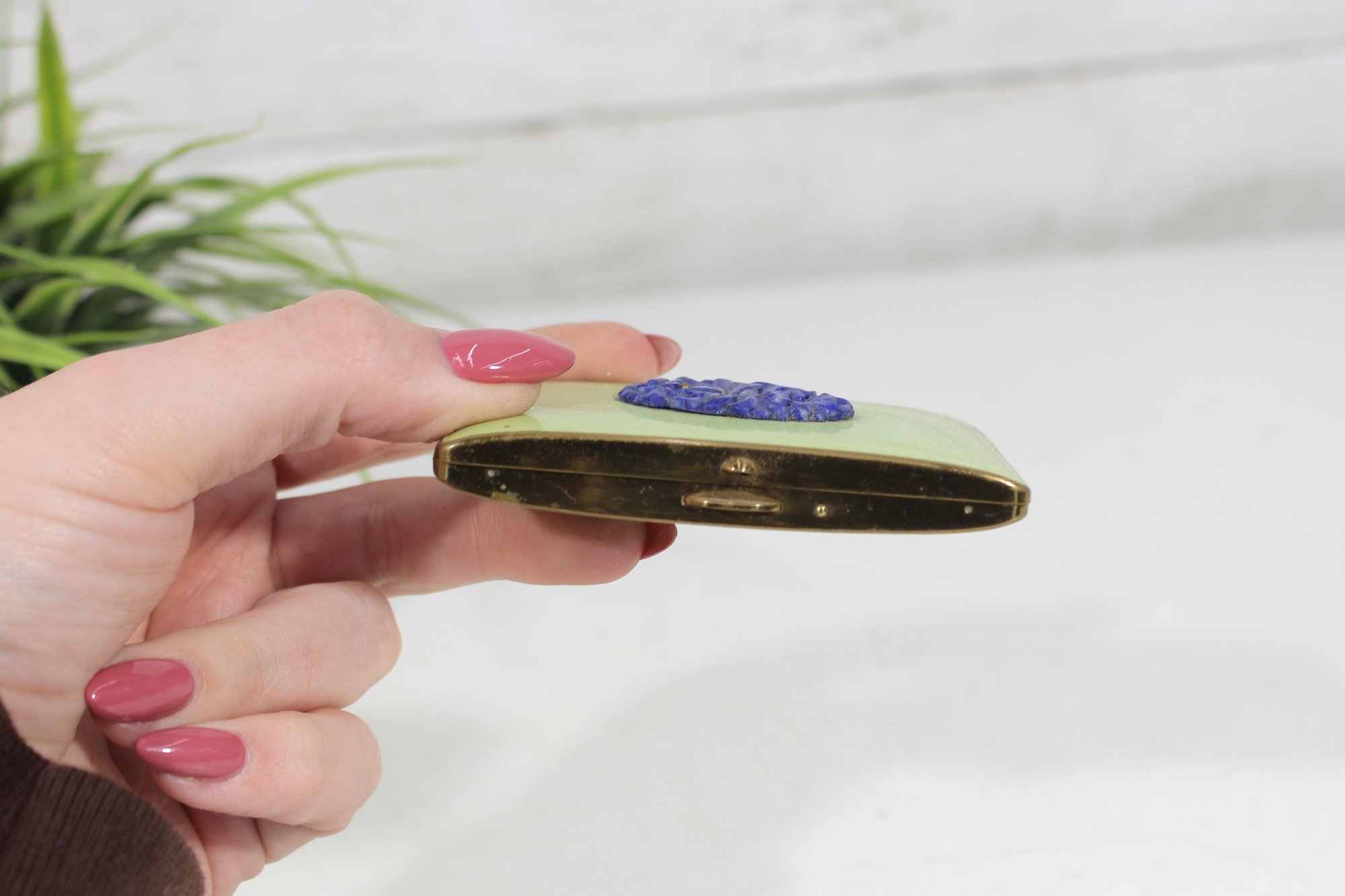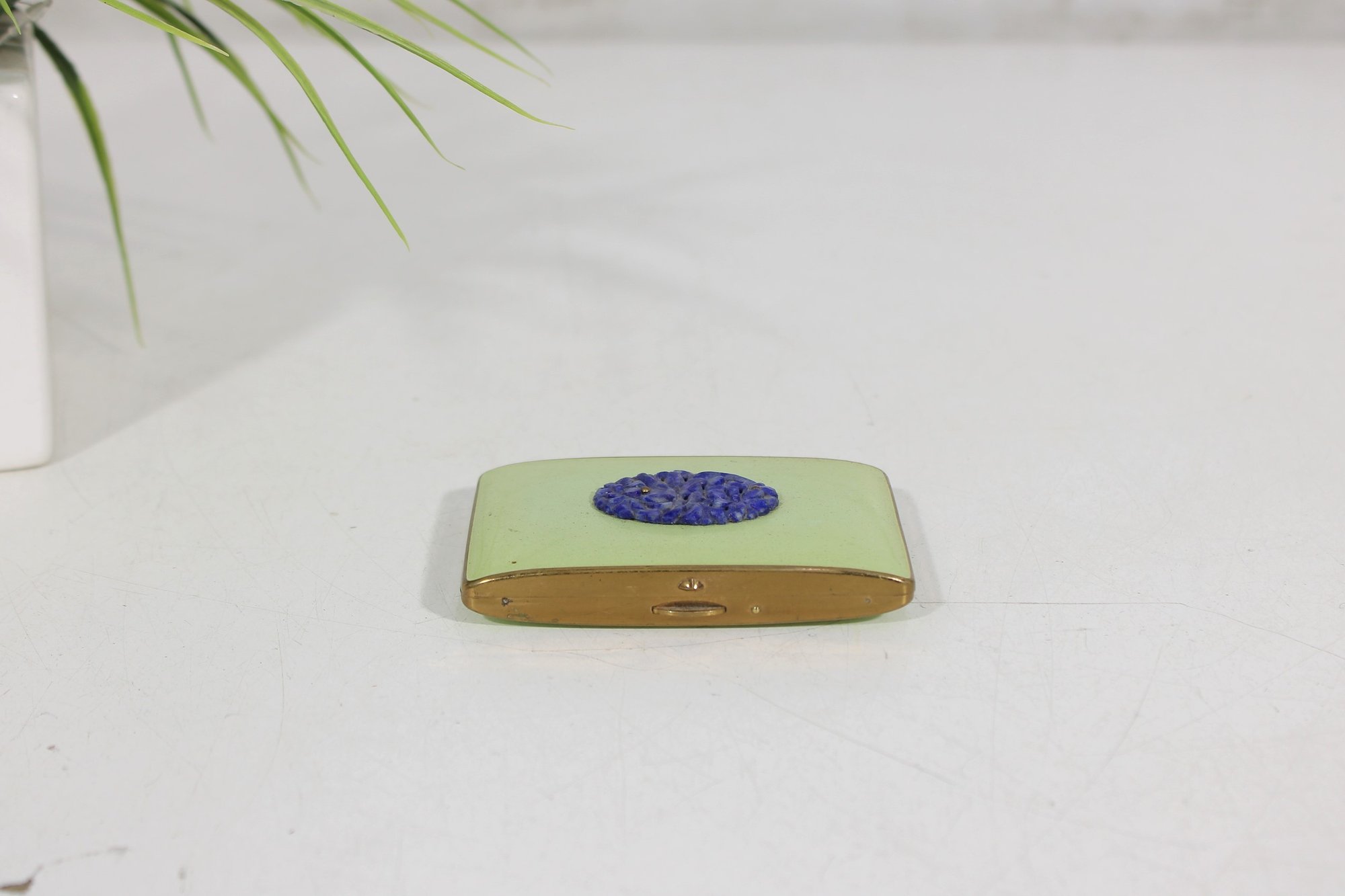 Beautiful vintage powder compact featuring a soft pale green enamel lid accented with a striking blue rhinestone medallion centerpiece. The colorful jeweled accent gives the compact an elegant mid-century vanity style.