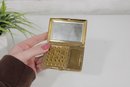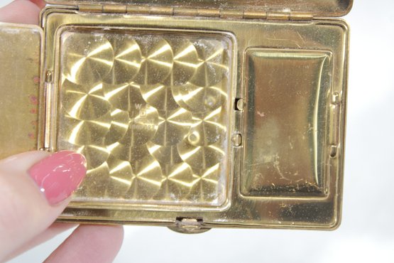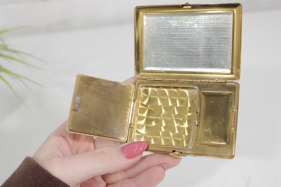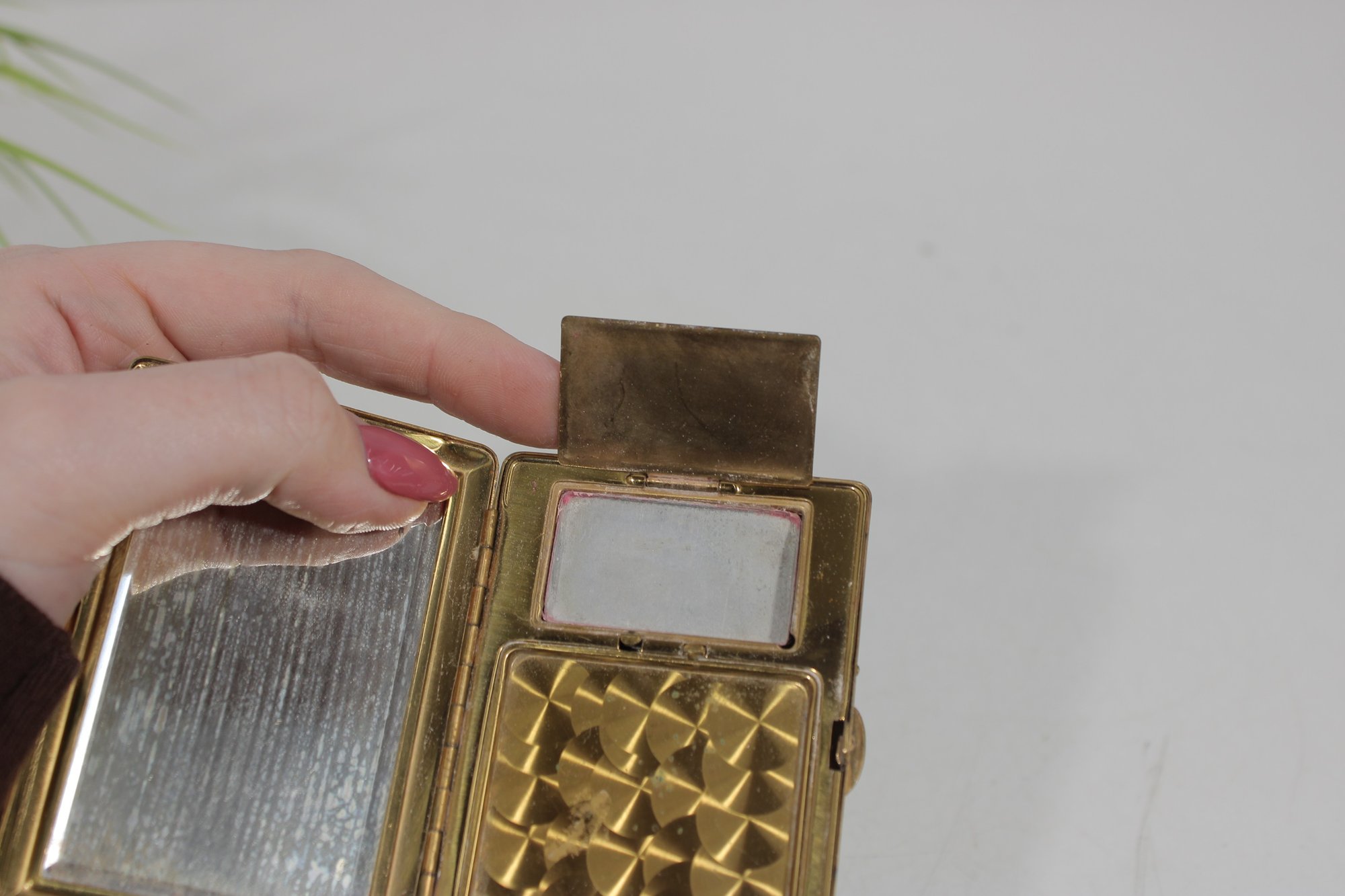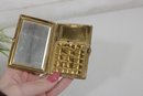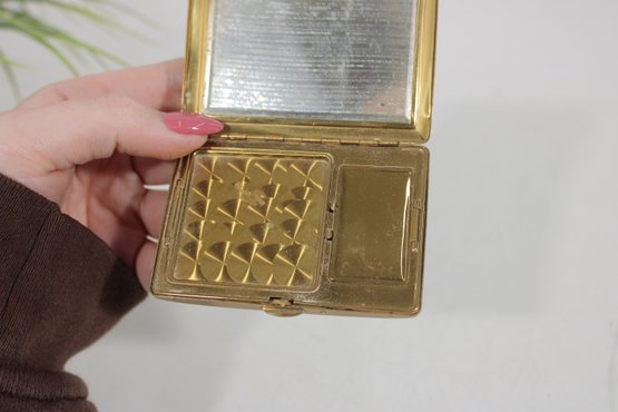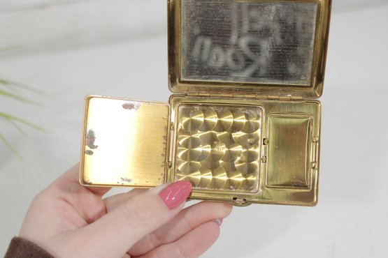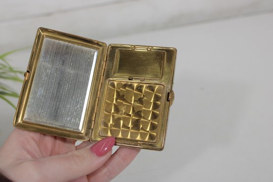 The compact opens to reveal a mirror inside the lid along with the original powder compartment and inner cover. The interior has a textured gold-tone finish typical of vintage cosmetic compacts.
