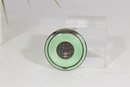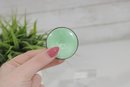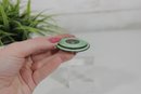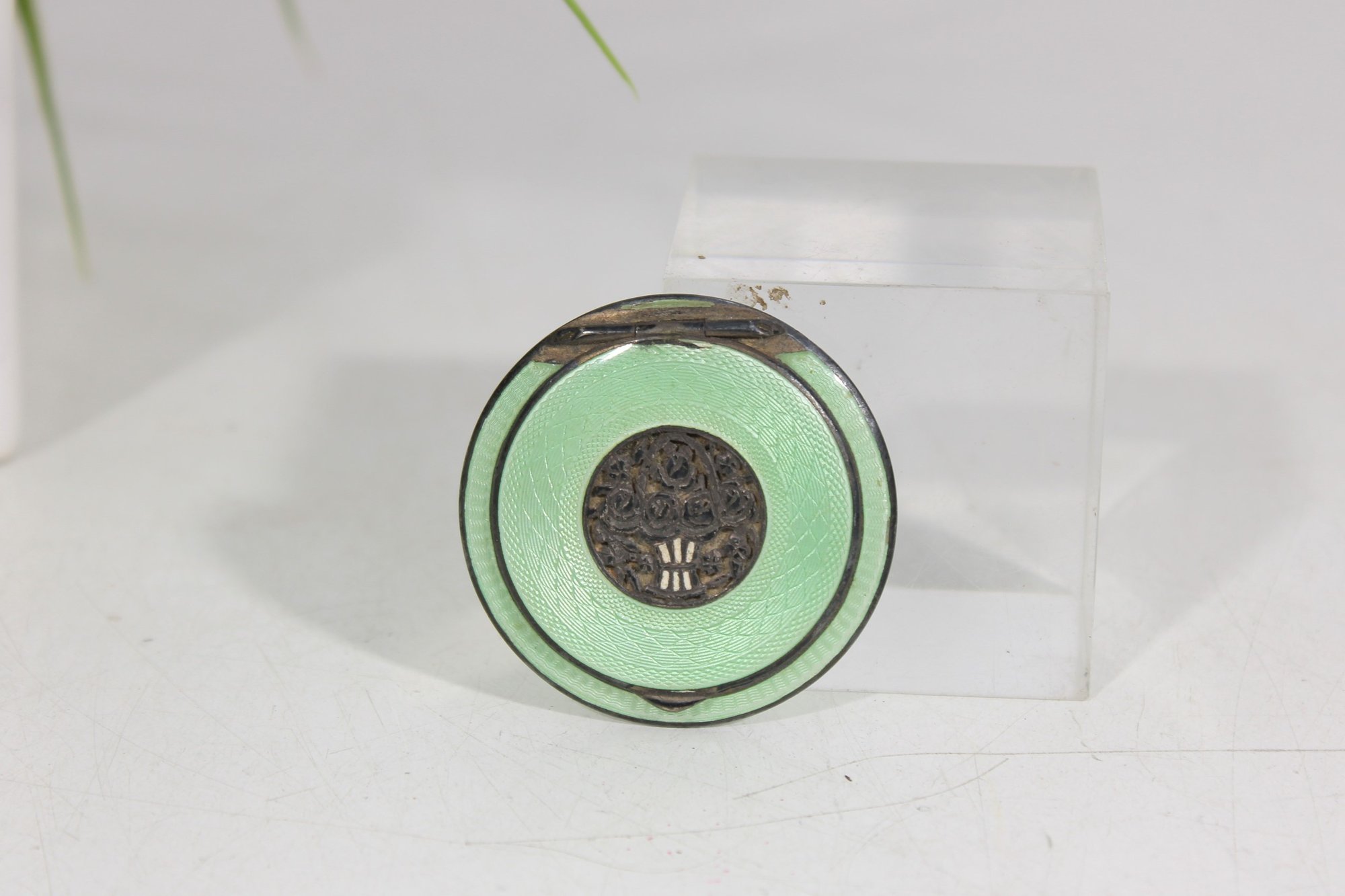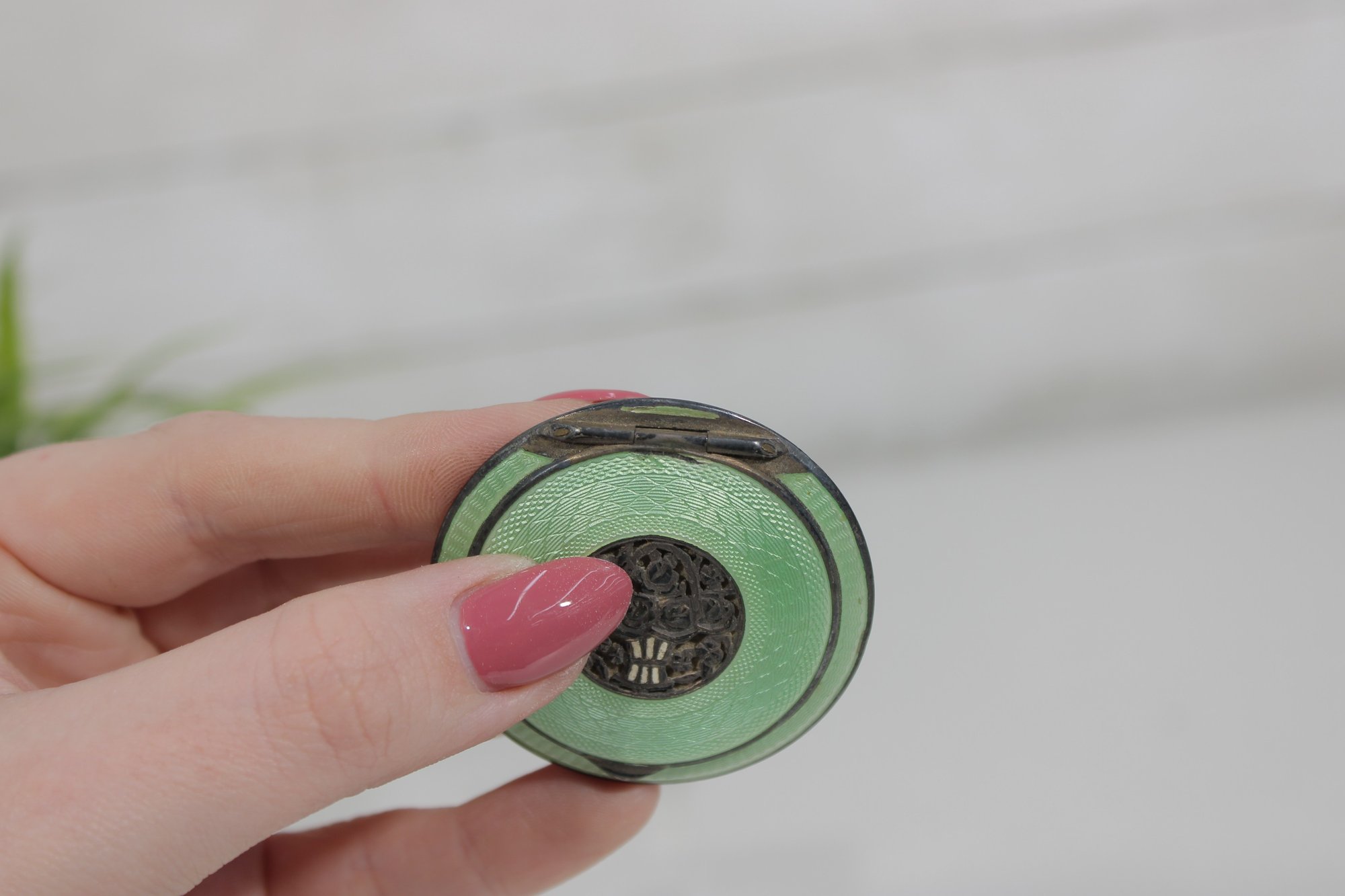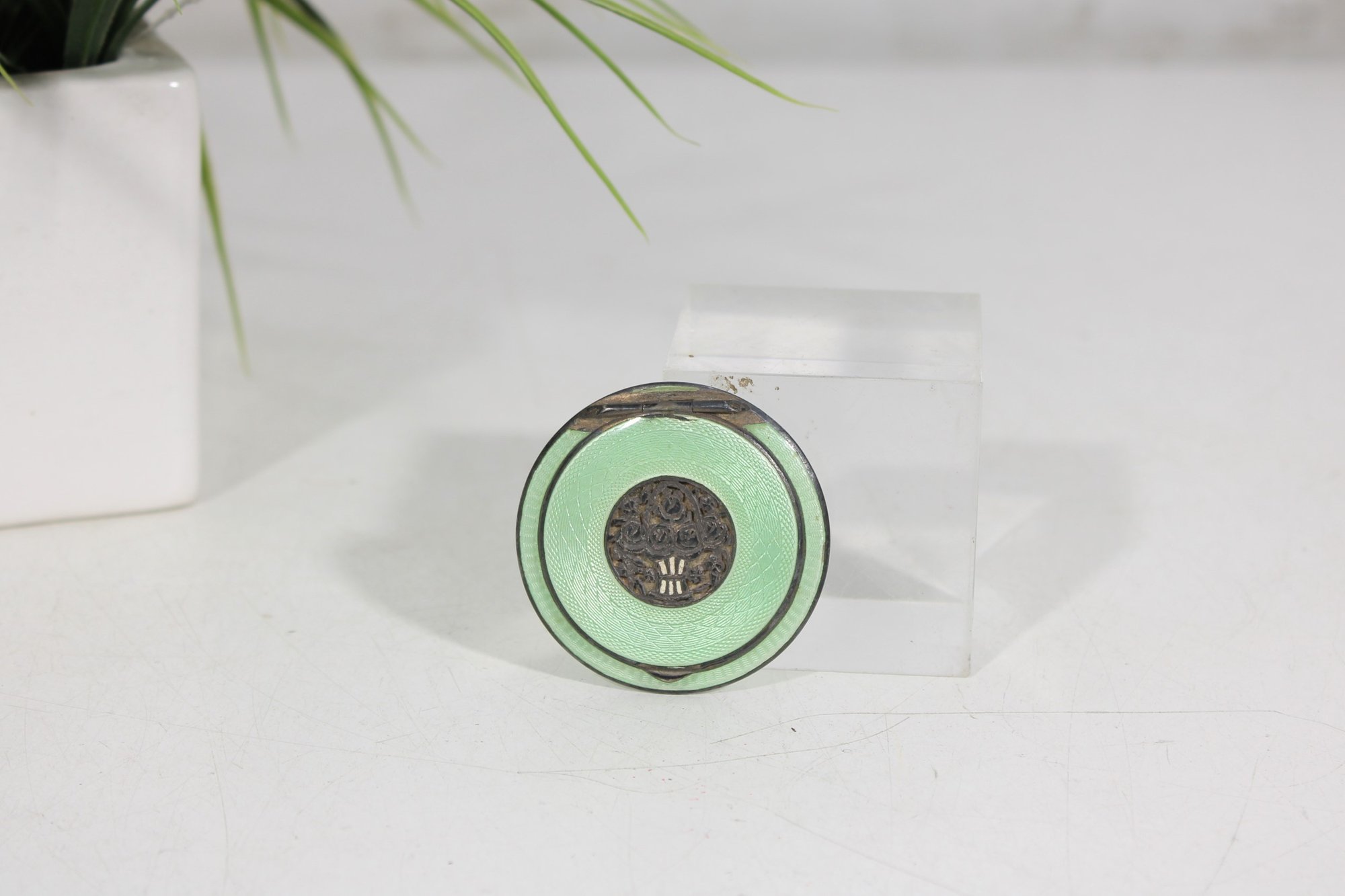 a charming vintage powder compact featuring a green guilloché enamel lid with a delicate engine-turned pattern. The center of the lid is accented with an ornate decorative metal medallion, adding a beautiful focal point and classic vintage character.