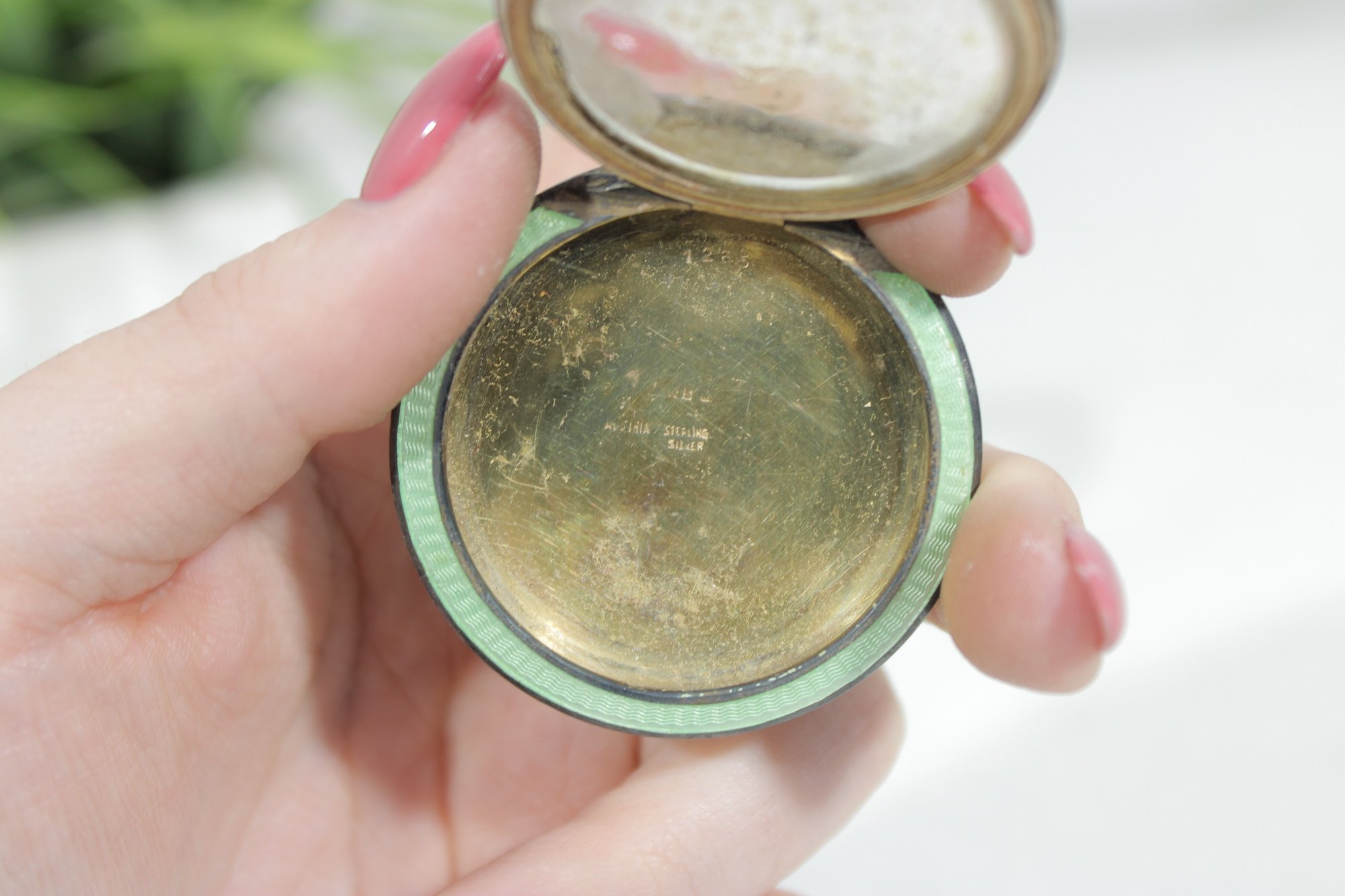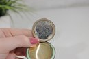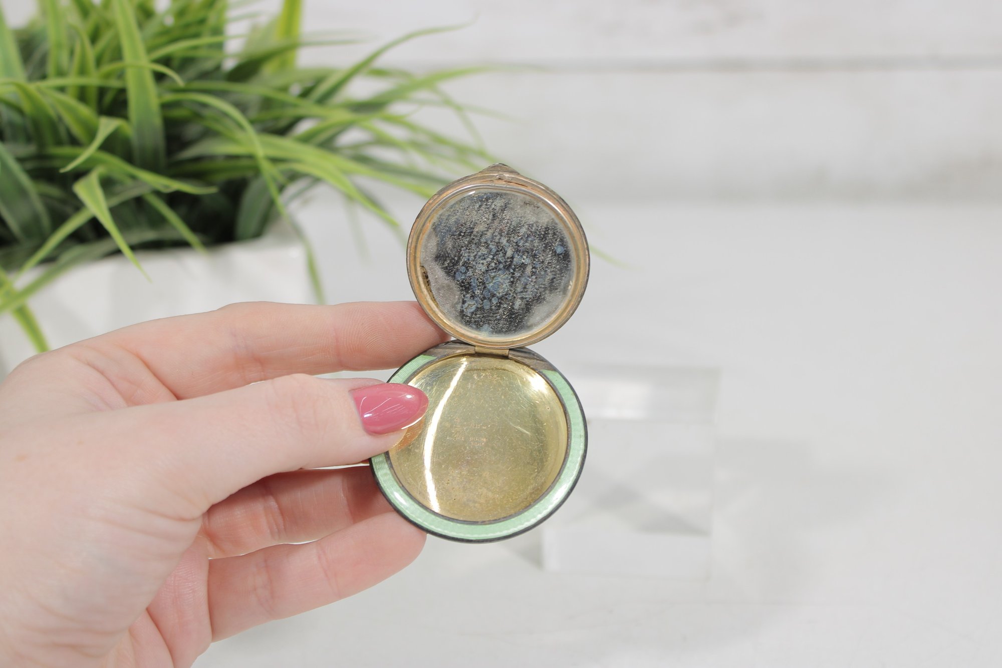 The compact opens to reveal a mirror and powder compartment, still showing traces of vintage powder. The combination of the soft green enamel and gold-tone interior gives this piece an elegant early to mid-20th century vanity style.