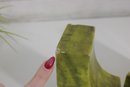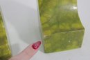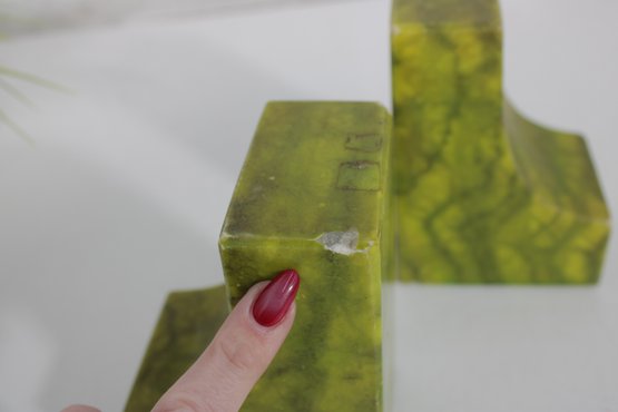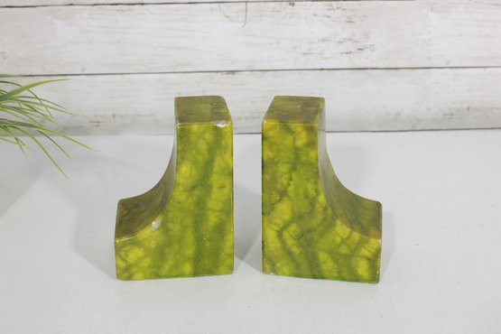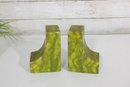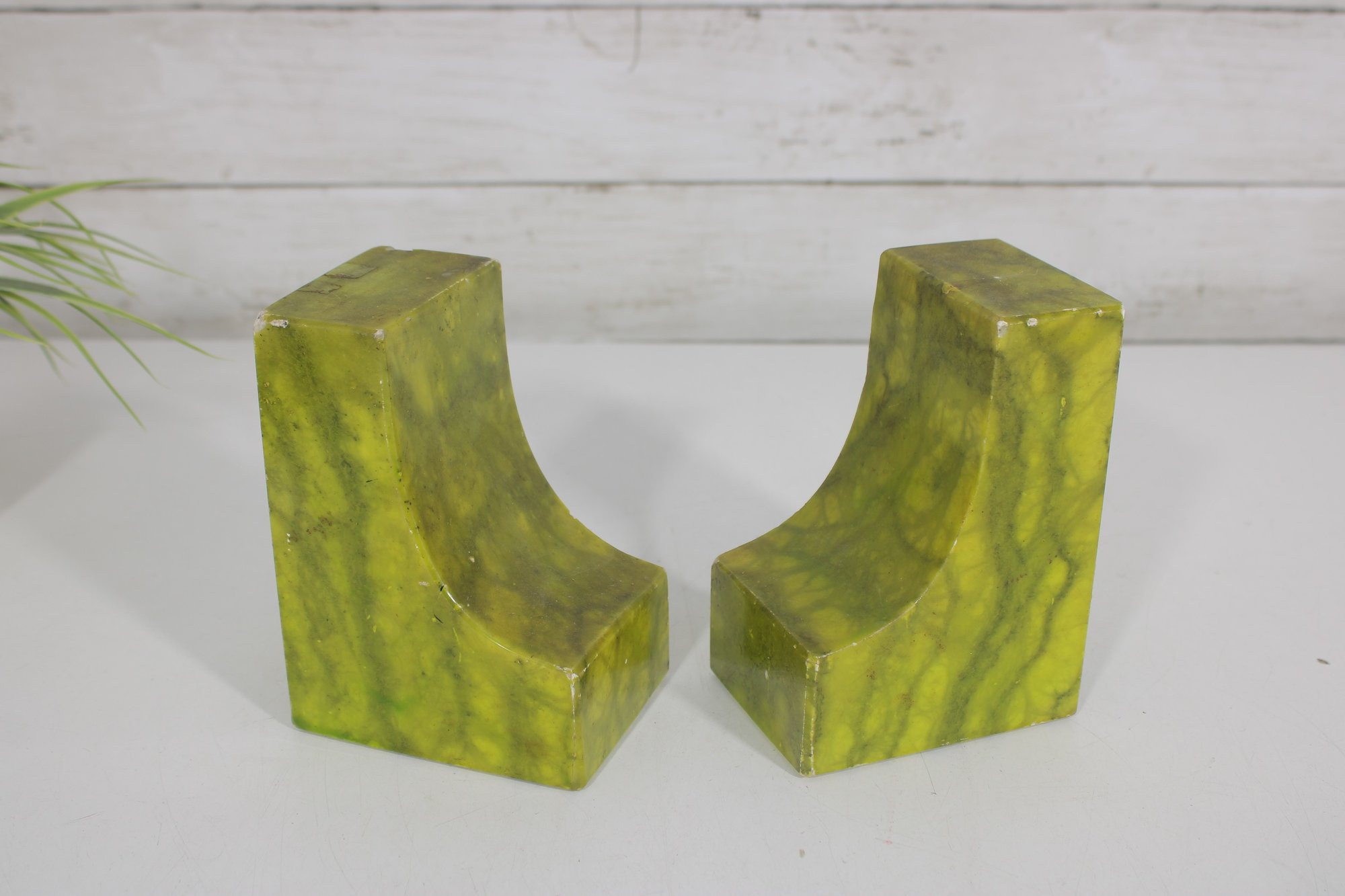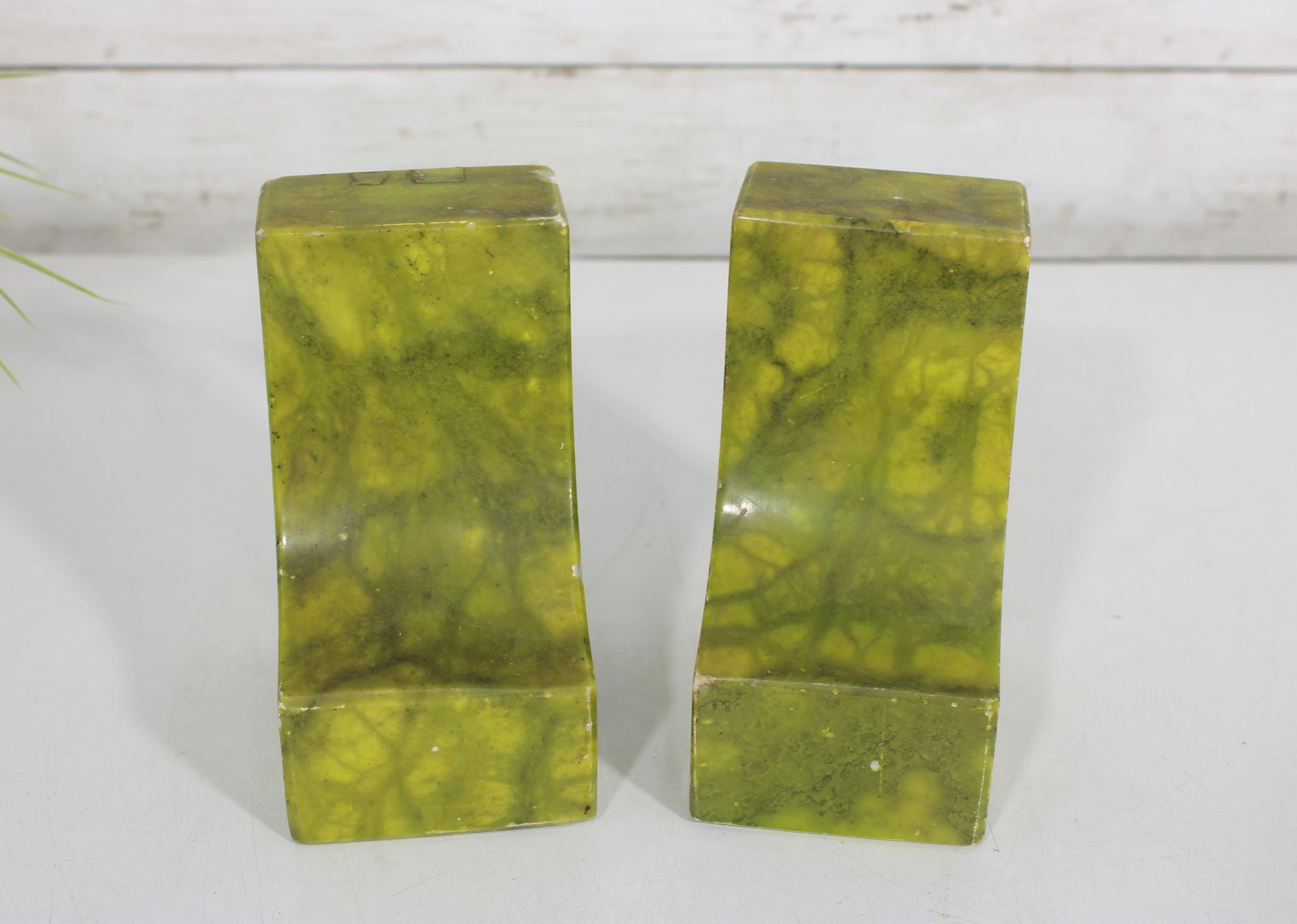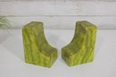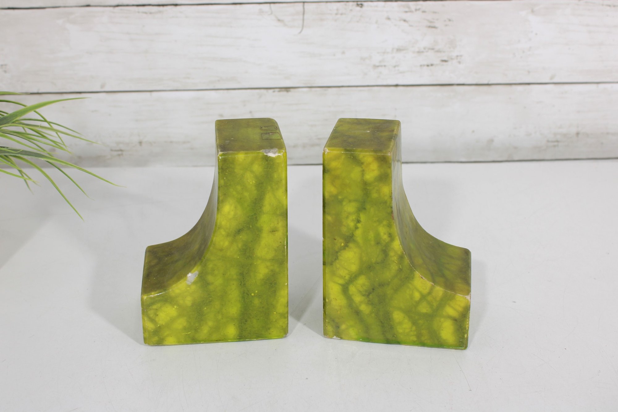pair of vintage green marble bookends featuring a bold, sculptural mid-century modern design. These solid stone bookends display a striking marbled pattern in vibrant green tones with natural veining throughout, making each piece unique.