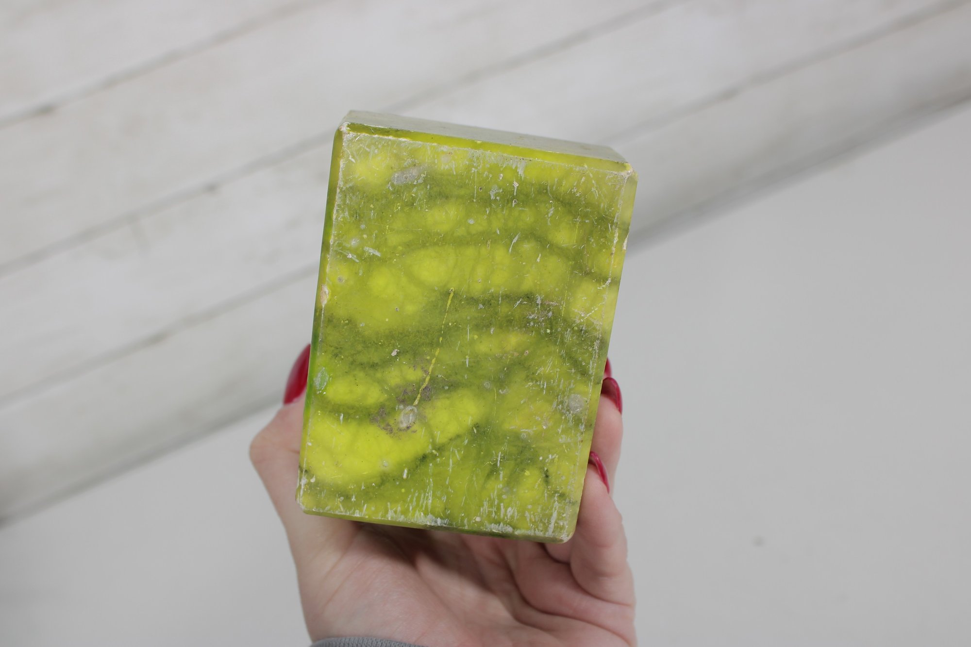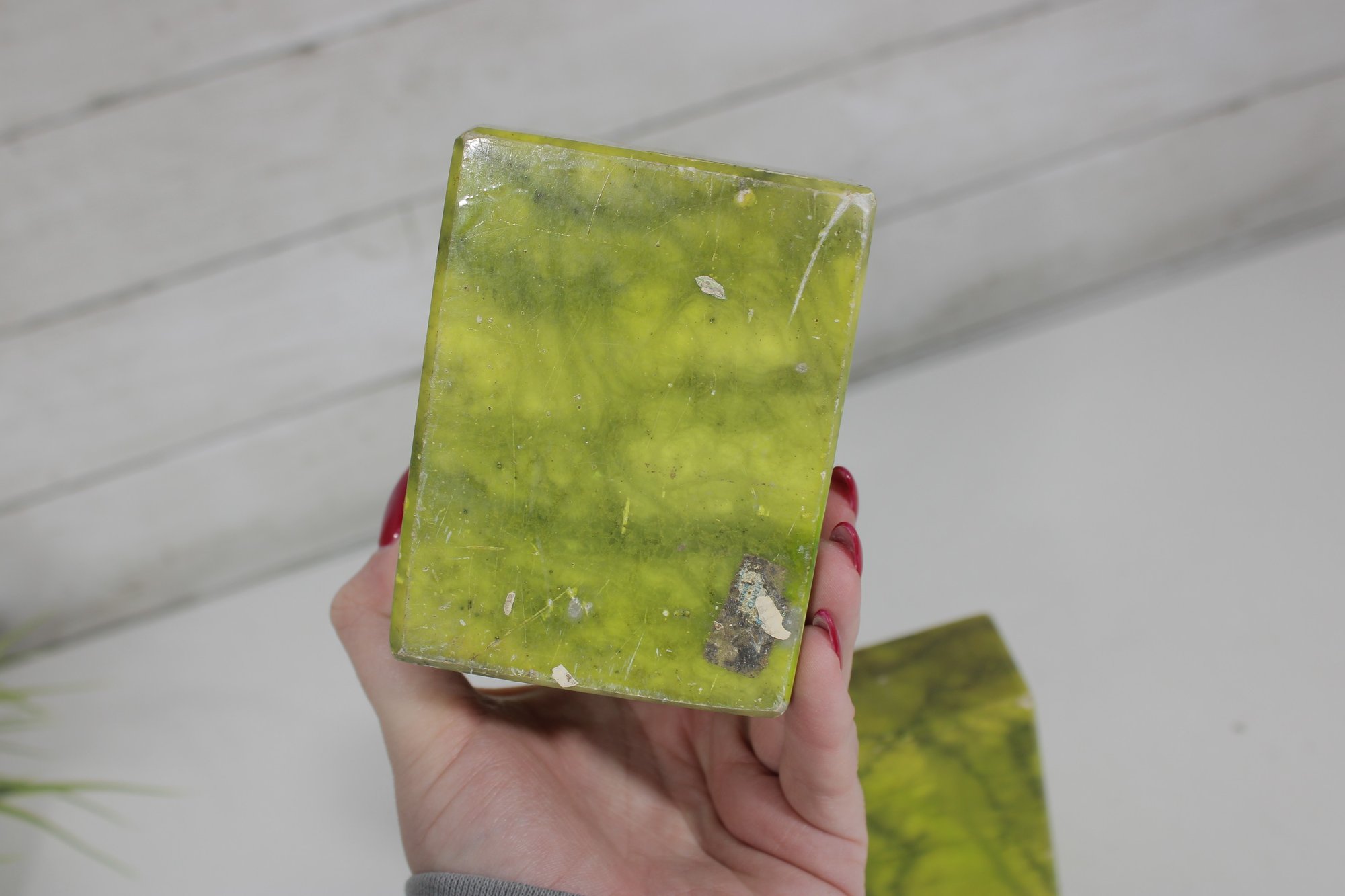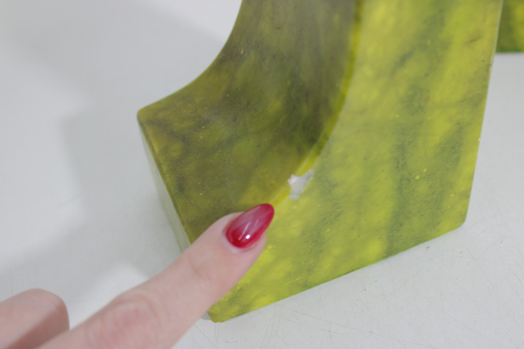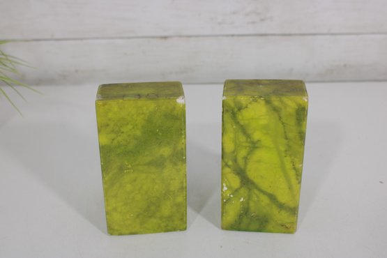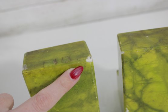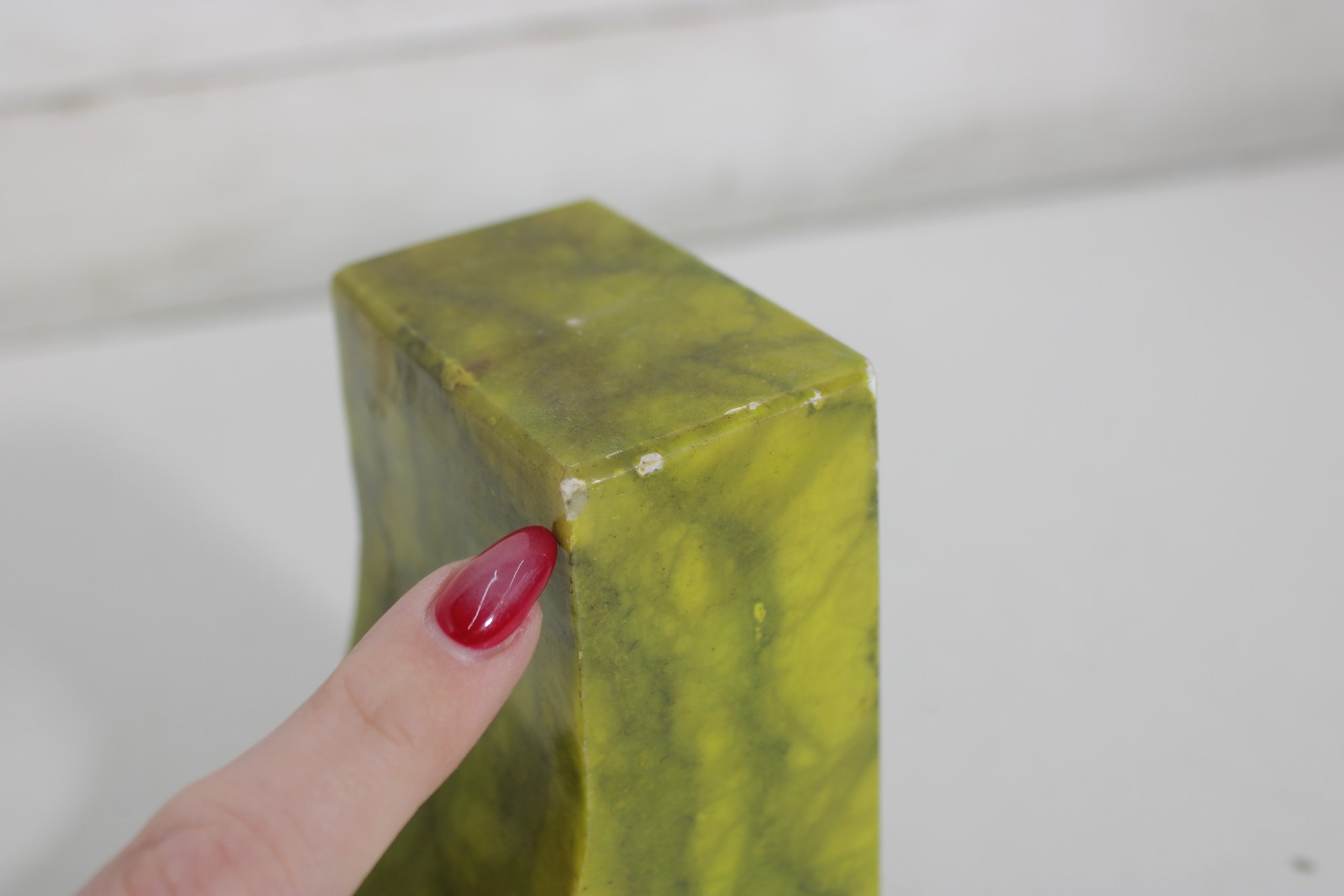 pair of vintage green marble bookends featuring a bold, sculptural mid-century modern design. These solid stone bookends display a striking marbled pattern in vibrant green tones with natural veining throughout, making each piece unique.