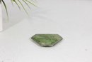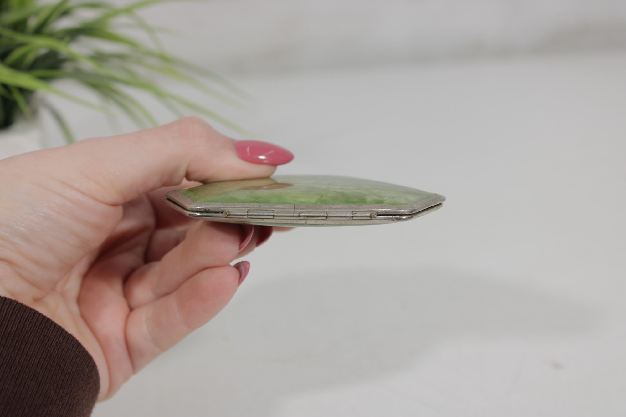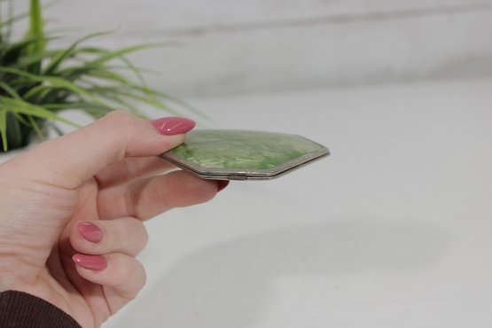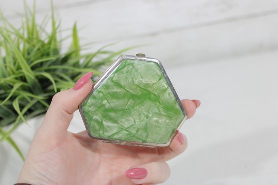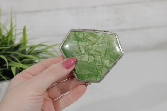 Stylish vintage powder compact featuring a distinctive green mottled enamel lid with an abstract stone-like pattern. The compact has a unique geometric multi-sided shape, giving it a classic mid-century vanity aesthetic.