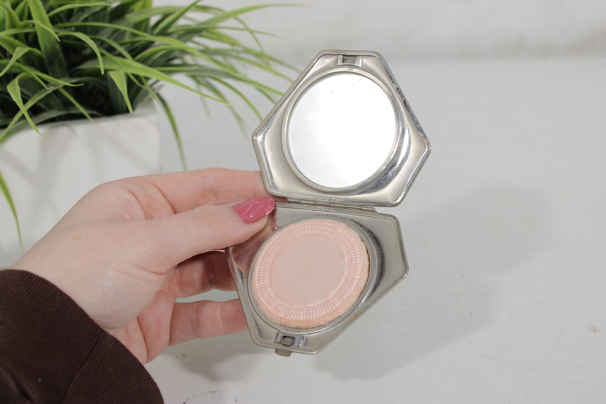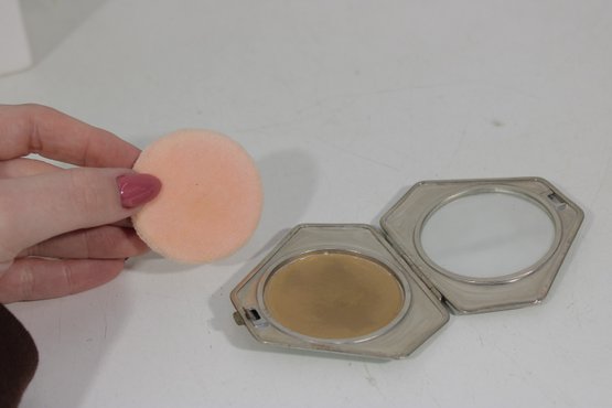 The compact opens to reveal a mirror inside the lid, along with the original powder compartment and powder puff. The interior has a gold-tone metal finish typical of vintage cosmetic compacts.