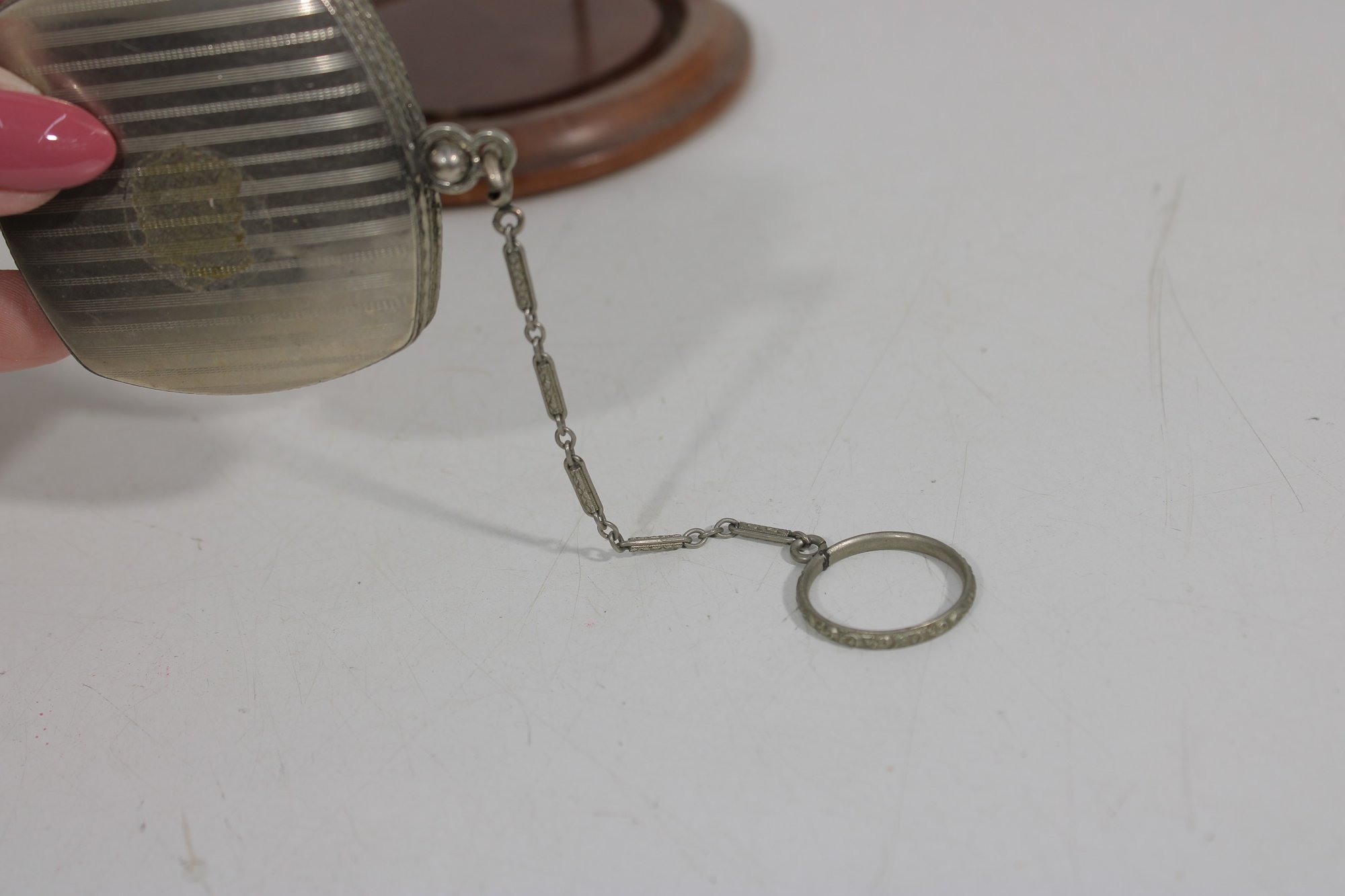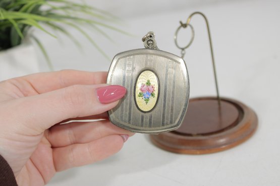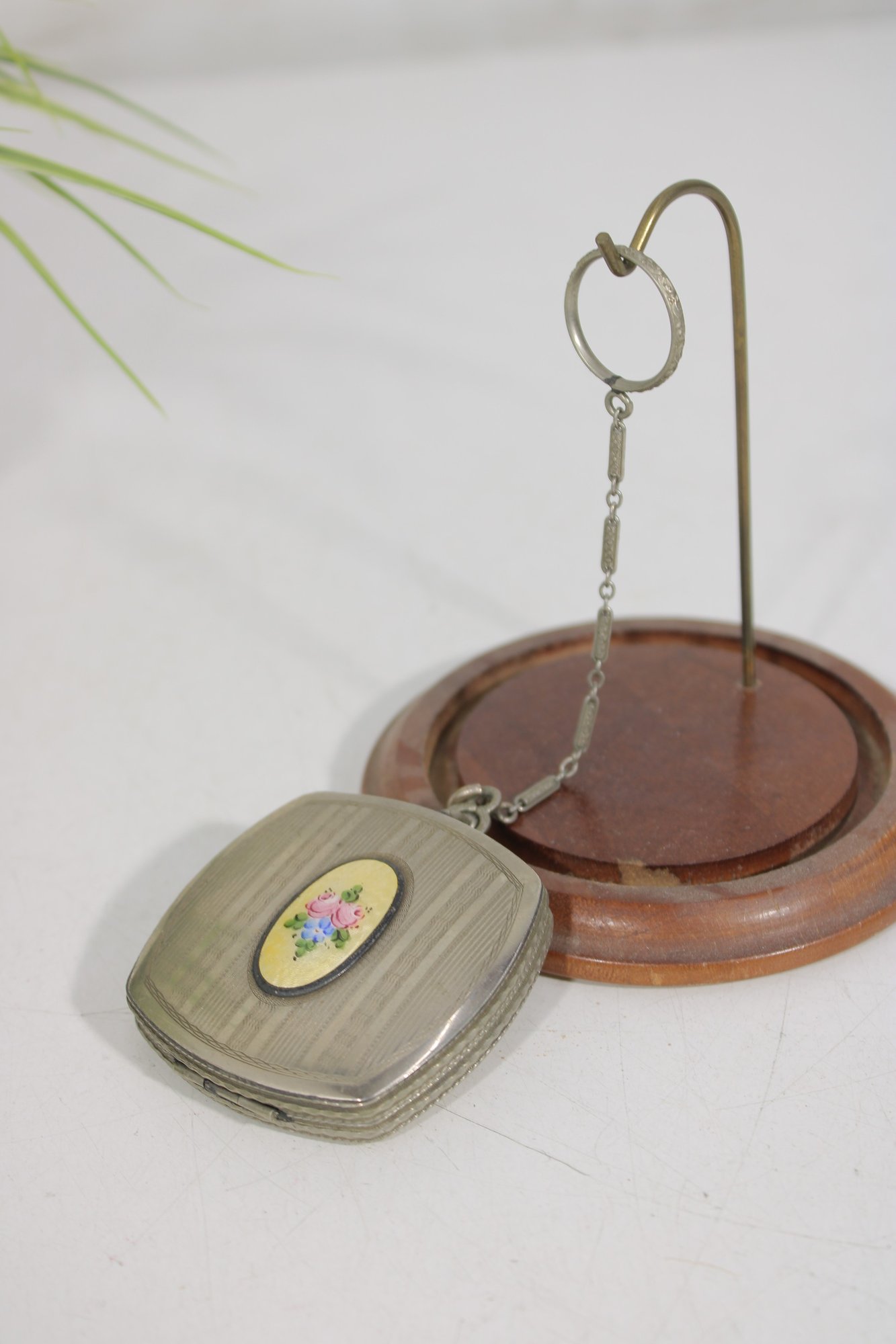 This compact features a silver-tone metal case with vertical engine-turned lines and a delicate oval guilloché enamel floral panel on the front. It is attached to a finger ring and small chain, making it both decorative and functional.