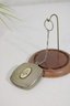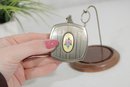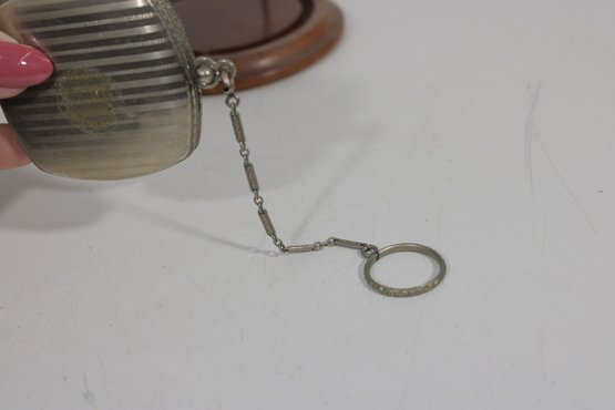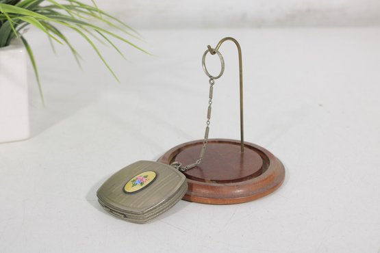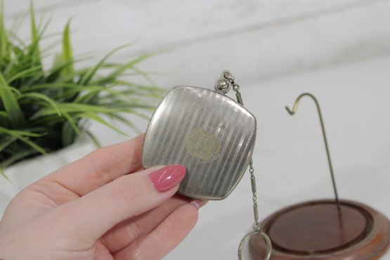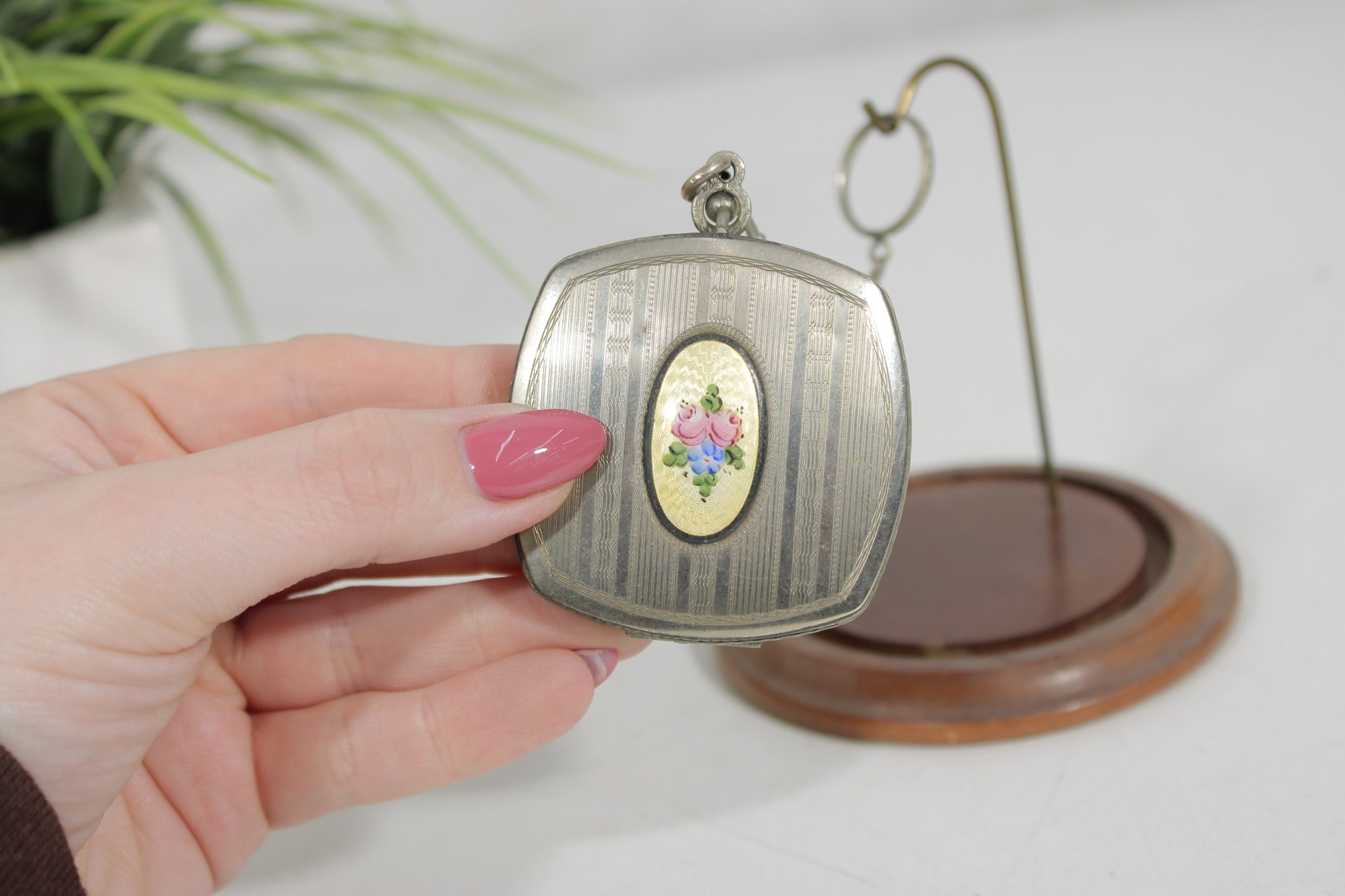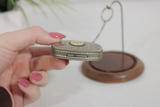a beautiful vintage finger ring dance compact, a charming accessory popular during the early to mid-20th century. These compact cases were designed to be worn on the finger while dancing, allowing ladies to easily carry powder and rouge for quick touch-ups.