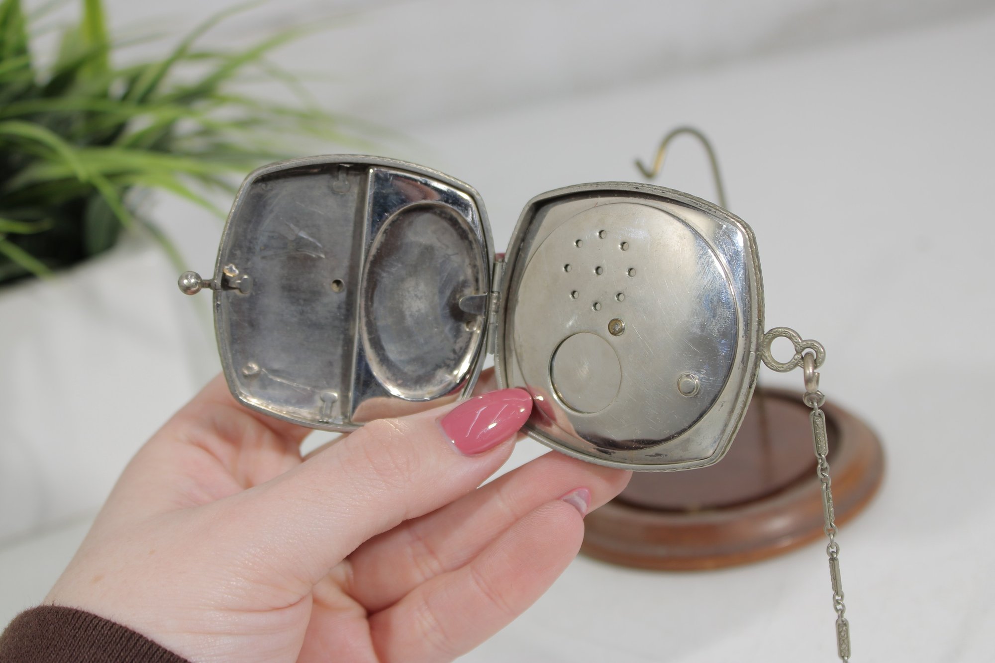 The compact opens to reveal a mirror on one side and compartments for powder and rouge, along with the original metal powder sifter. These “dance compacts” were fashionable accessories carried at formal events, balls, and evenings out.