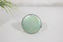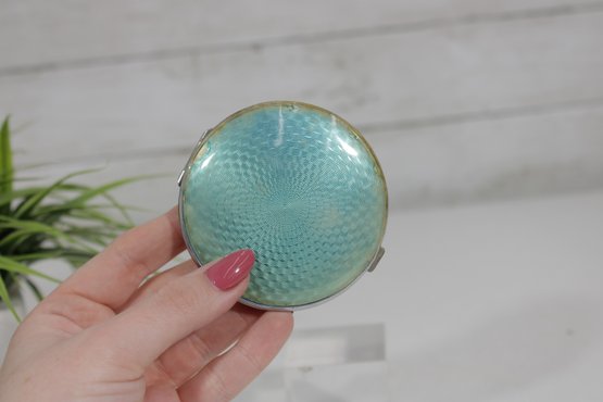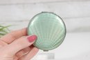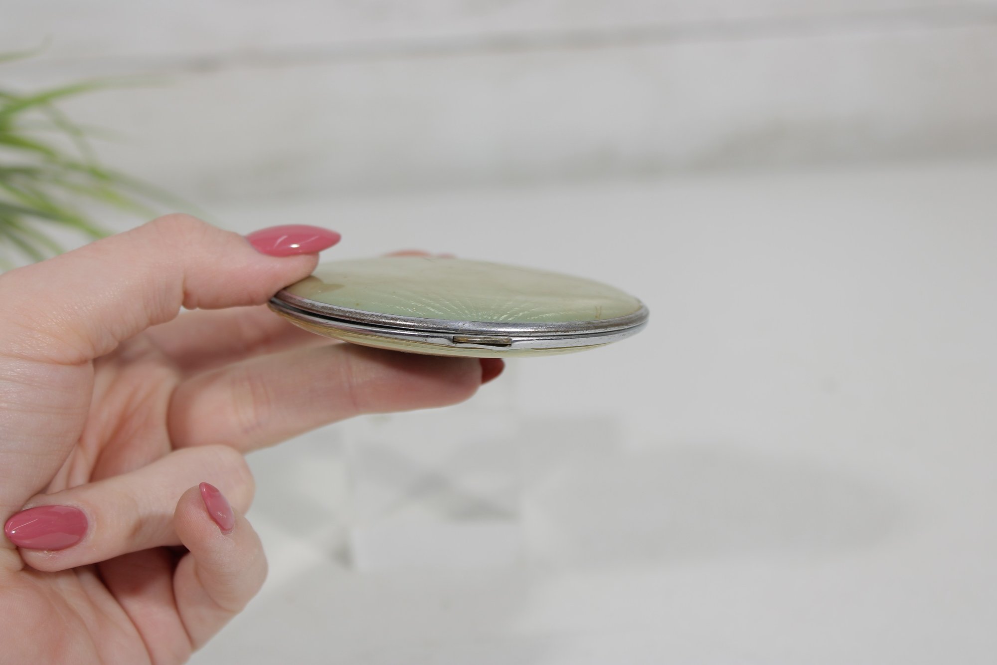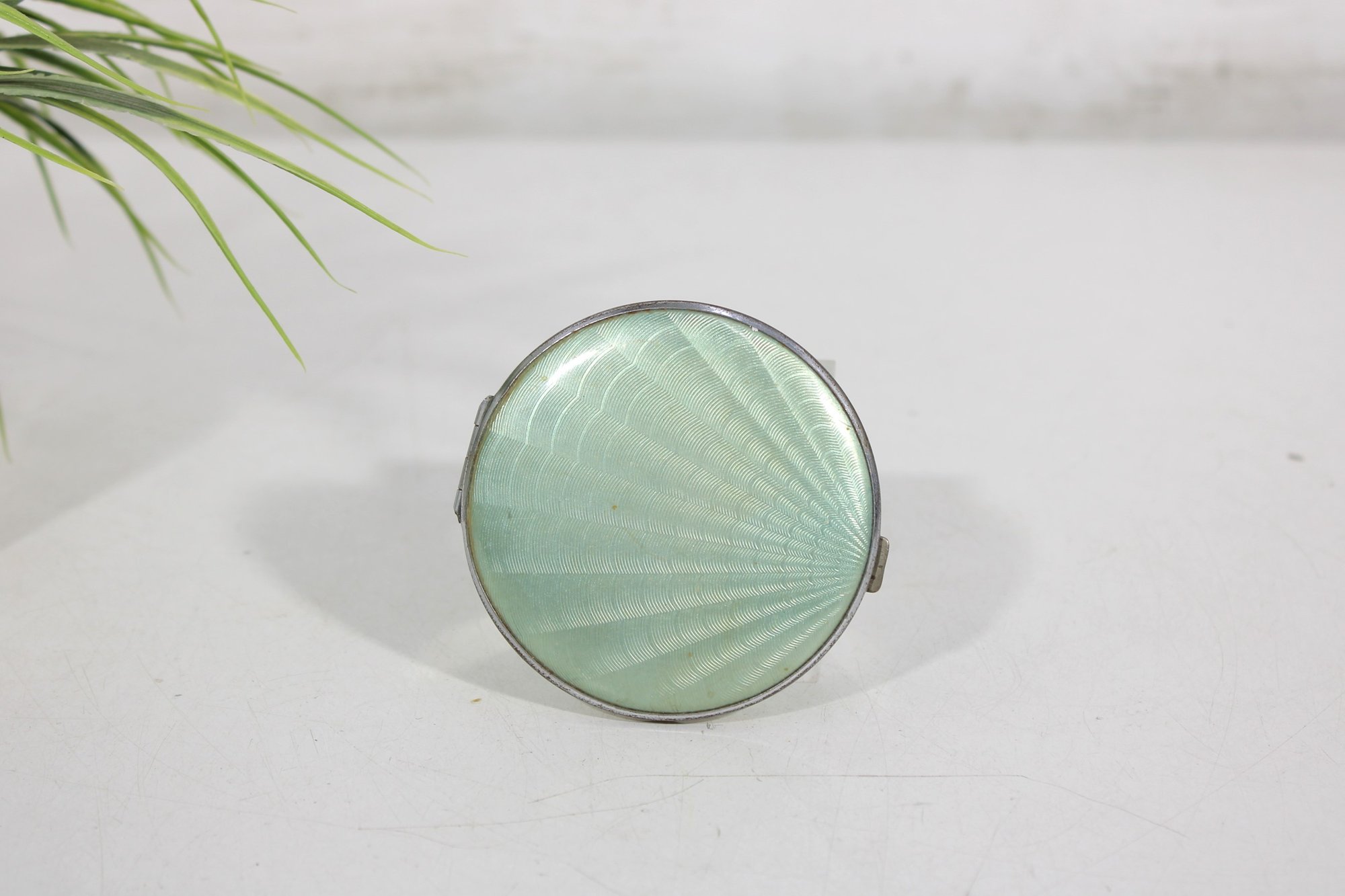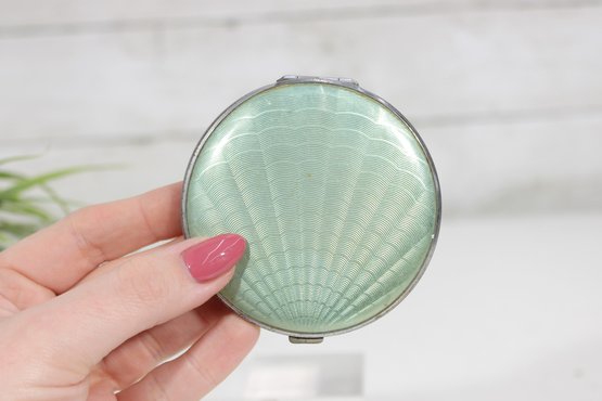 vintage round powder compact featuring a classic mint green guilloché enamel lid with a delicate radiating fan pattern. The compact is finished with a silver-tone metal frame, giving it an elegant mid-century vanity style.