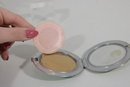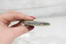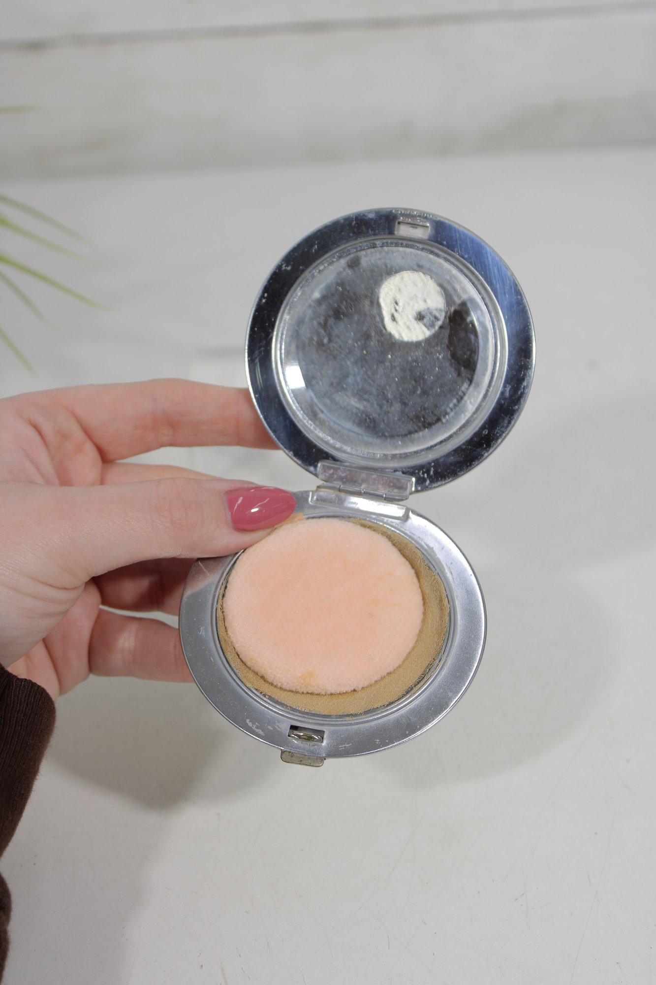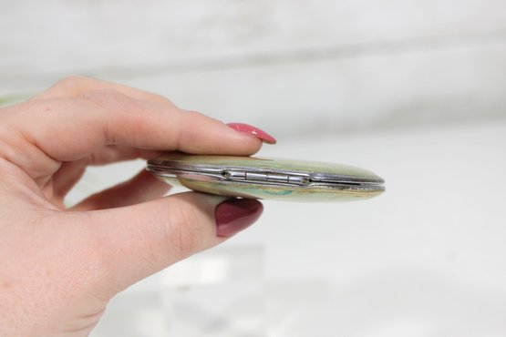 The compact opens to reveal an interior mirror and powder compartment, complete with its original powder puff and screen insert. Pieces like this were popular vanity accessories and are now highly collectible for their craftsmanship and timeless design.