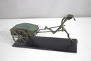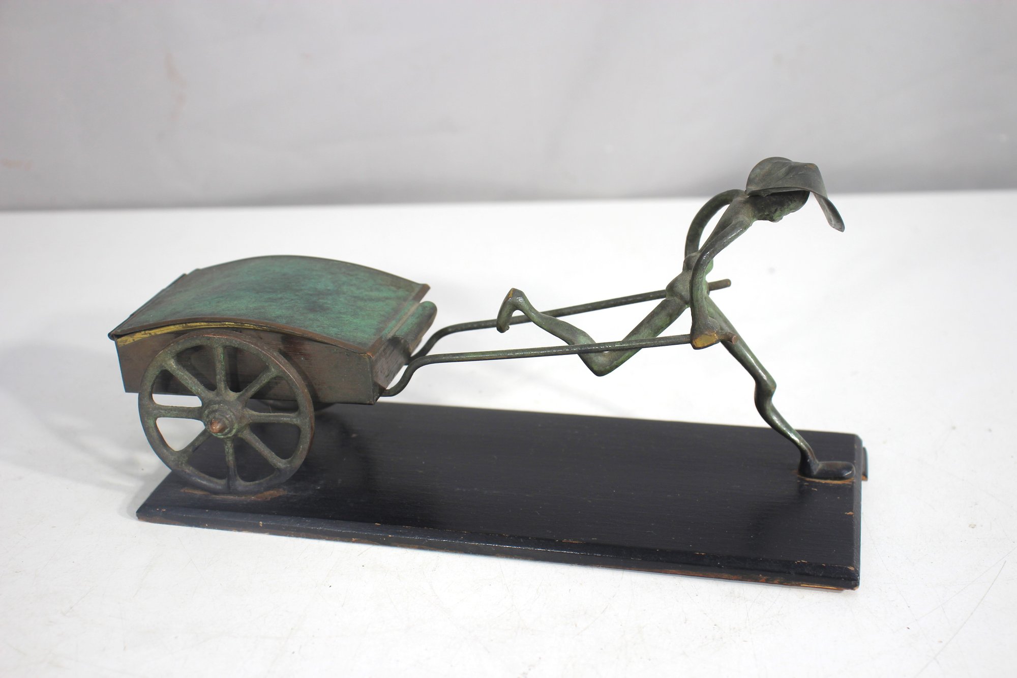 A unique HAKULI Israel bronze sculpture depicting a stylized man pulling a lidded cart, set on a black wood base. Features a beautiful patinated finish with an original foil label on the bottom. A striking Judaica or vintage Israel collectible.