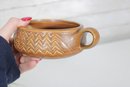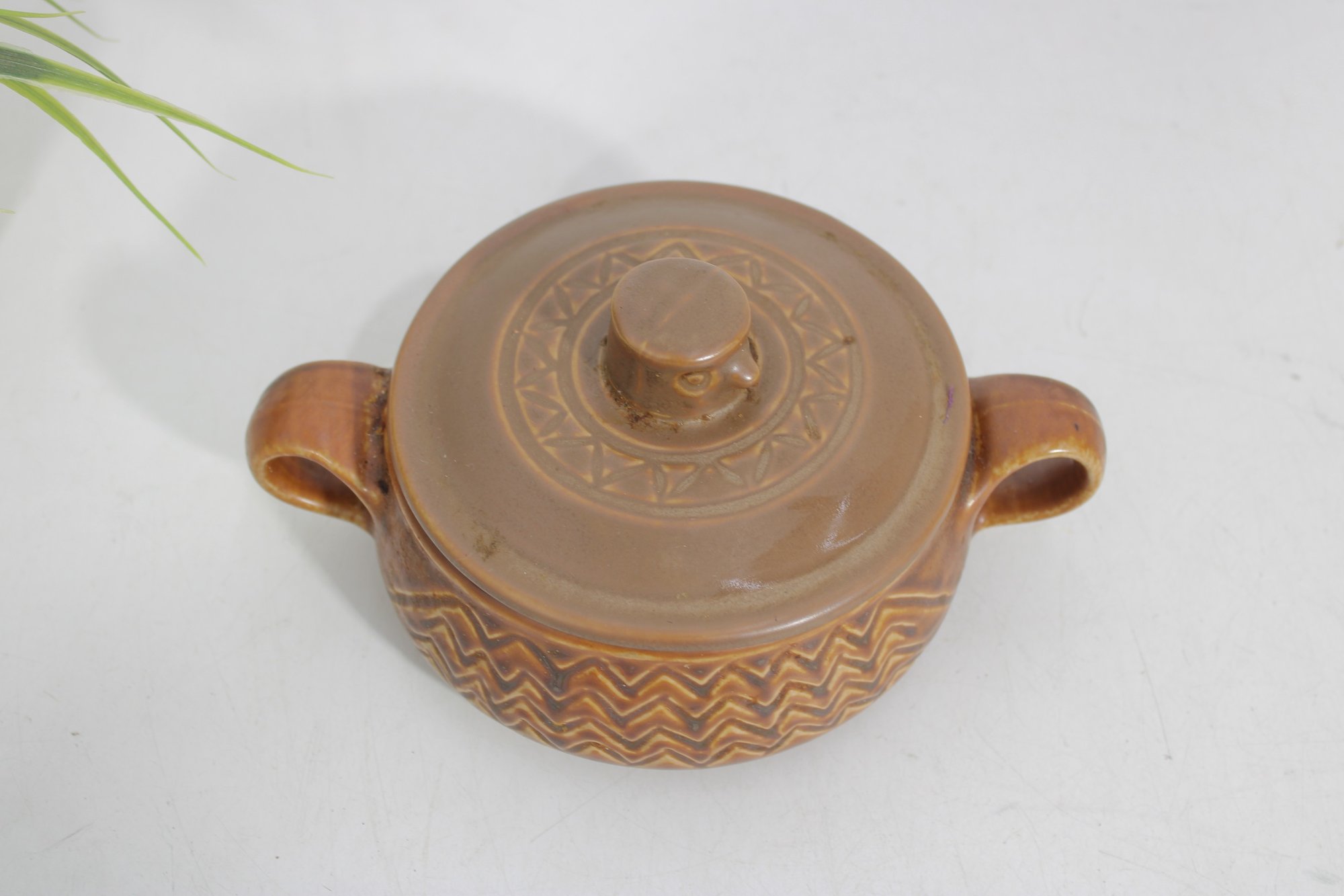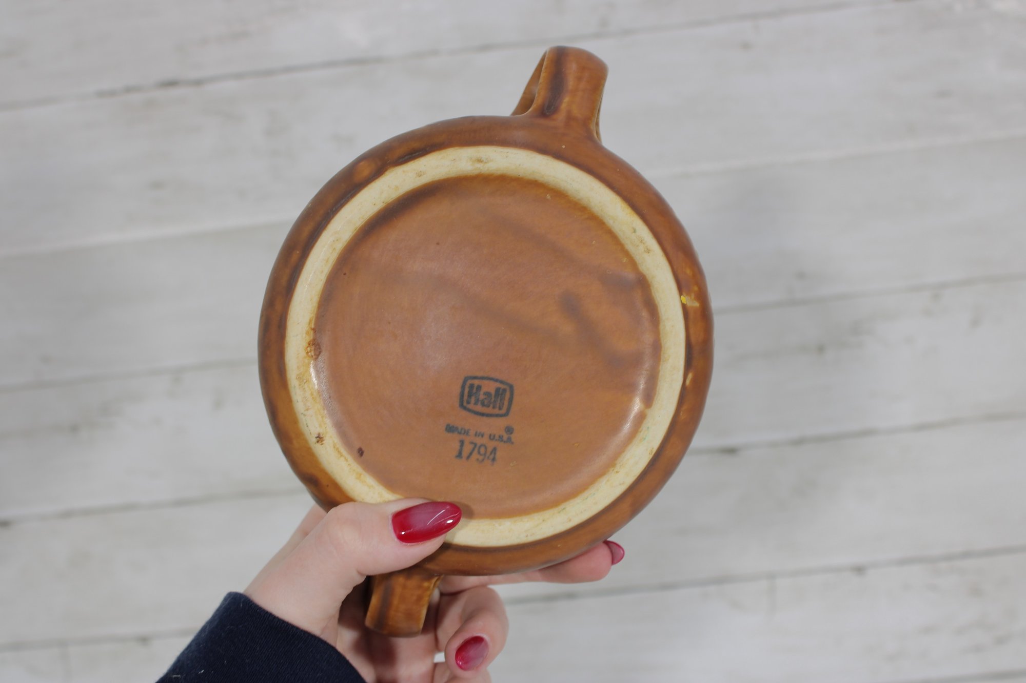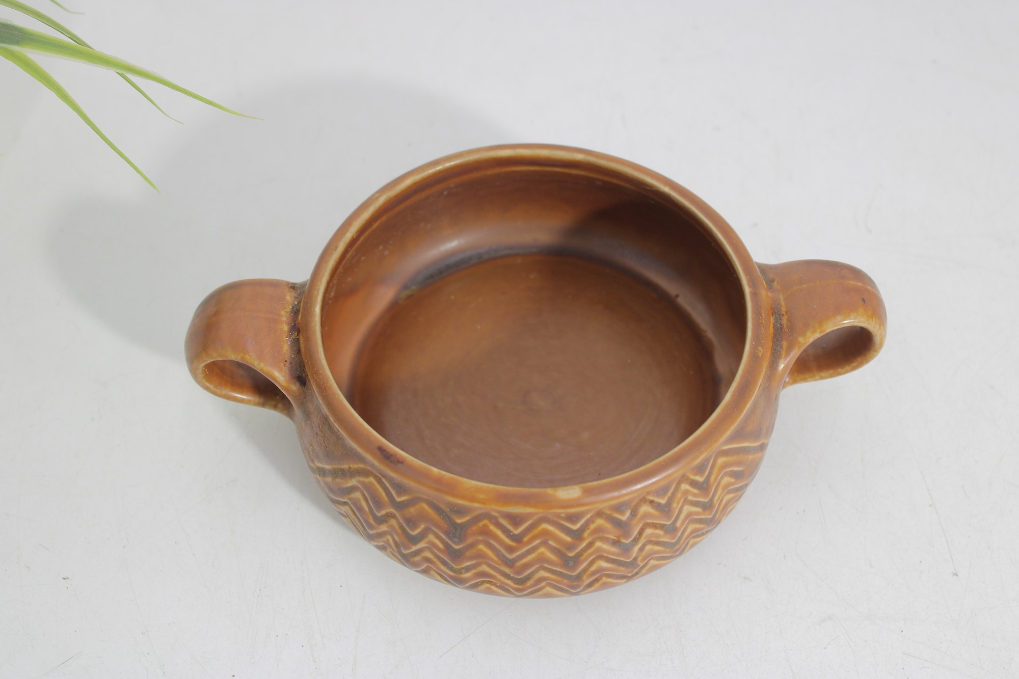 Measuring approximately 3.5 inches high (with lid) and 4.5 inches in diameter, this piece is perfect for individual servings, small sides, or as a decorative addition to a vintage kitchen collection. The rich earthy tones and textured pattern reflect classic mid-century American pottery design.