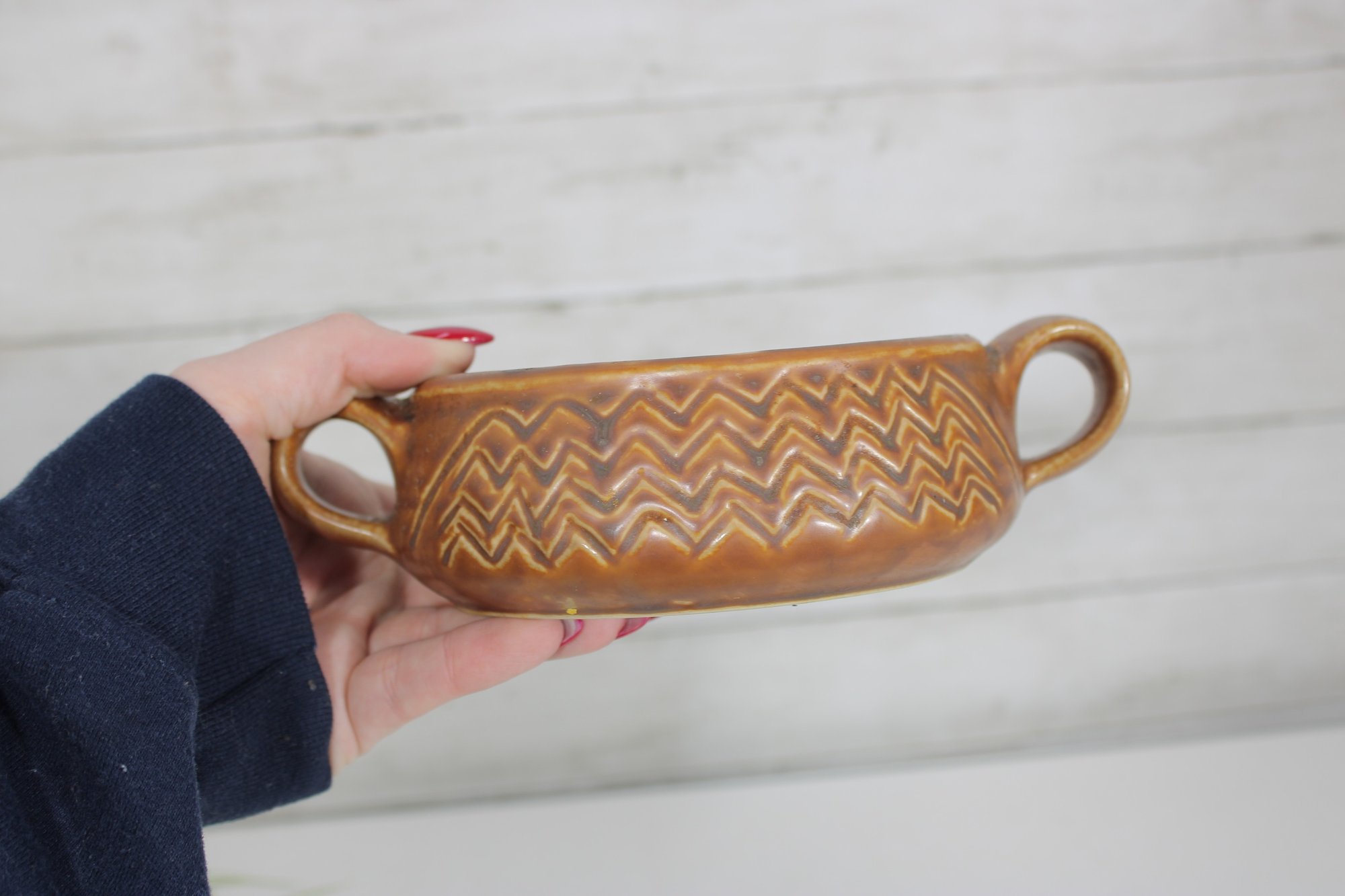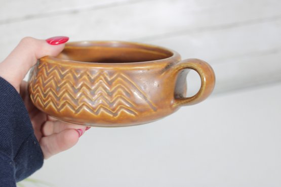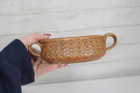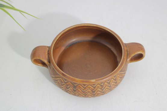 Charming vintage Hall Art Pottery covered dish featuring a warm brown glaze with an eye-catching zig-zag pattern around the body. This compact handled casserole dish includes a fitted lid and dual side handles for easy serving.