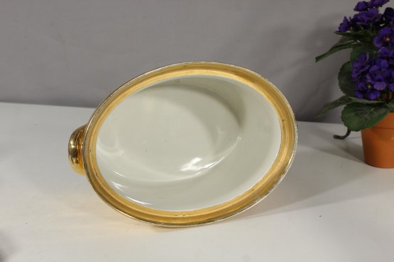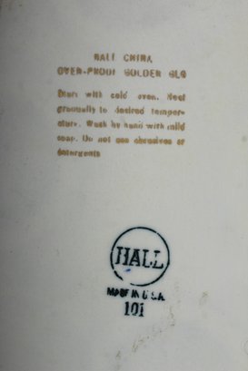 This is a beautifully preserved vintage Hall China oval casserole dish in a striking gold finish, complete with its original lid. The interior is finished with a pristine white glaze, making it both functional and elegant for display or use. Stamped "HALL MADE IN USA," this piece exudes classic craftsmanship and timeless style. The dish is ovenproof and features instructions on the base, adding to its collectible appeal. A must-have for collectors of vintage cookware or as a stunning addition to your tableware.