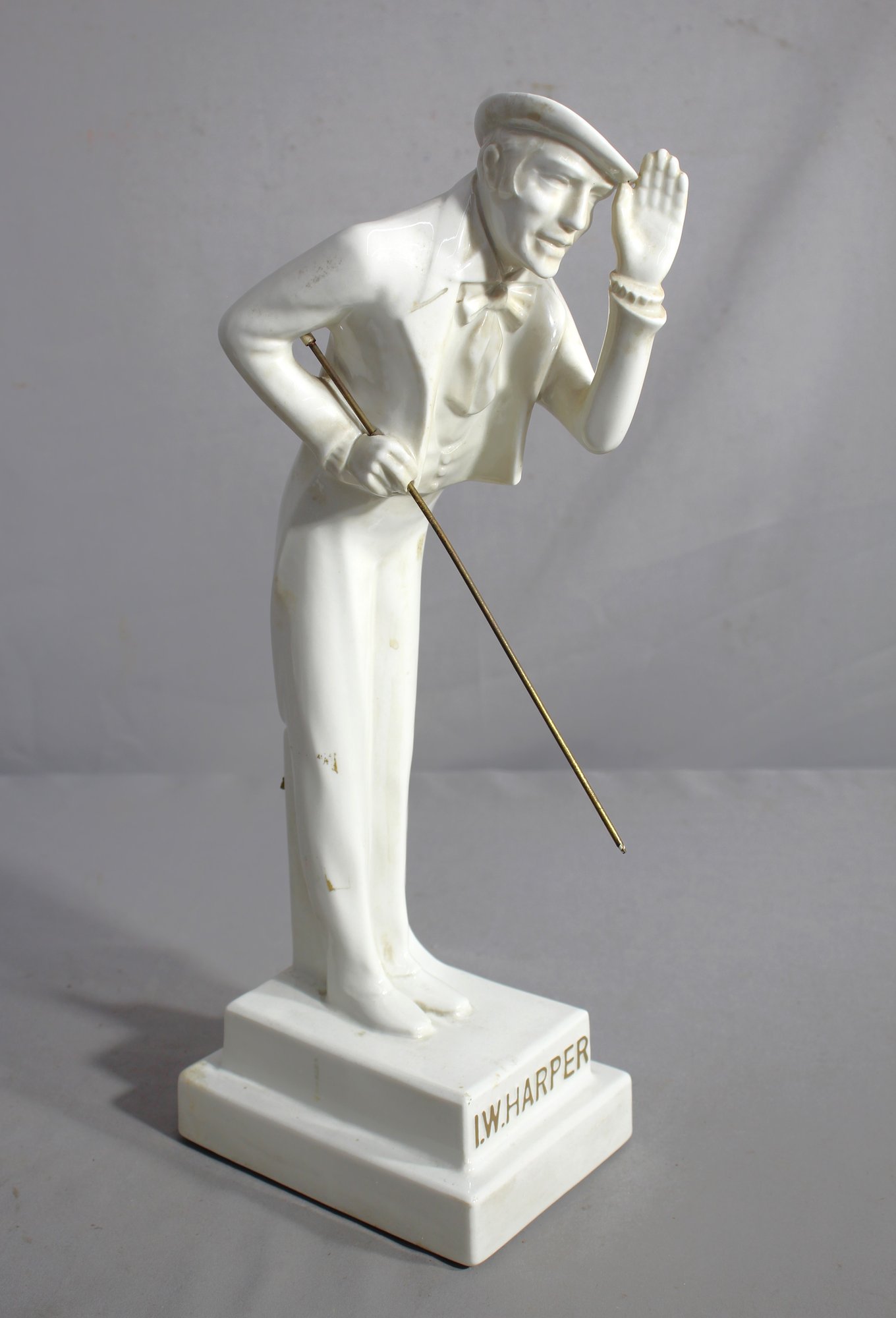 Crafted from high-quality porcelain, this decanter stands as a testament to the intricate artistry of Hall China. It boasts a glossy white finish that highlights the figure's debonair posture and attire. However, it should be noted that this collectible is not in mint condition, as it presents with the top hat missing a portion,