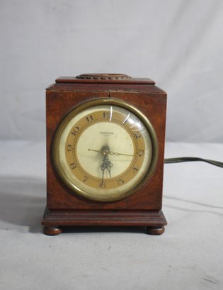 This charming Hammond mantel clock is a nostalgic nod to early 20th-century design. Encased in a rich burl wood finish that exudes a warm, vintage aesthetic, this clock is a testament to the era's craftsmanship and attention to detail. The classic cream-colored face is complemented by bold black numerals and delicate hands, protected by a clear glass covering. This electric clock, with its original cord-which need to be replace