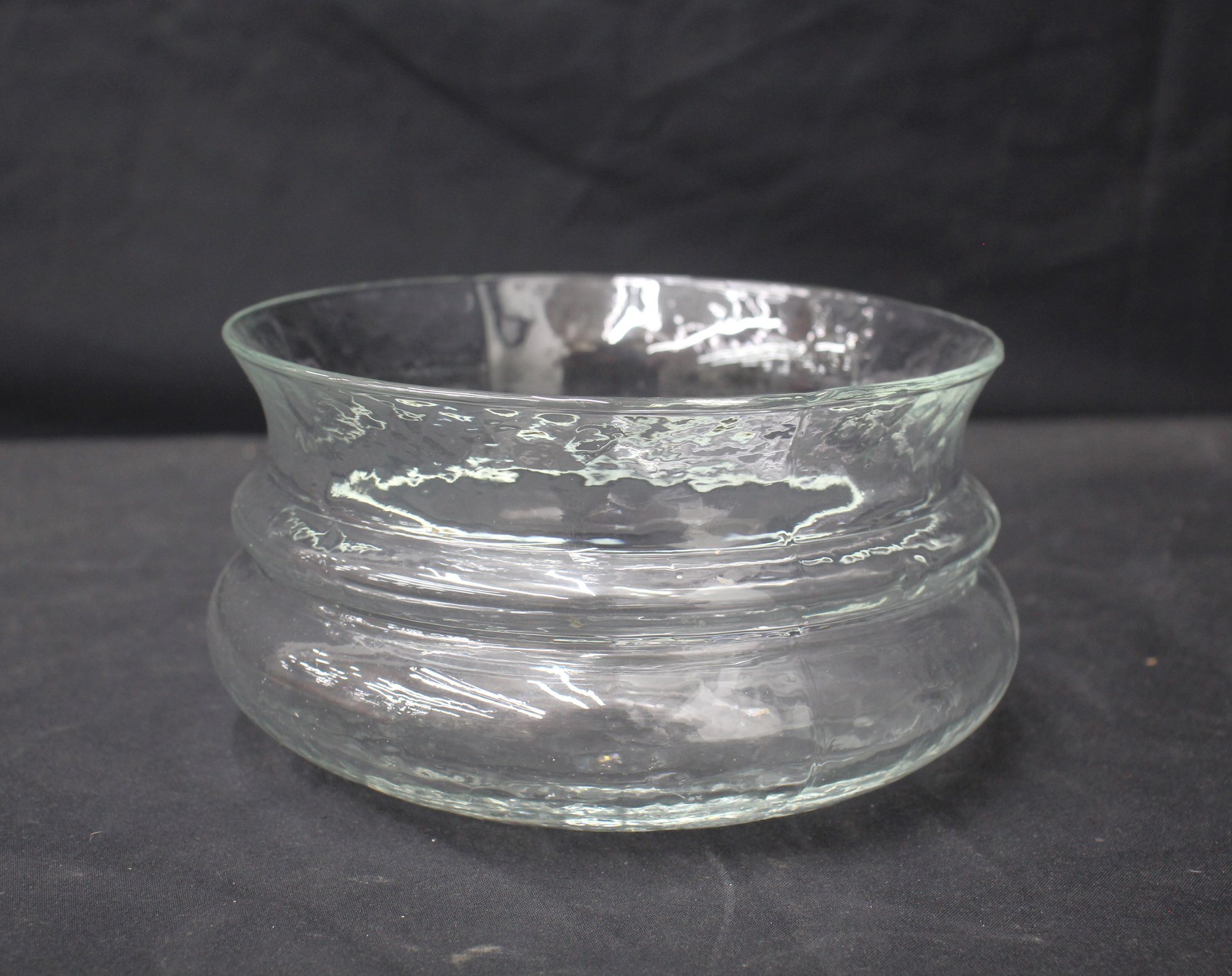 The glass has subtle natural variations and bubbles characteristic of hand-blown glass, adding to its uniqueness and vintage appeal. This bowl would make a lovely addition to any glassware collection or serve as a beautiful accent in any room.