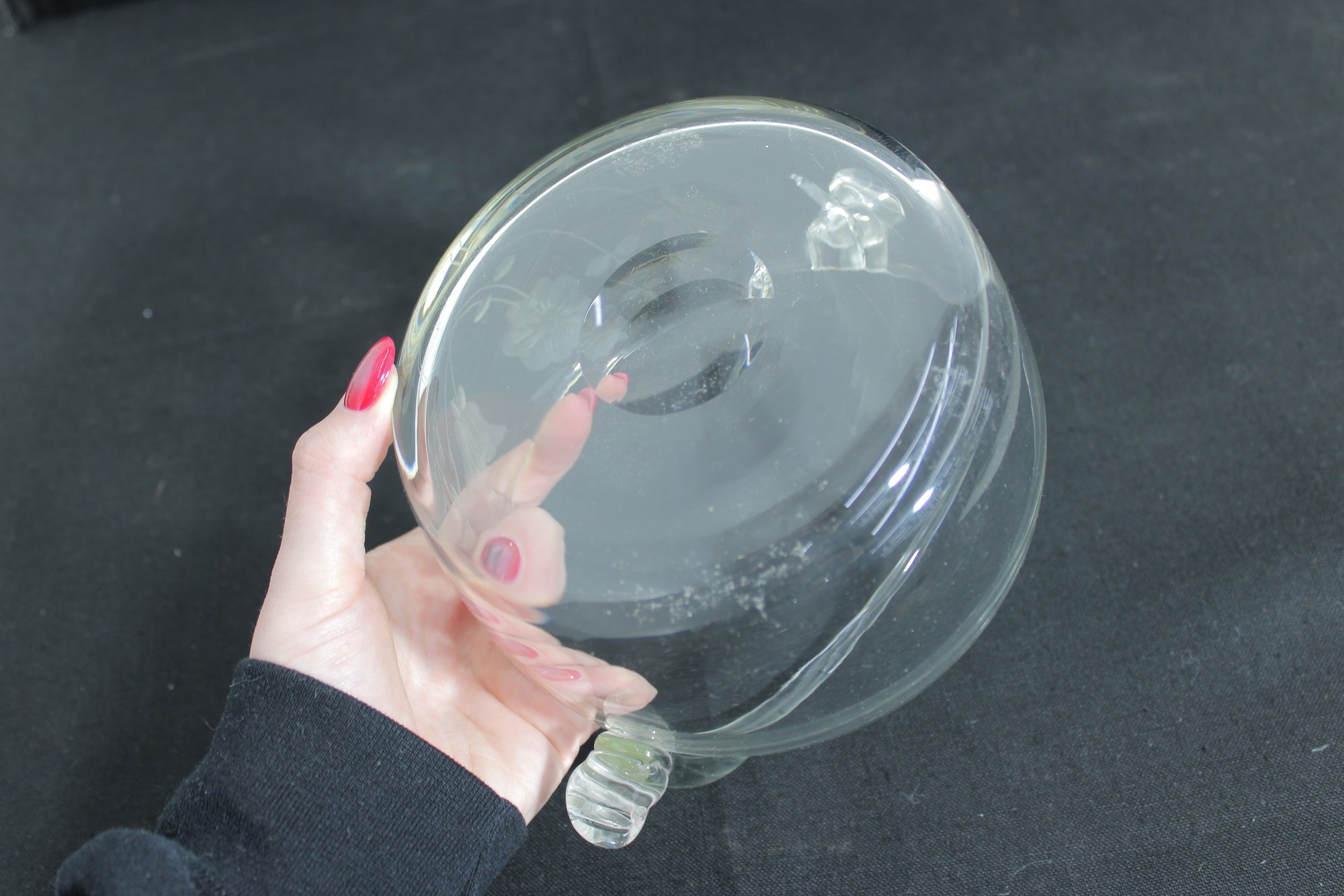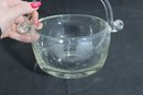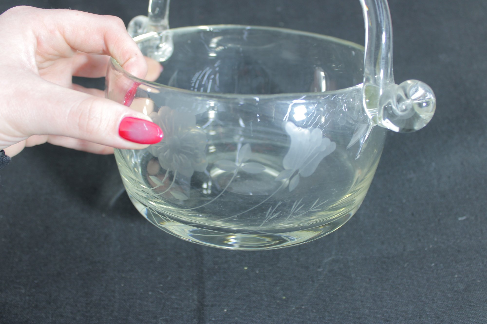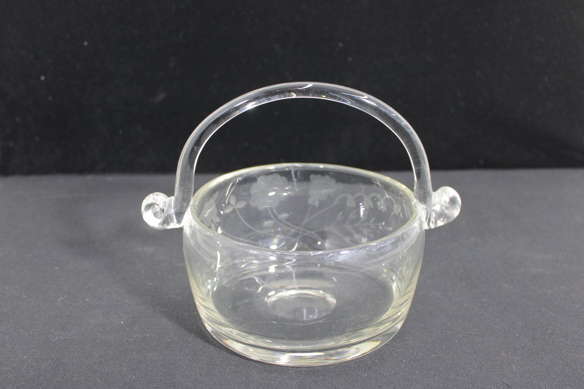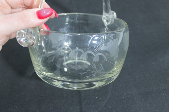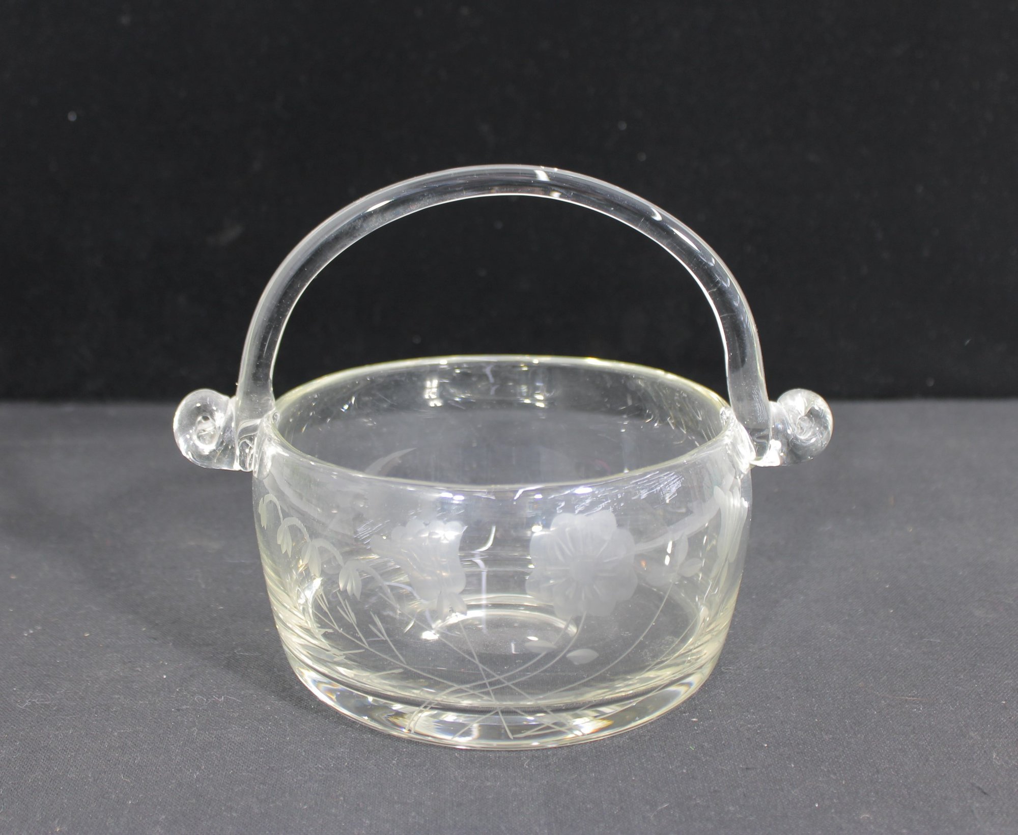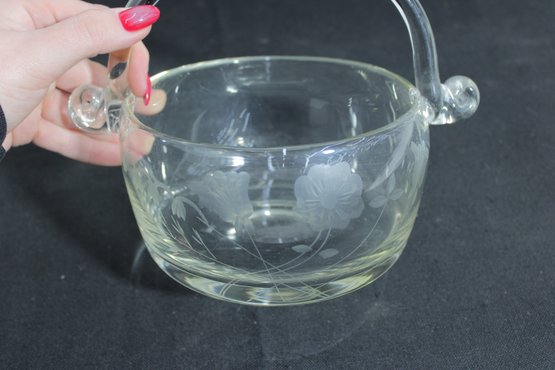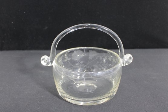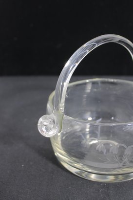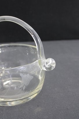 hand-blown crystal basket bowl featuring a graceful arched handle and finely detailed wheel-cut floral design. The clear glass body is decorated with delicate etched blossoms, giving the piece a refined and timeless appearance.