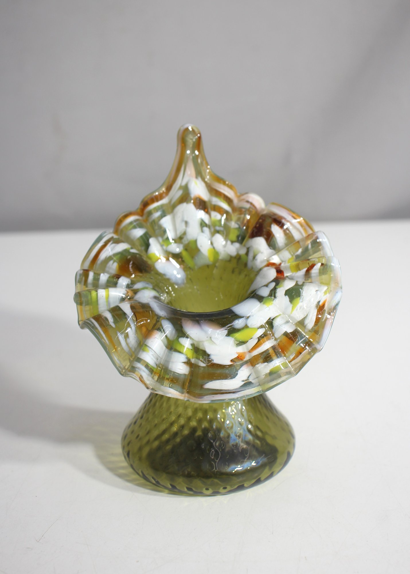 This stunning vintage Czech Art Deco Jack-in-the-Pulpit vase, dating to circa 1930, features classic End of Day glass craftsmanship with an earthy green base and a striking multicolor ruffled rim. The pulled and flared rim showcases swirls of white, amber, and brown, creating a unique marbled effect that makes each piece one-of-a-kind.