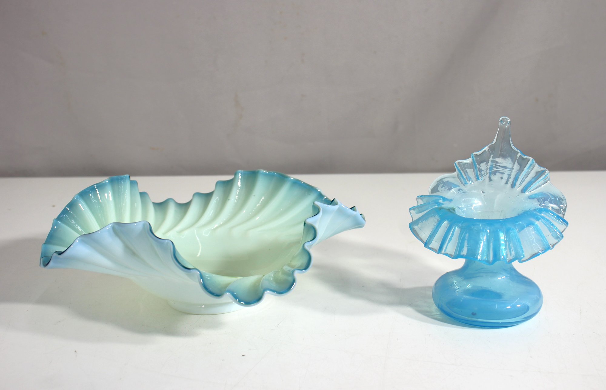 This beautiful vintage hand-blown glass set includes a large cased glass ruffle bowl and a matching Jack-in-the-Pulpit vase, both in soft green with a delicate blue opalescent edge. The flowing ruffled design and subtle color transitions make these stunning examples of early 20th-century glass artistry.