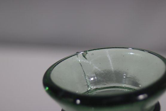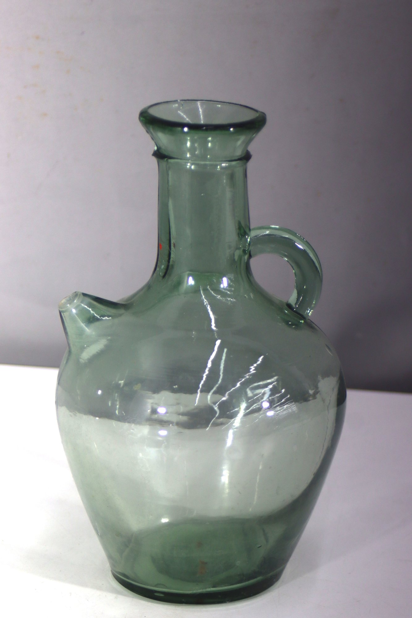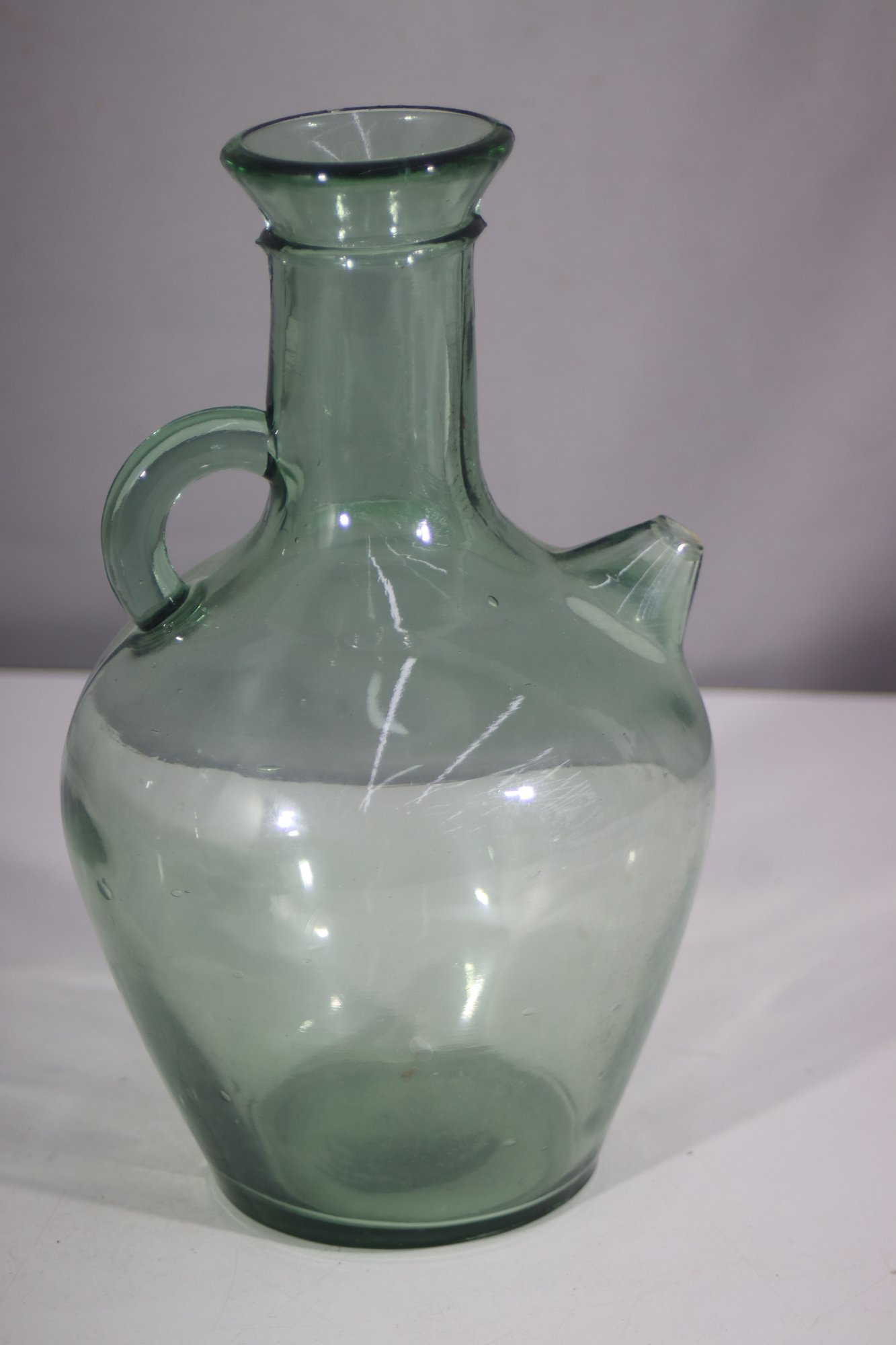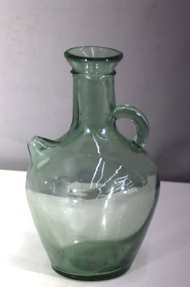 This vintage hand-blown green glass jug is a charming and rustic piece, featuring a rounded body, small side handle, and a classic spout. Its subtle imperfections and natural air bubbles add to its antique appeal, making it perfect for collectors or as a decorative accent.