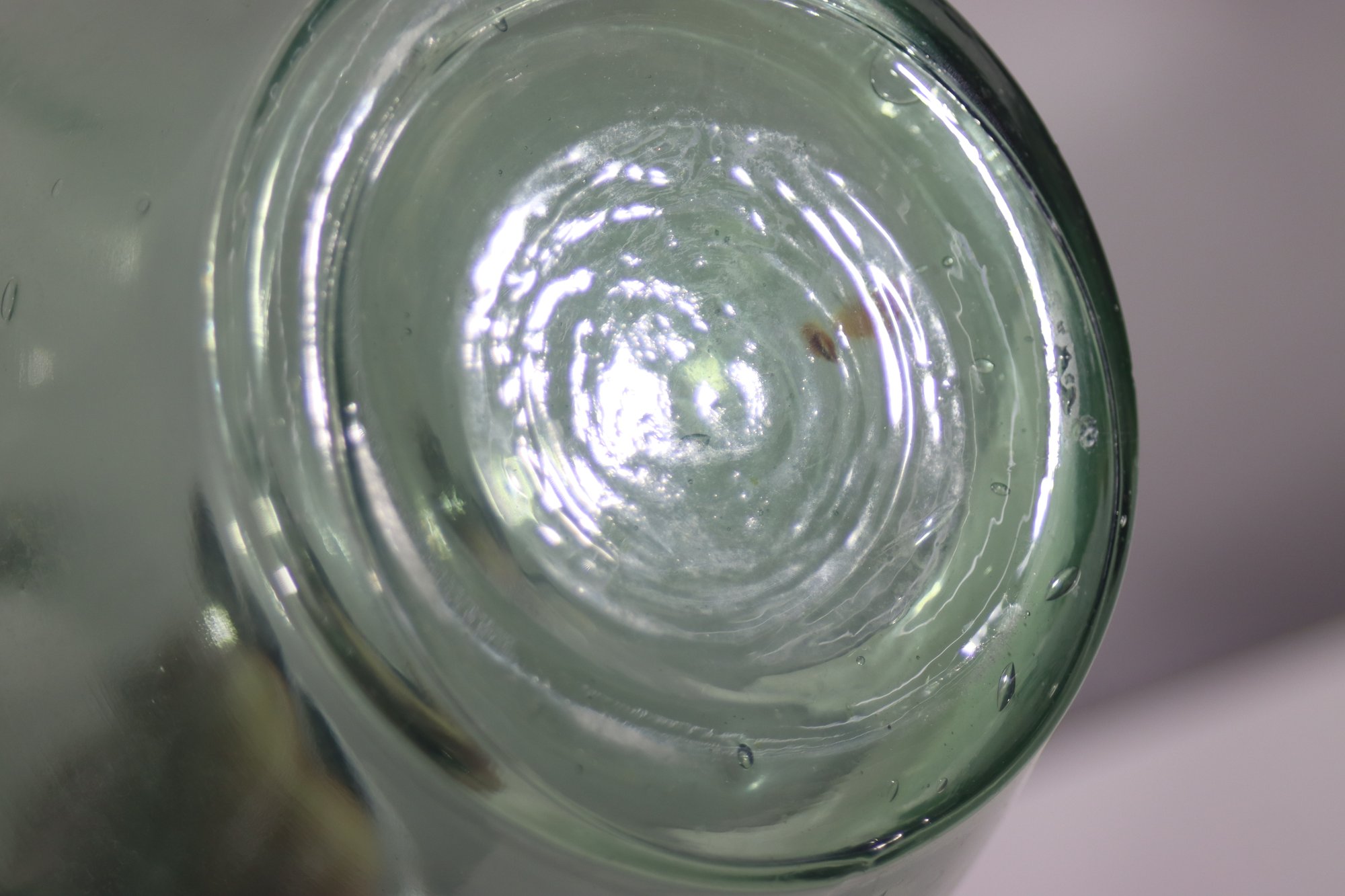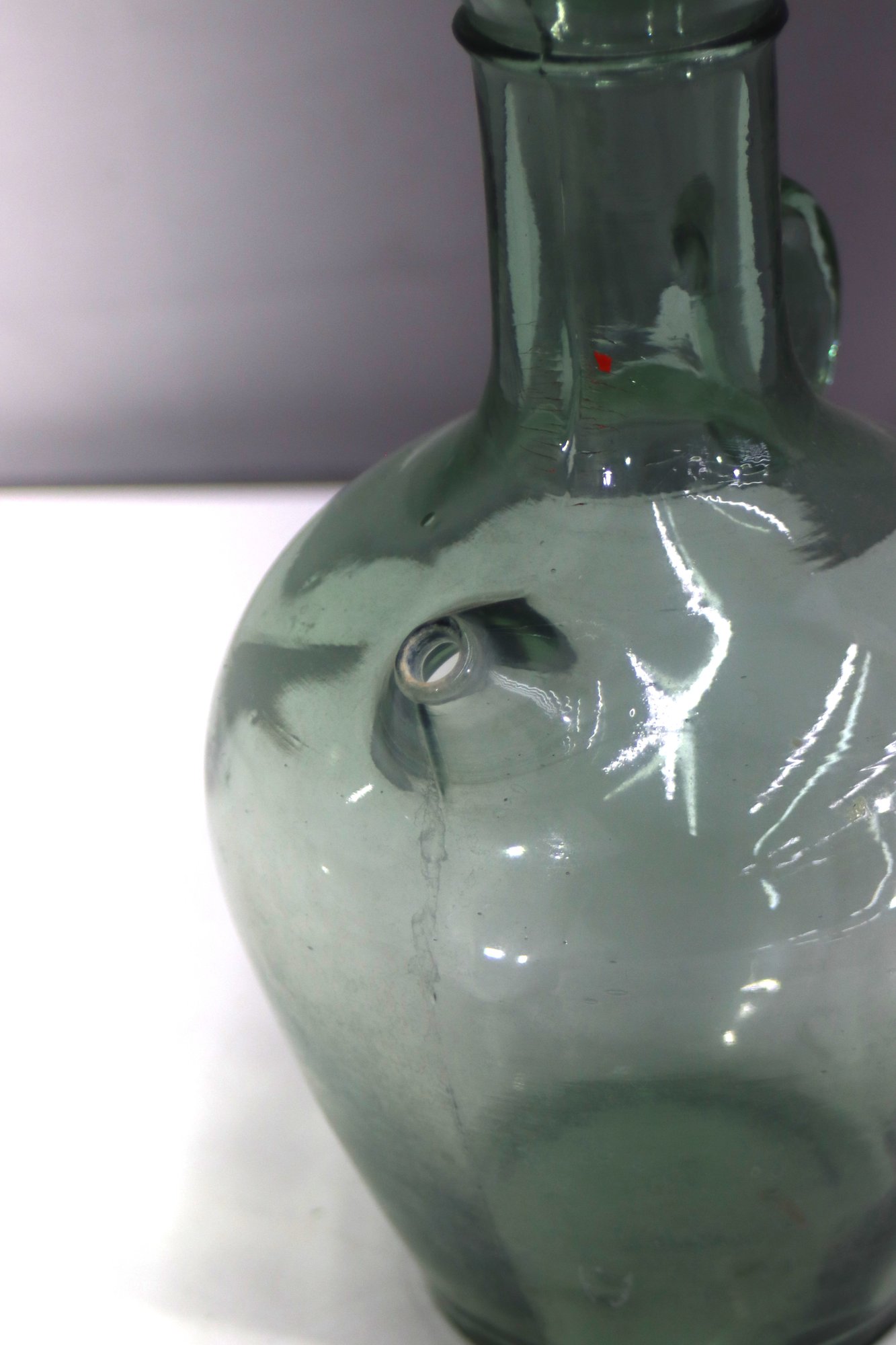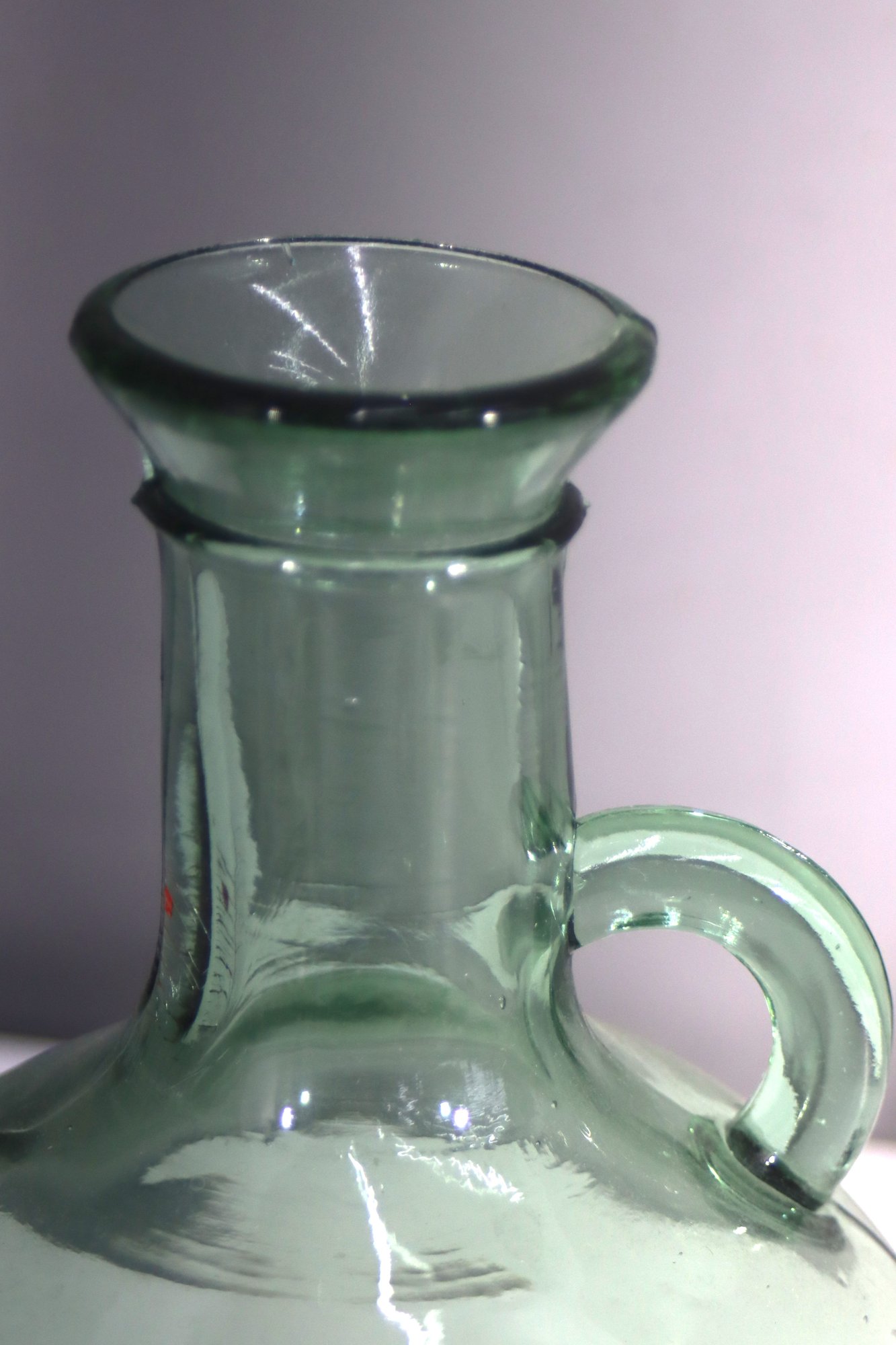 This vintage hand-blown green glass jug is a charming and rustic piece, featuring a rounded body, small side handle, and a classic spout. Its subtle imperfections and natural air bubbles add to its antique appeal, making it perfect for collectors or as a decorative accent.