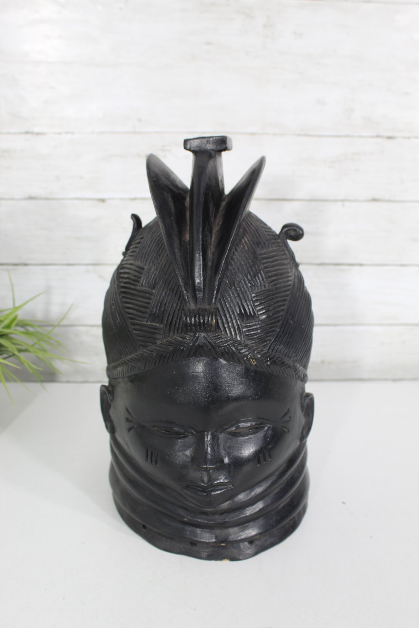 Striking vintage hand-carved African wooden head sculpture, standing approximately 14 inches tall. Expertly crafted from solid wood, this piece features a highly detailed face with traditional scarification markings, elaborate coiffure, and a deep blackened patina.