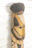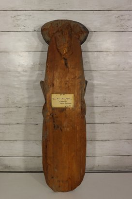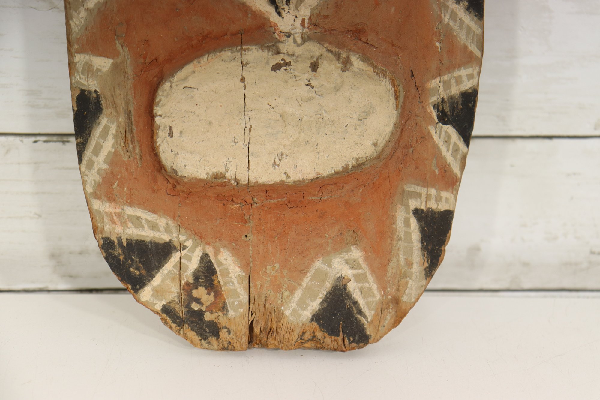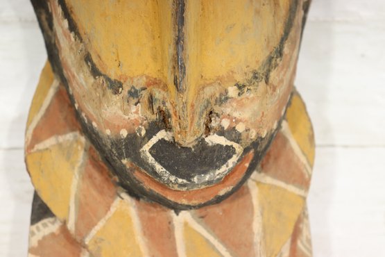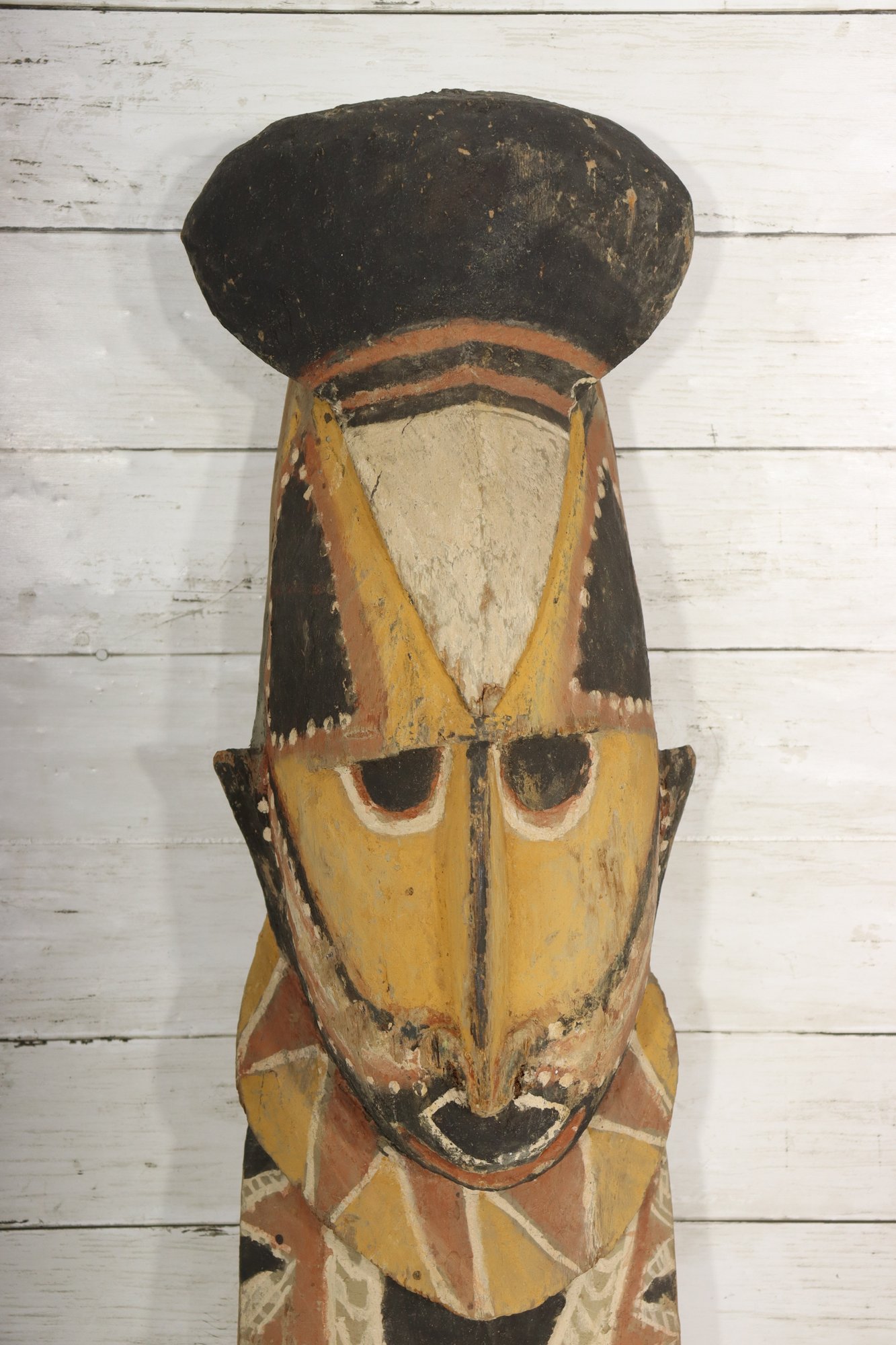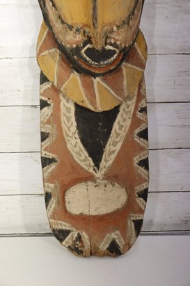 Striking hand-carved wooden ancestral totem mask from Papua New Guinea, standing approximately 29 inches high. This remarkable piece features a traditional tribal face motif with intricate carved detailing and natural earth-tone pigments of ochre, black, and white.