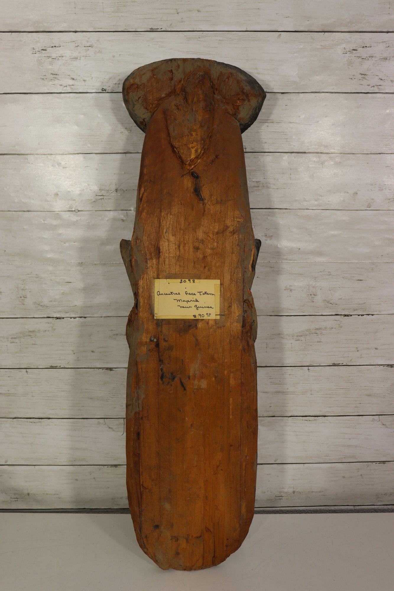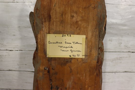 The mask is carved from a single piece of wood, showing the unique artistry and symbolism typical of Papua New Guinea tribal craftsmanship. The expressive facial features and geometric patterns give it a bold, authentic character. A label on the reverse identifies it as “Ancestral Face Totem, Maprik, New Guinea.”