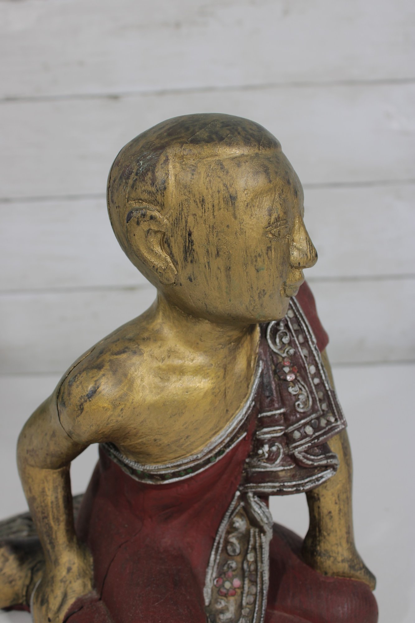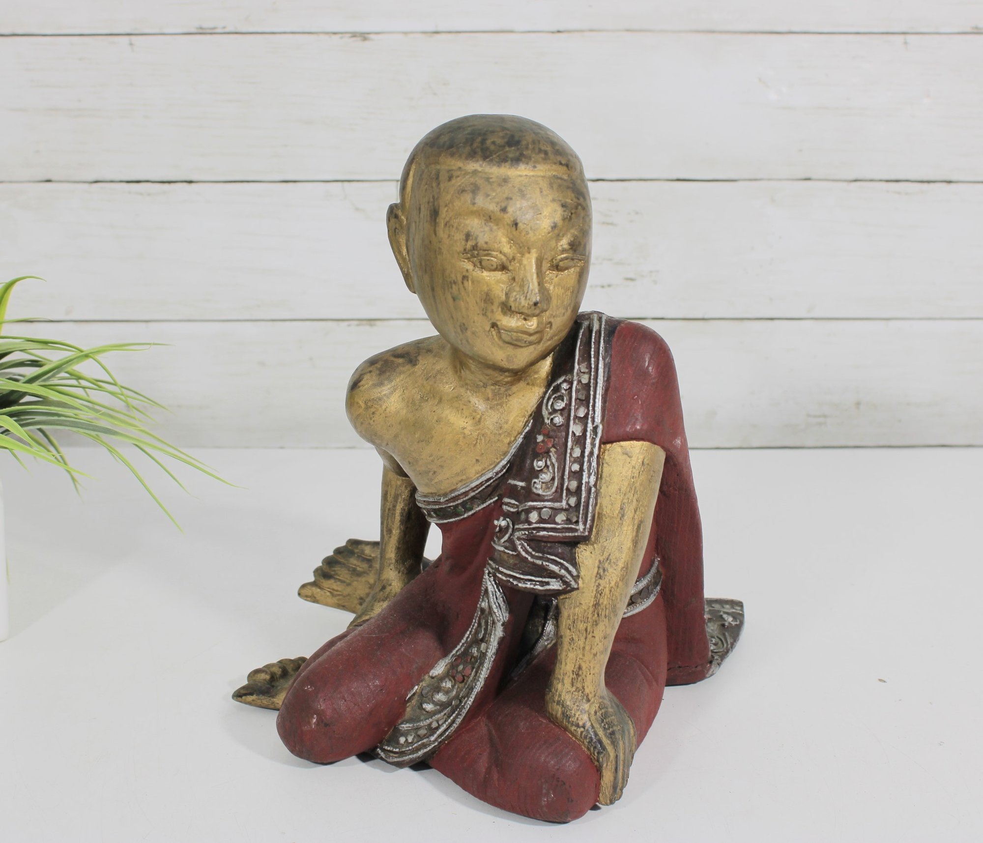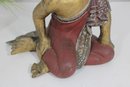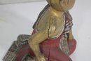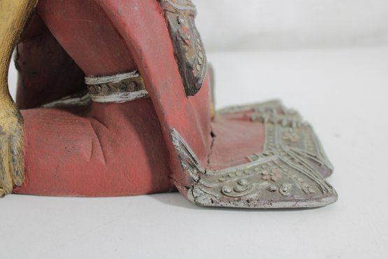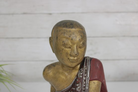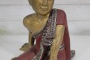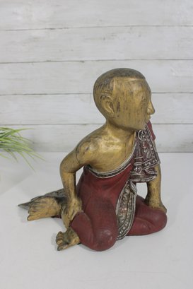 Charming vintage hand-carved figure depicting a seated monk in a relaxed pose. The piece features a beautifully aged red and gold painted finish, with detailed robe accents and a serene facial expression that adds character and warmth.