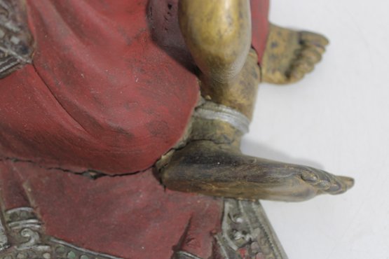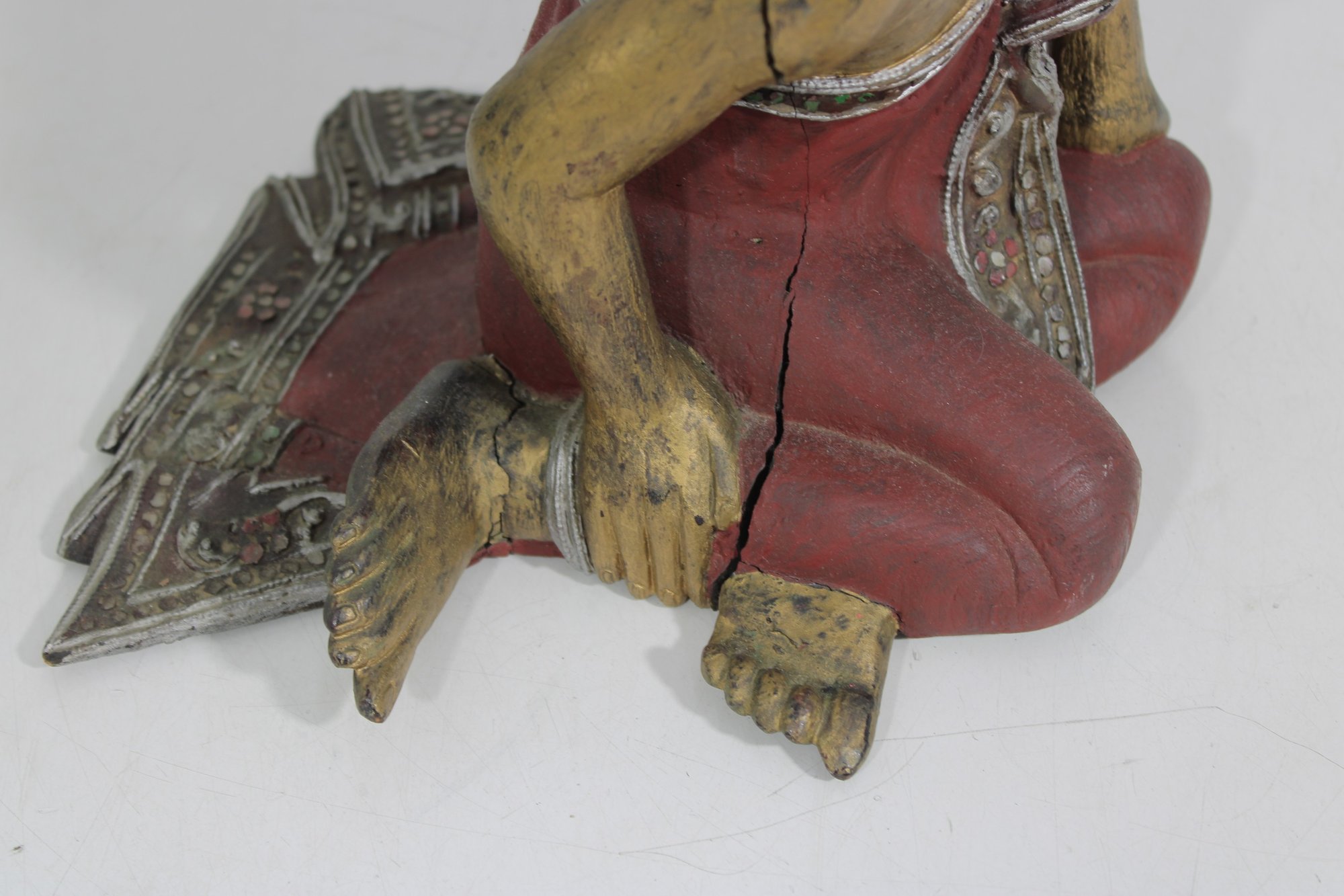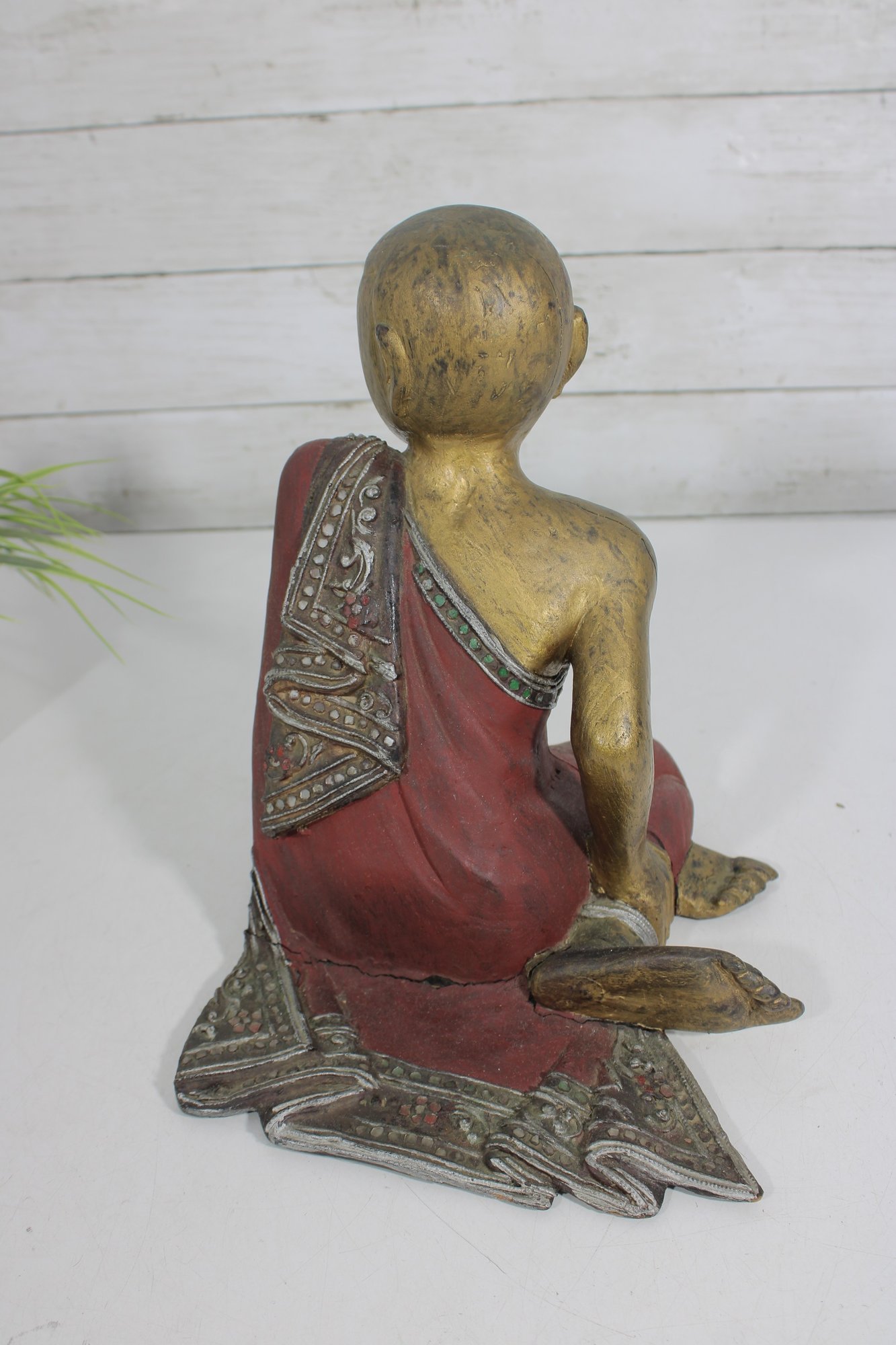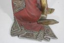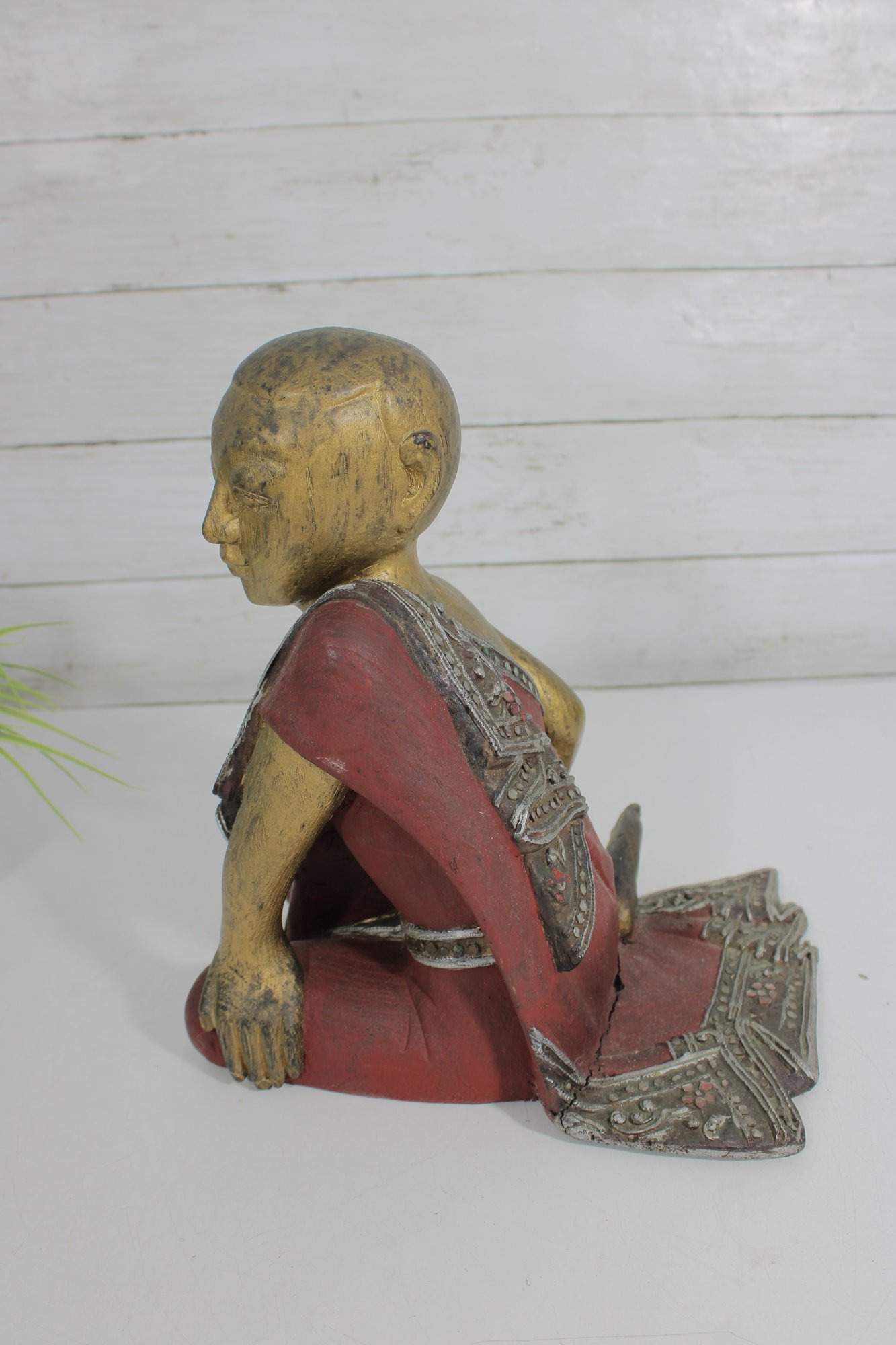 Charming vintage hand-carved figure depicting a seated monk in a relaxed pose. The piece features a beautifully aged red and gold painted finish, with detailed robe accents and a serene facial expression that adds character and warmth.