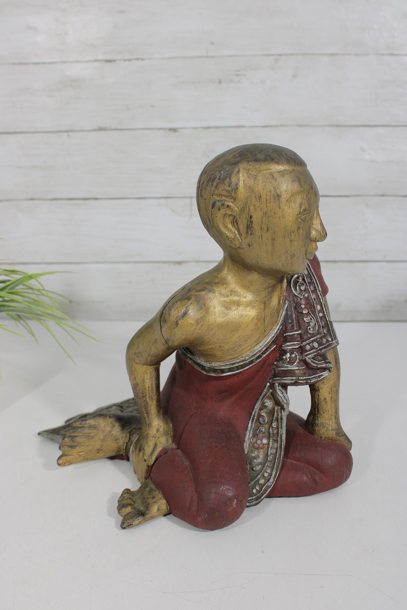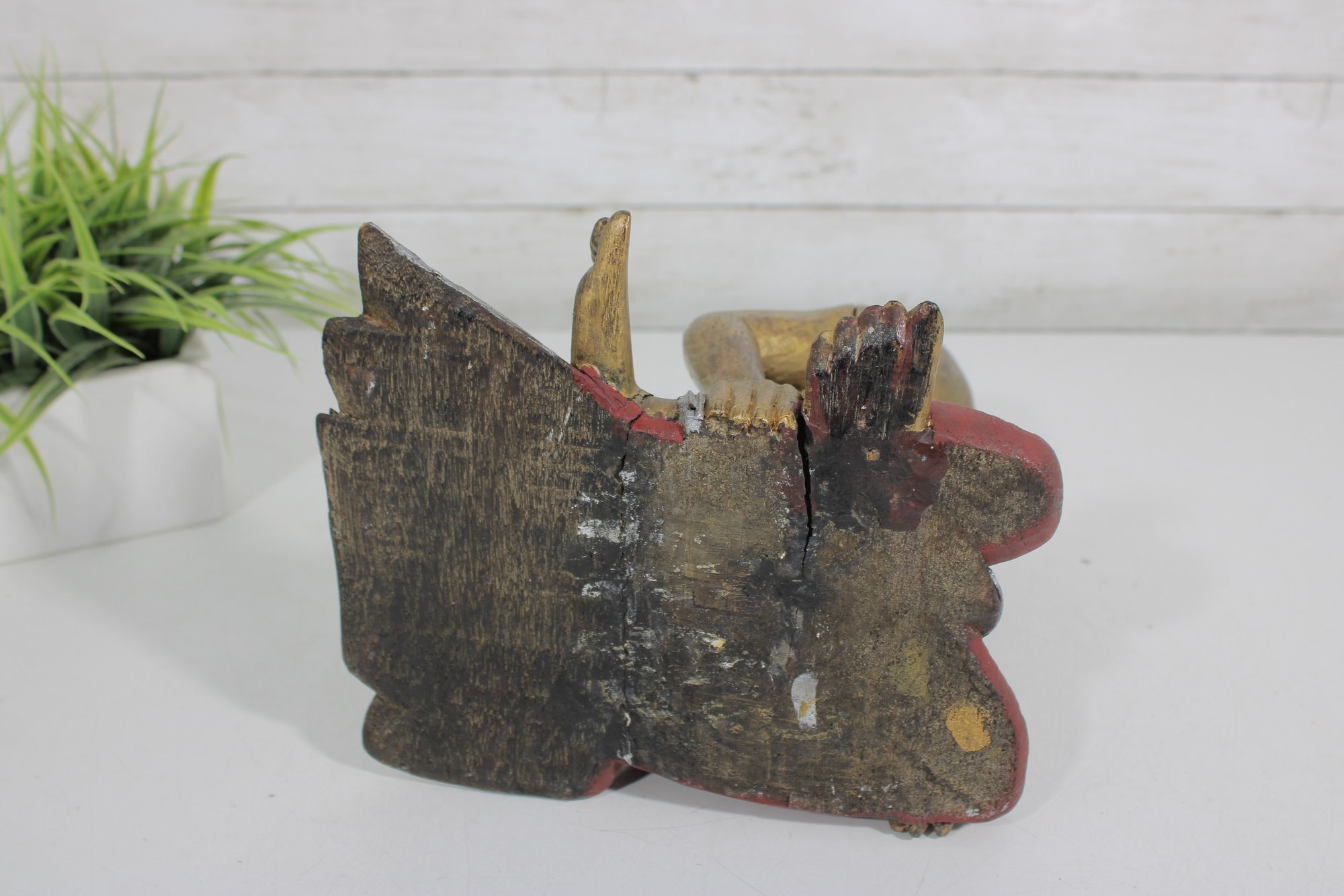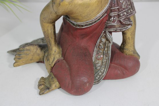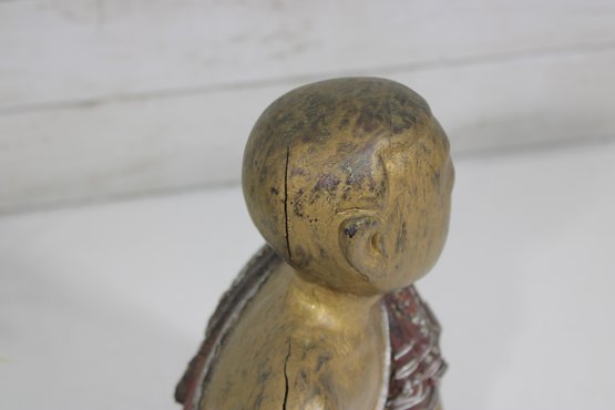 This decorative statue has a rustic, timeworn appeal, making it a unique addition to any collection of Asian-inspired décor, folk art, or vintage carvings.