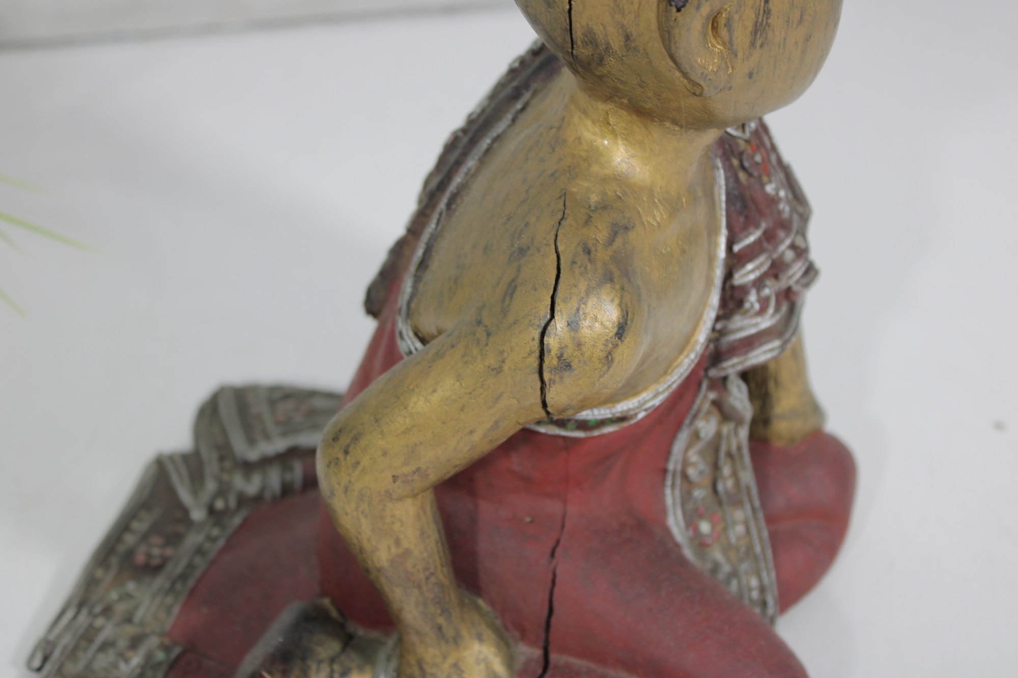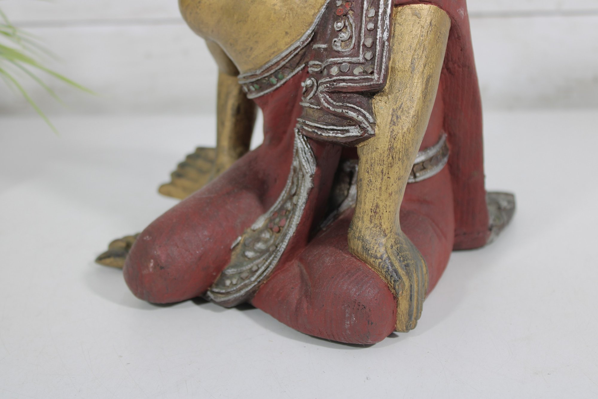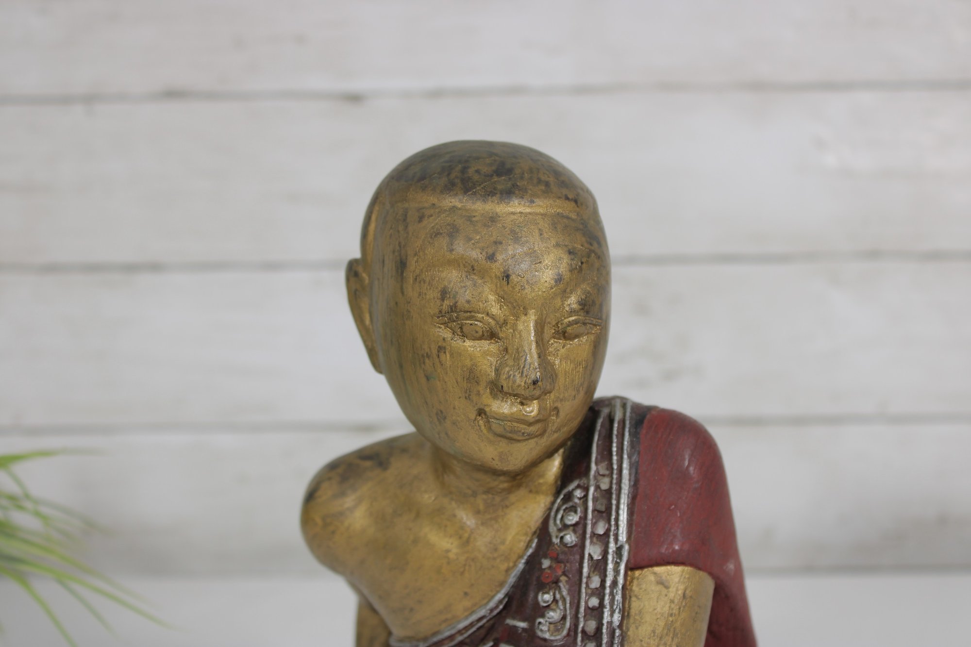 This decorative statue has a rustic, timeworn appeal, making it a unique addition to any collection of Asian-inspired décor, folk art, or vintage carvings.