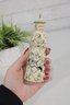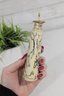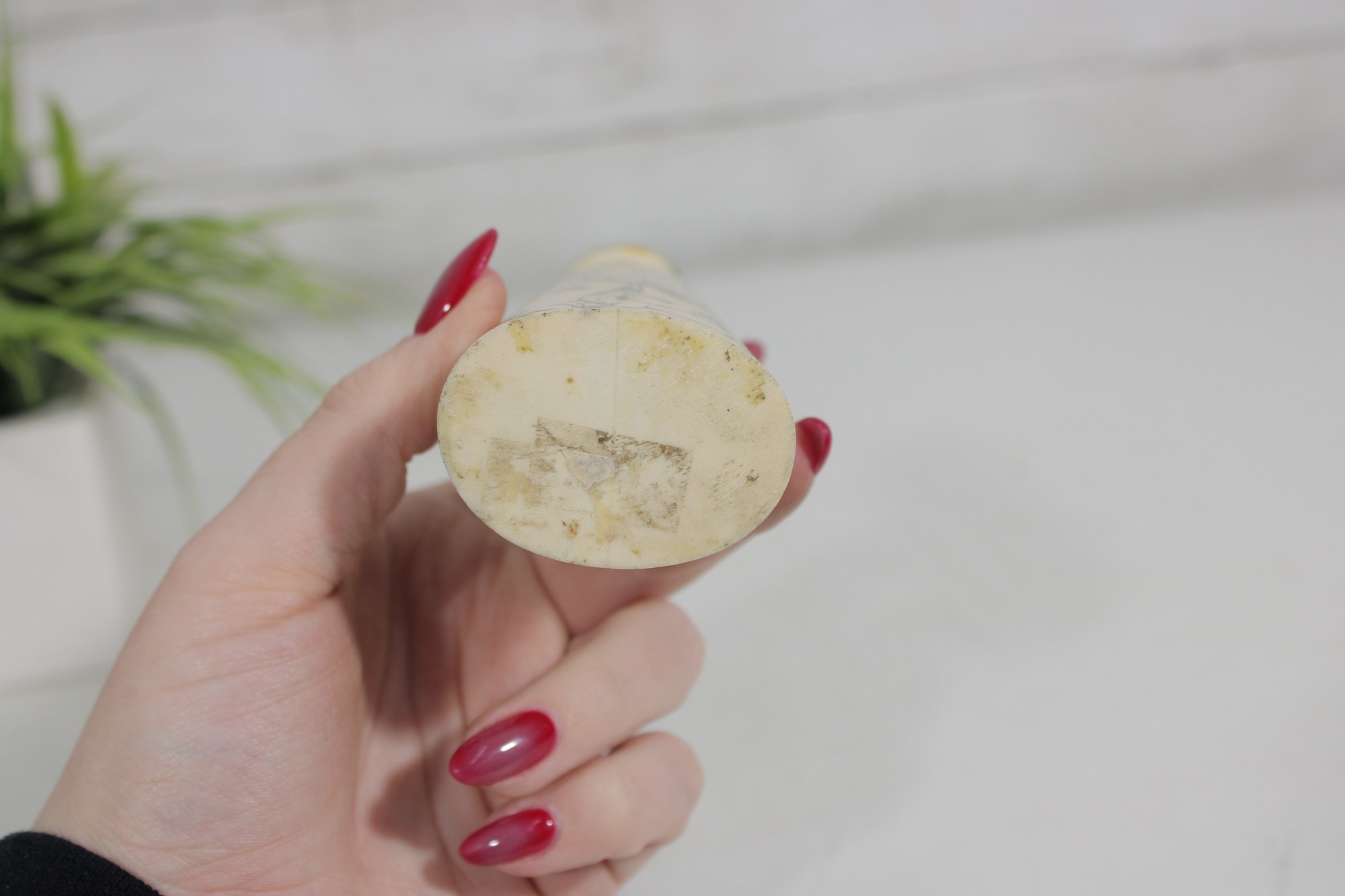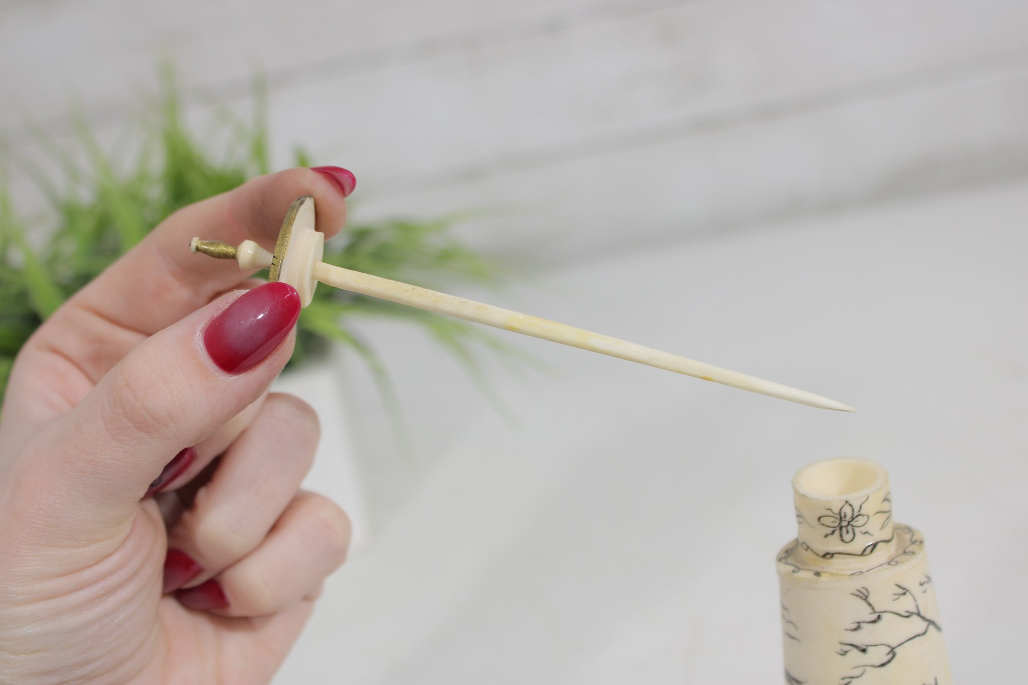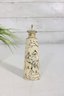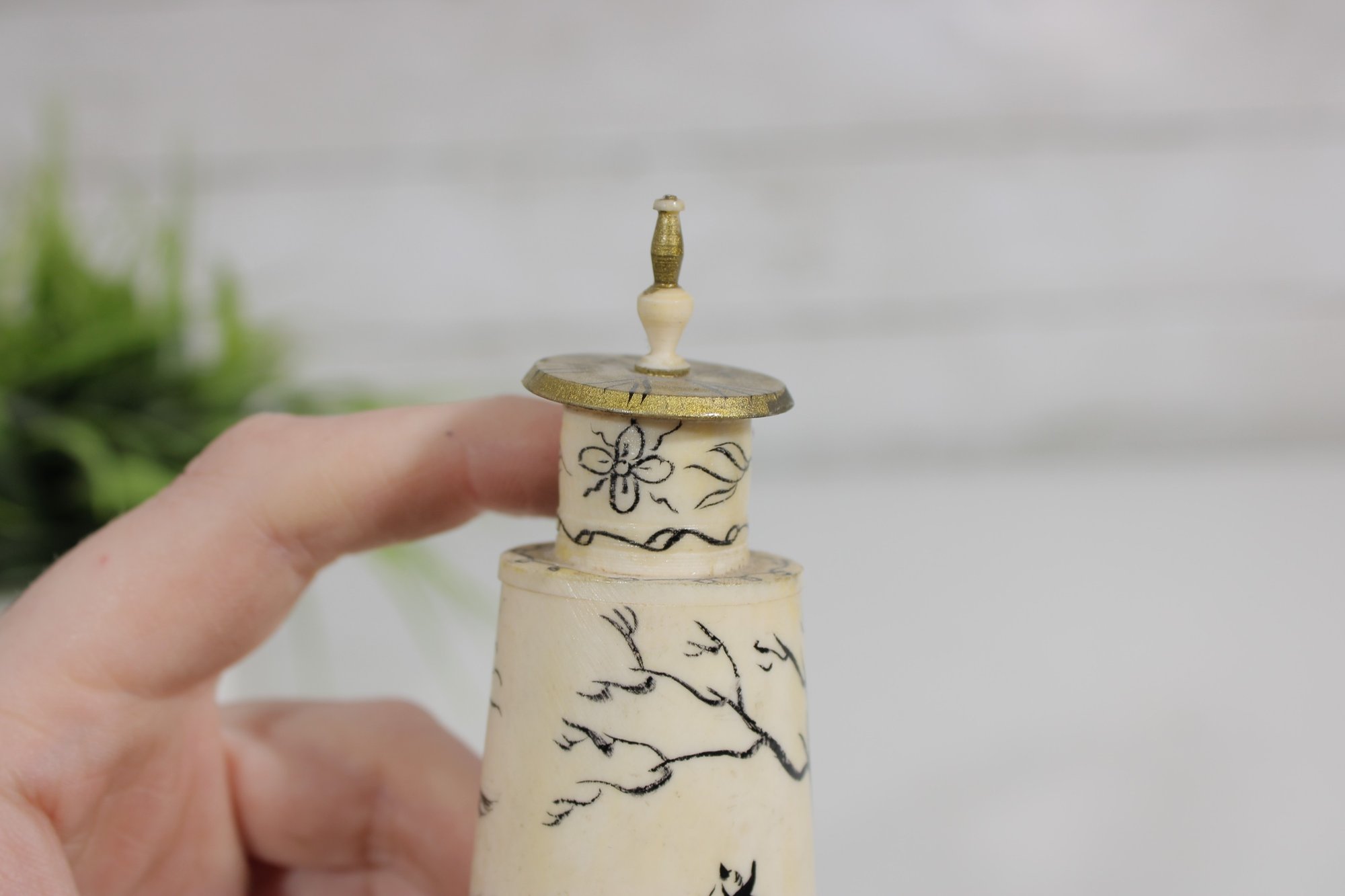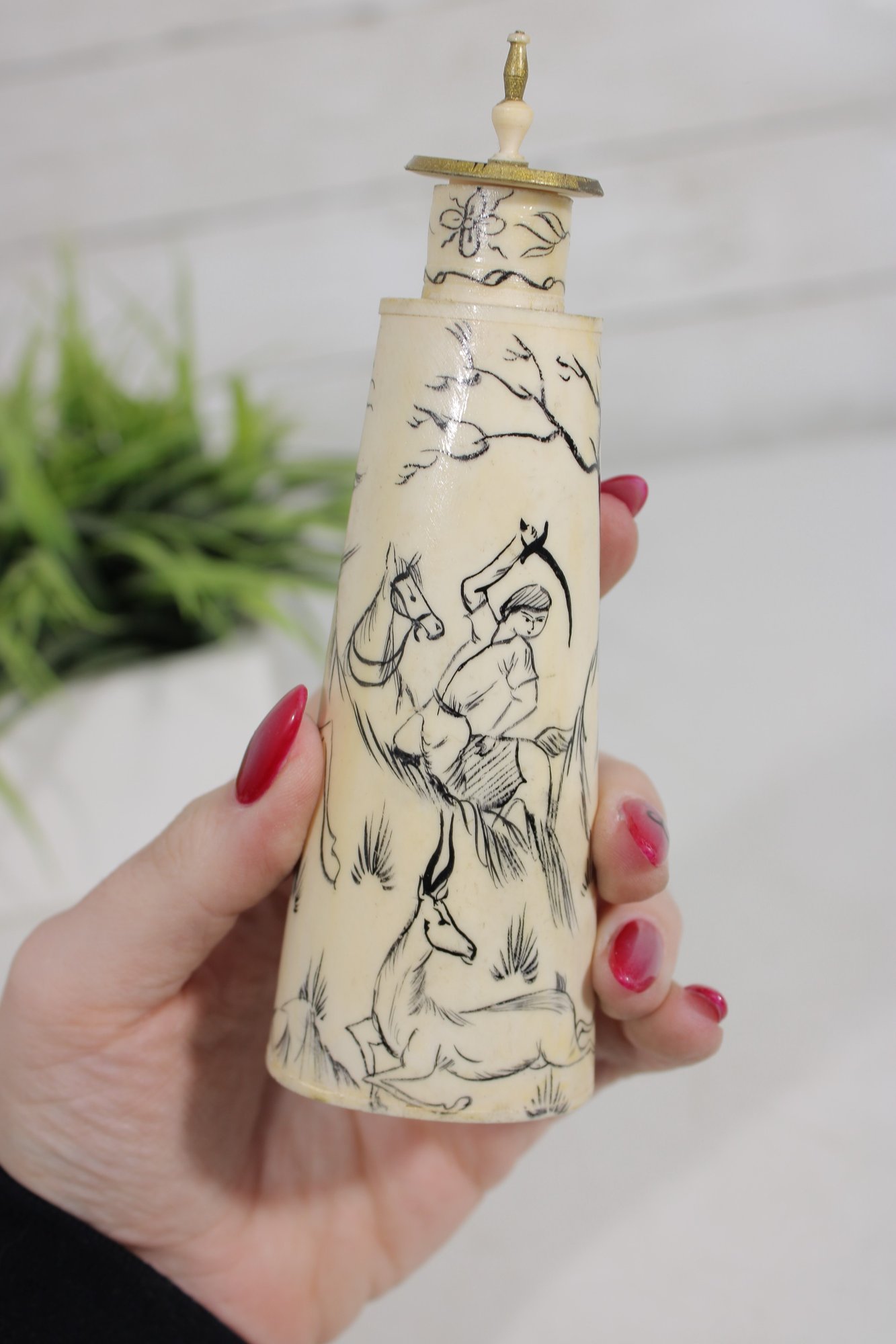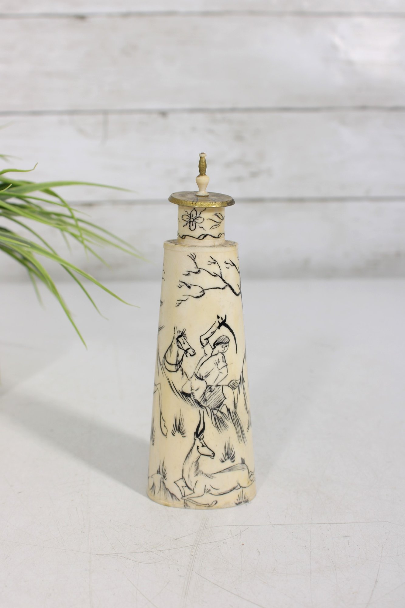 Intriguing vintage carved bottle in a scrimshaw-style design, featuring detailed etched imagery of a figure beneath a tree with birds in flight. The piece has a warm ivory-toned finish and is topped with a decorative stopper, which includes a long slender pick (likely for serving or decorative use).