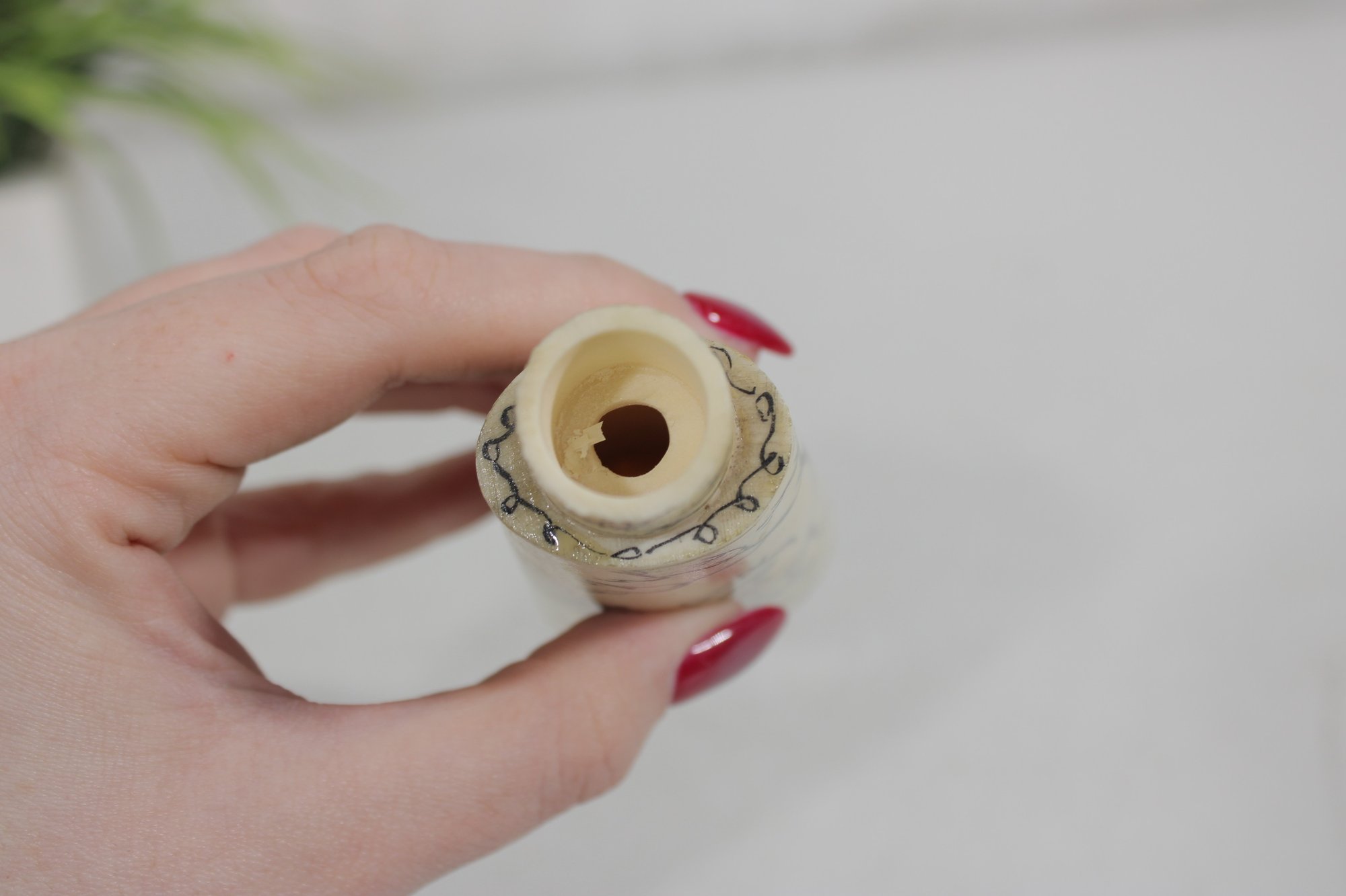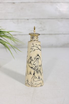 The surface is intricately engraved with fine linework, giving it a folk art or nautical scrimshaw aesthetic. The form is tall and tapered, making it an eye-catching display piece.