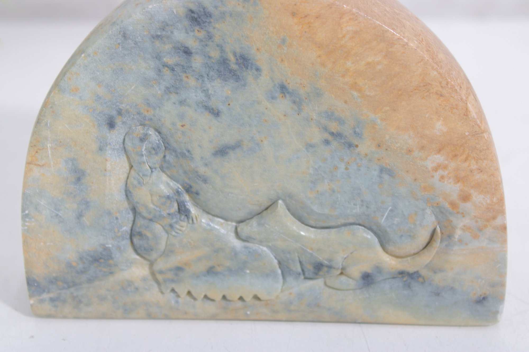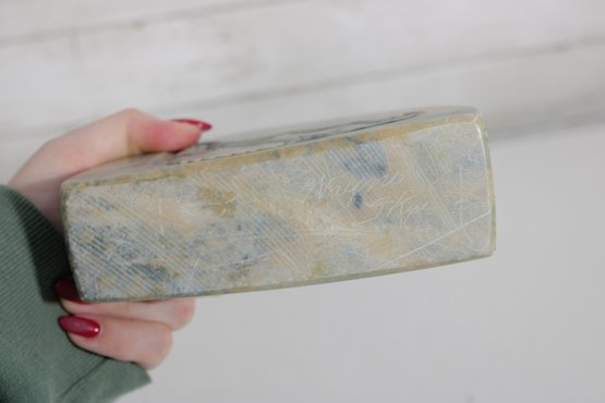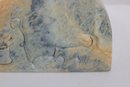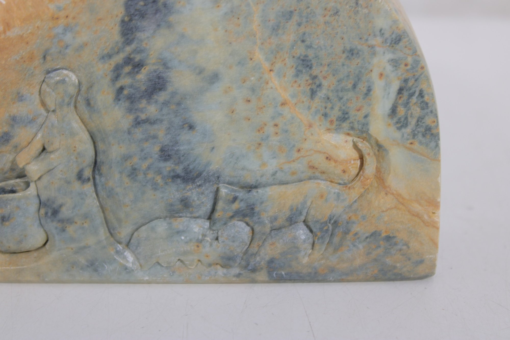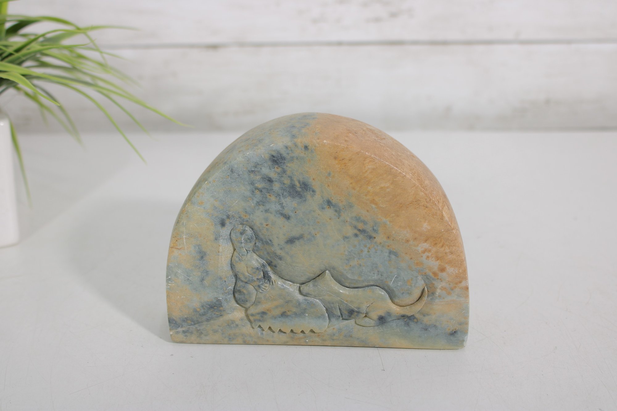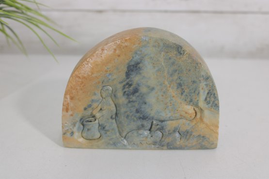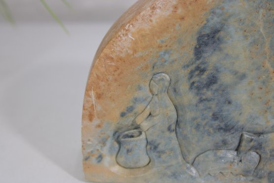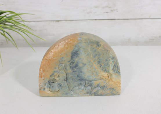 a unique vintage hand-carved stone relief sculpture featuring a simple, charming figural scene. The piece depicts a stylized human figure alongside animals—possibly dogs or livestock—rendered in a primitive or folk art style with incised line work.