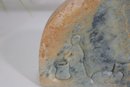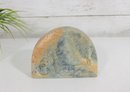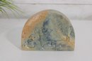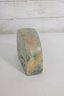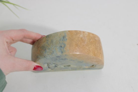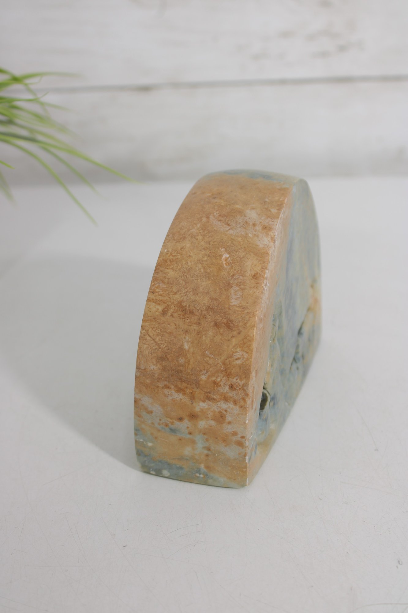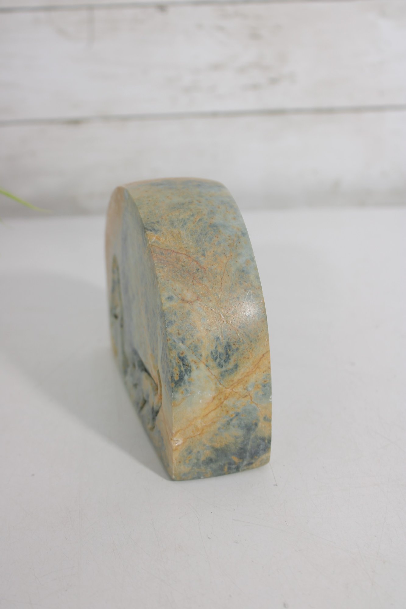 The stone has a smooth, rounded top form and displays beautiful natural coloration in soft tones of beige, tan, blue, and gray, giving it an earthy, organic appearance. The minimalist carving and weathered look add to its rustic appeal.