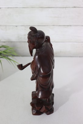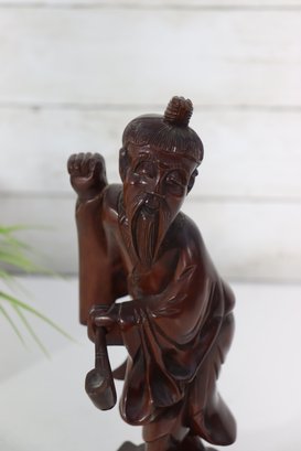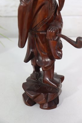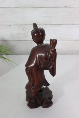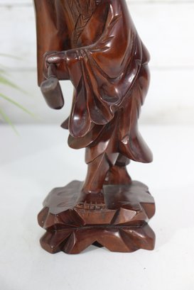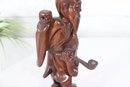 Beautiful vintage hand-carved wooden figure depicting a traditional Chinese scholar or immortal figure, finely detailed with flowing robes, expressive facial features, and symbolic accessories. The figure stands in a graceful pose holding a staff, with a small companion figure carved at the shoulder, adding depth and character to the piece.