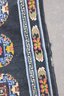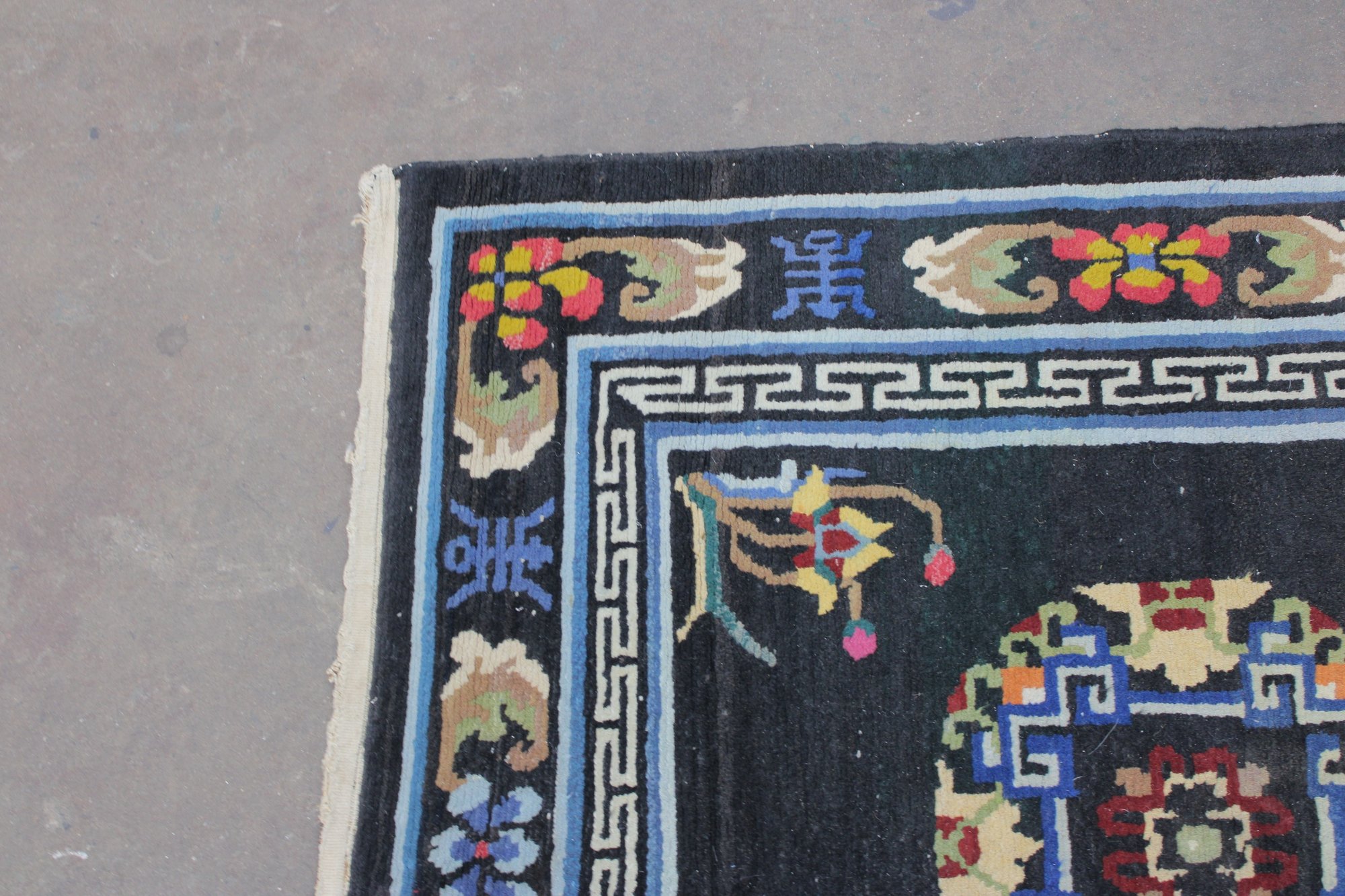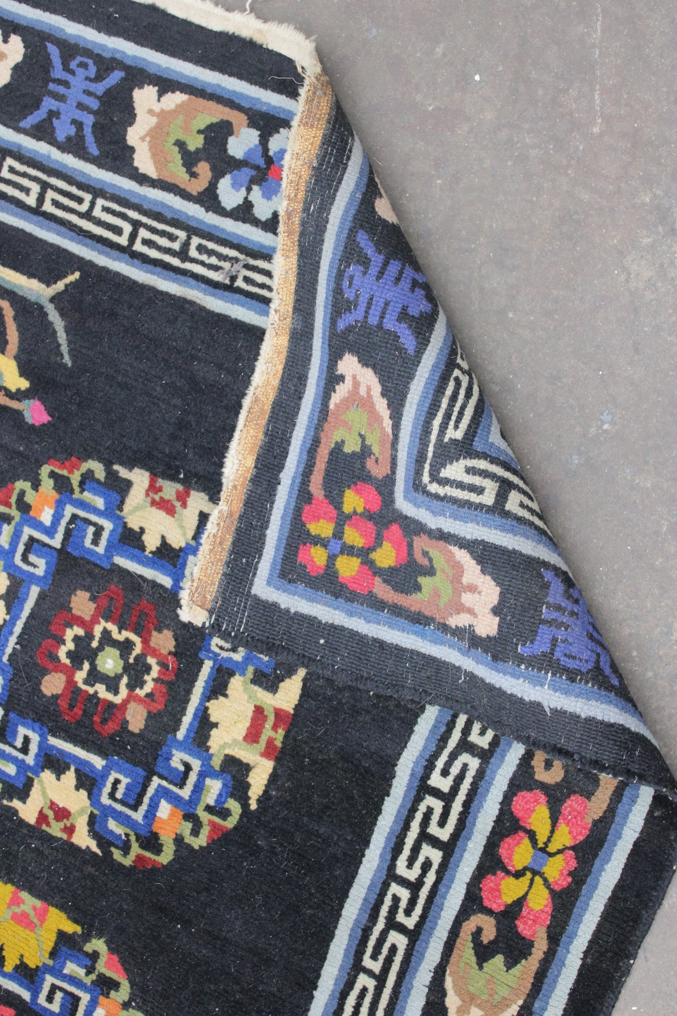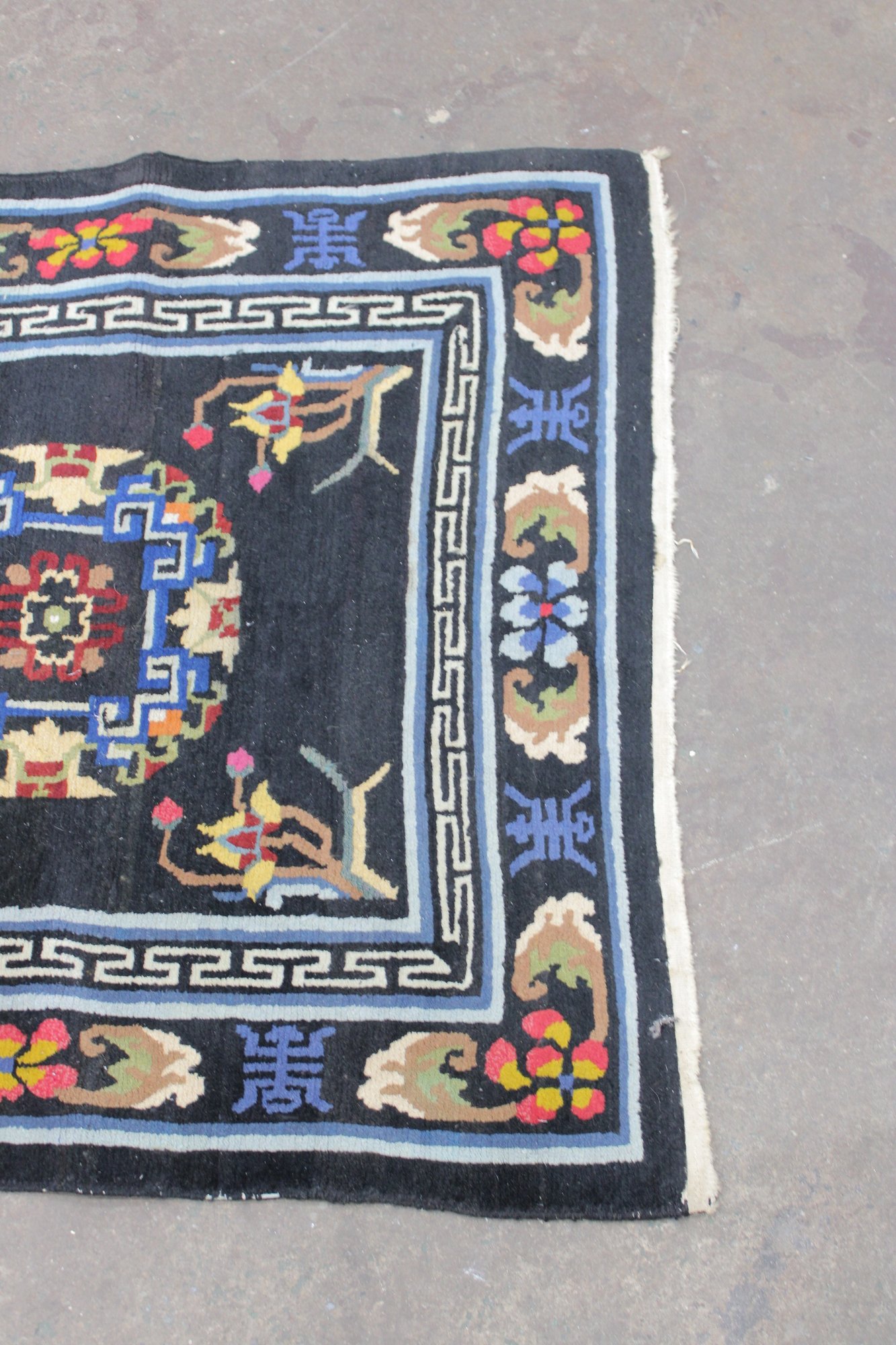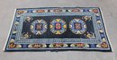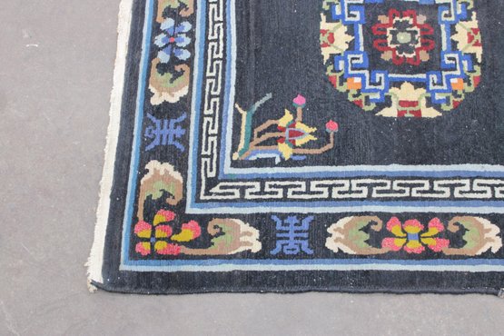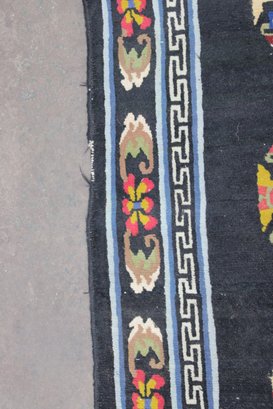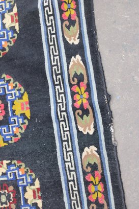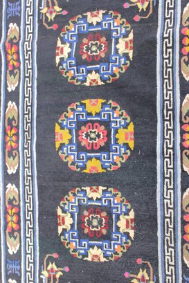 a beautiful vintage hand-made oriental rug measuring approximately 36" x 67". This striking piece features a deep black field accented by three geometric medallions, surrounded by an intricate border with floral and symbolic motifs in vibrant tones of red, blue, ivory, and gold.