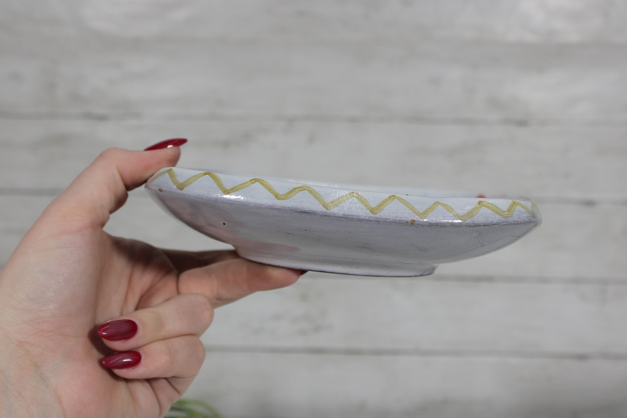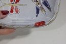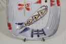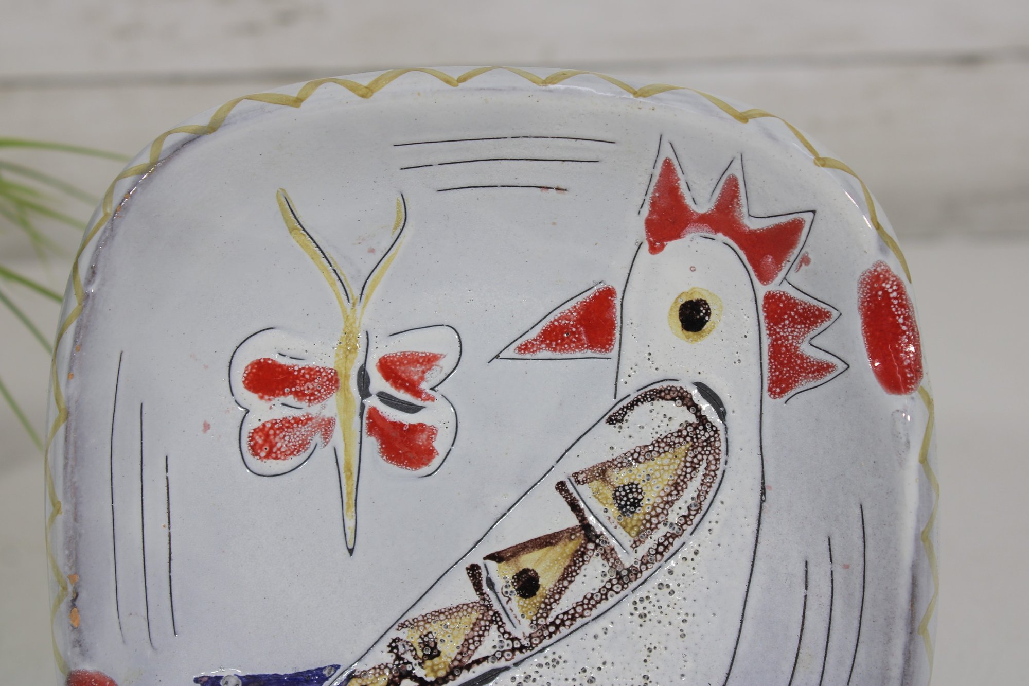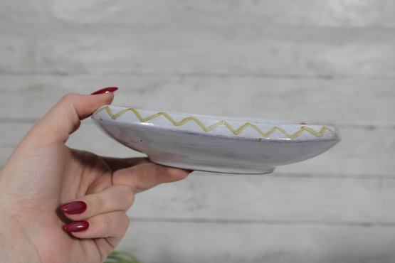 The soft white glaze background is accented with hand-applied colors in red, blue, yellow, and black, while the gently scalloped edge adds to its character. The artistic, naïve design gives this piece a unique and collectible appeal.