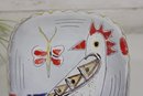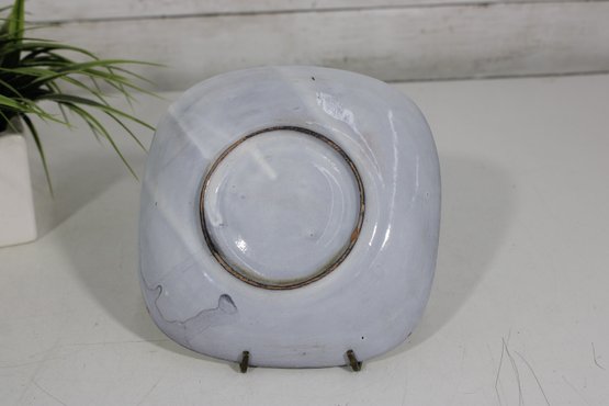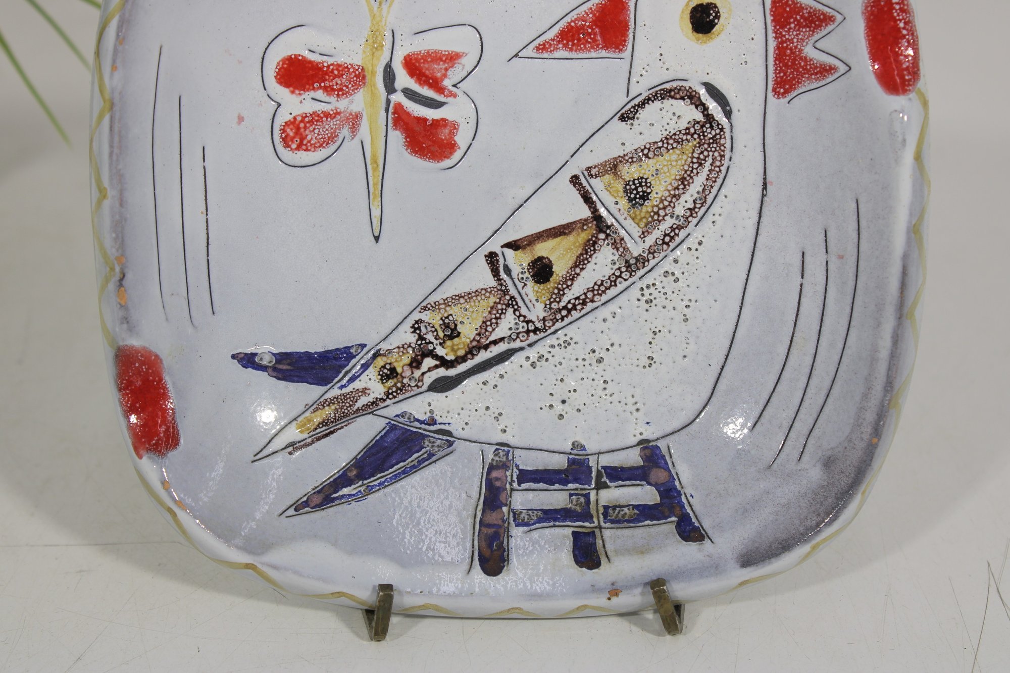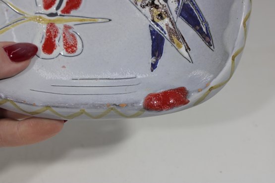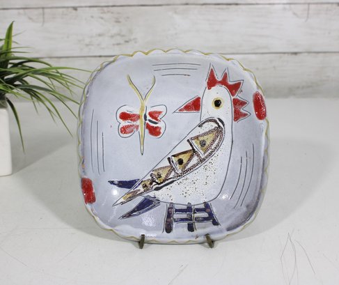 here is a charming vintage hand-painted art pottery plate featuring a whimsical folk art design. The piece showcases a stylized bird with bold red accents, accompanied by a butterfly and abstract decorative elements, all rendered in a playful and expressive style.