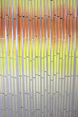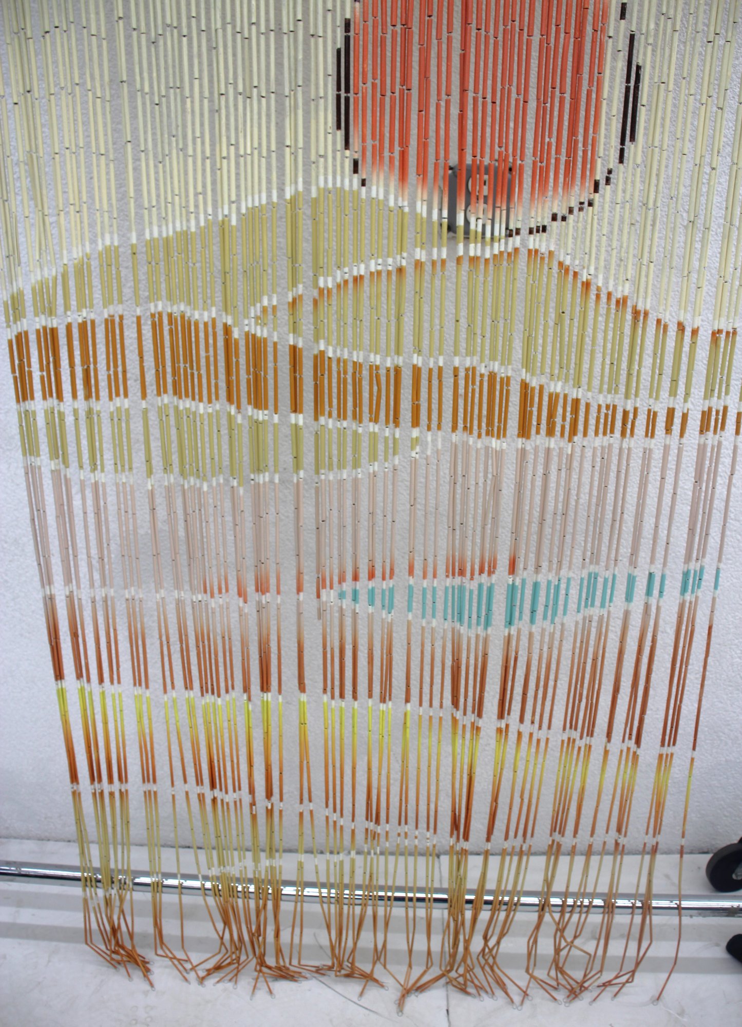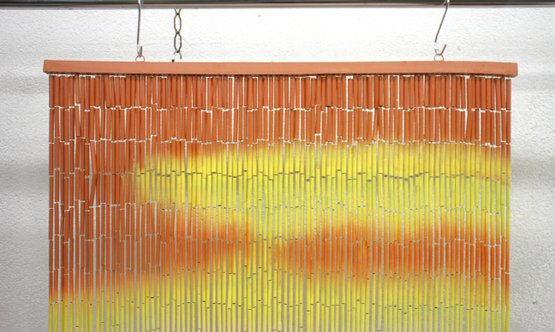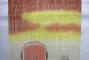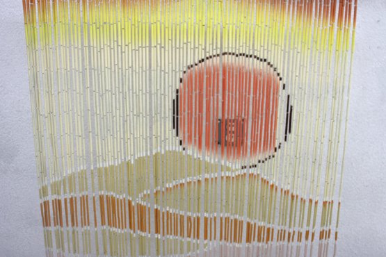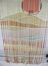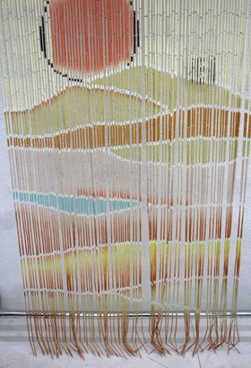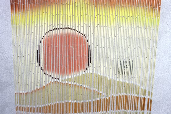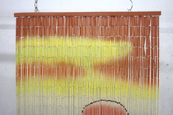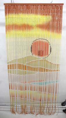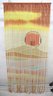 This stunning vintage bamboo beaded curtain features a hand-painted desert sunset scene, complete with a radiant orange sun over rolling sand dunes, accented by warm yellow and beige tones. The delicate gradient transitions and natural bamboo texture create a serene and artistic visual effect.