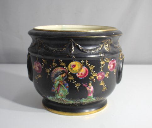 Add a touch of elegance to your home with this beautifully crafted vintage ceramic planter. Made in England, this hand-painted piece showcases an exquisite oriental design featuring a lady with an umbrella and a child, set against a backdrop of vibrant lanterns and floral accents.
