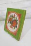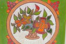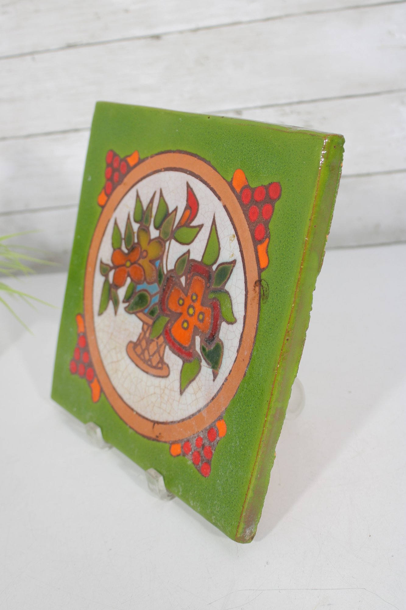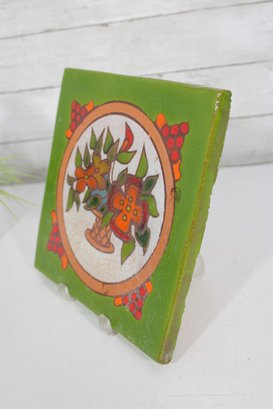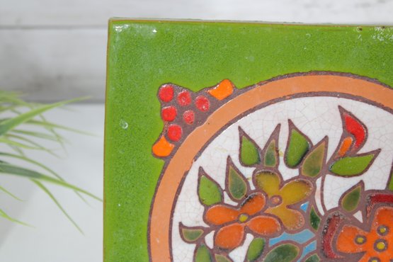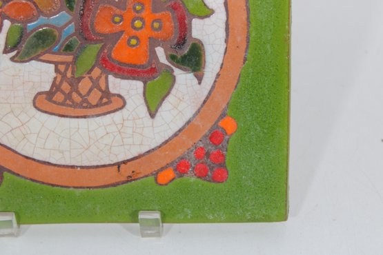 Colorful vintage ceramic art tile featuring a hand-painted floral basket motif framed within a circular medallion. The design is set against a vibrant green background with red berry accents, giving the piece a charming, folk art or Mediterranean-inspired aesthetic.
