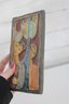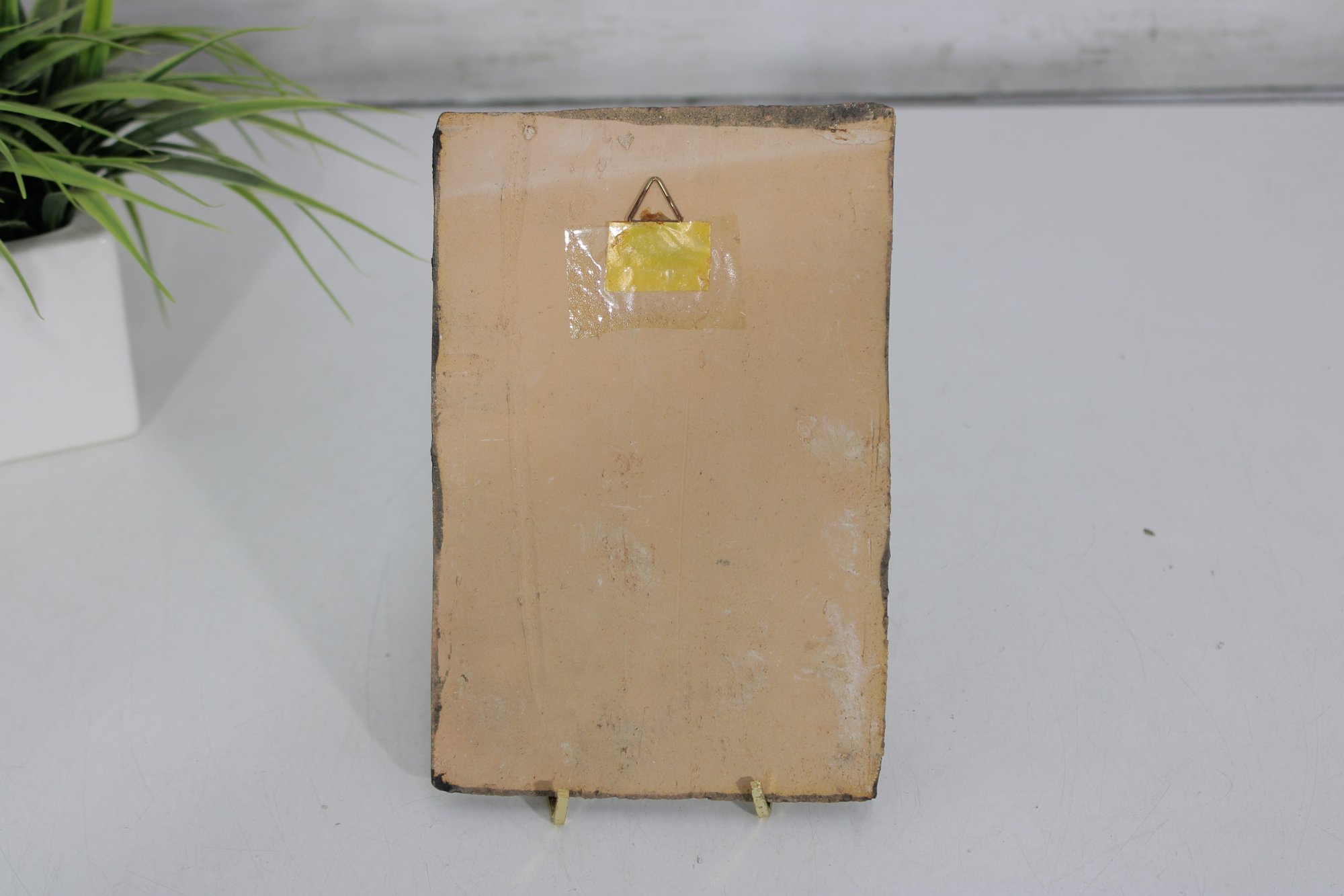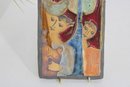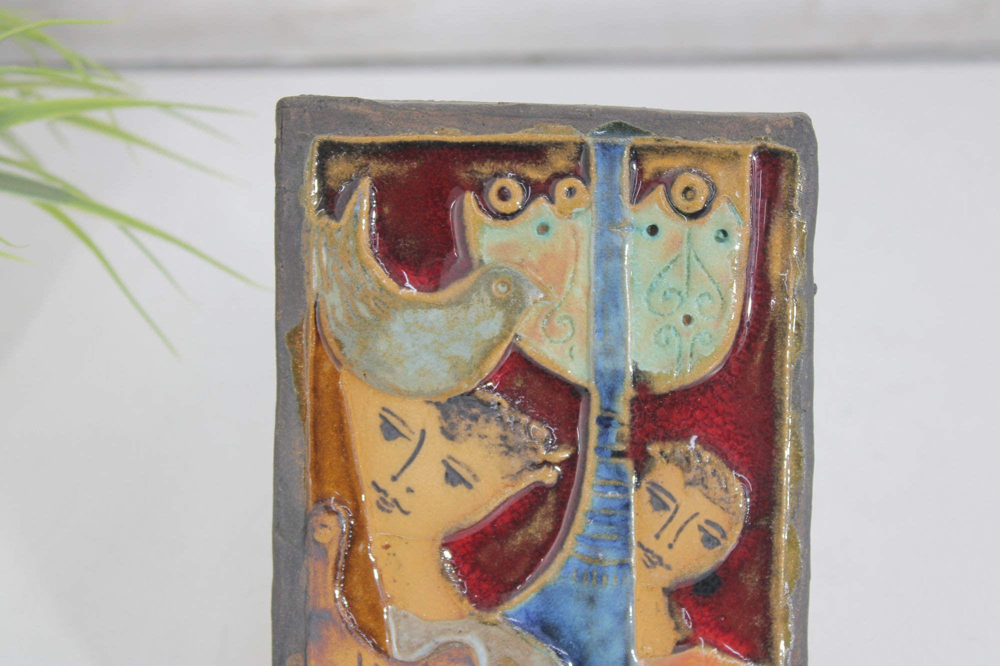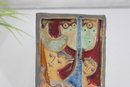 Charming vintage hand-painted ceramic art tile plaque featuring a stylized figural scene in warm earth tones and rich blues. The composition depicts expressive figures separated by a vertical blue element, with textured detailing and a slightly raised surface that adds depth and character.