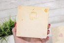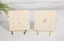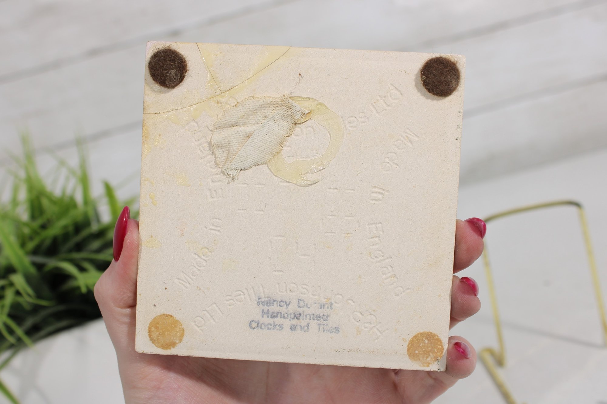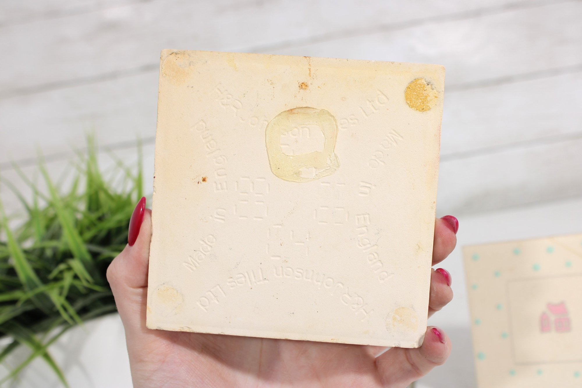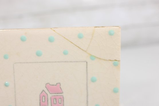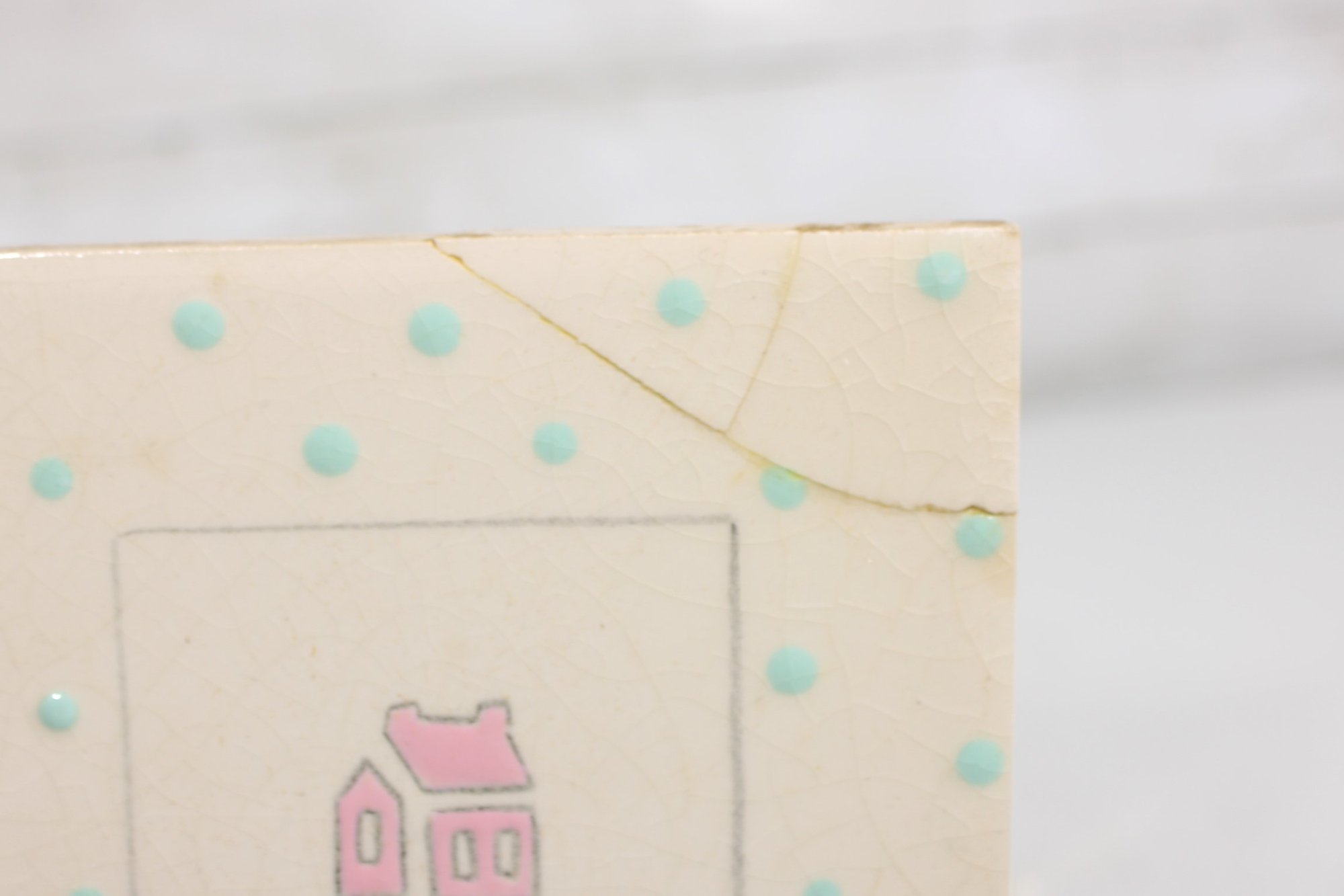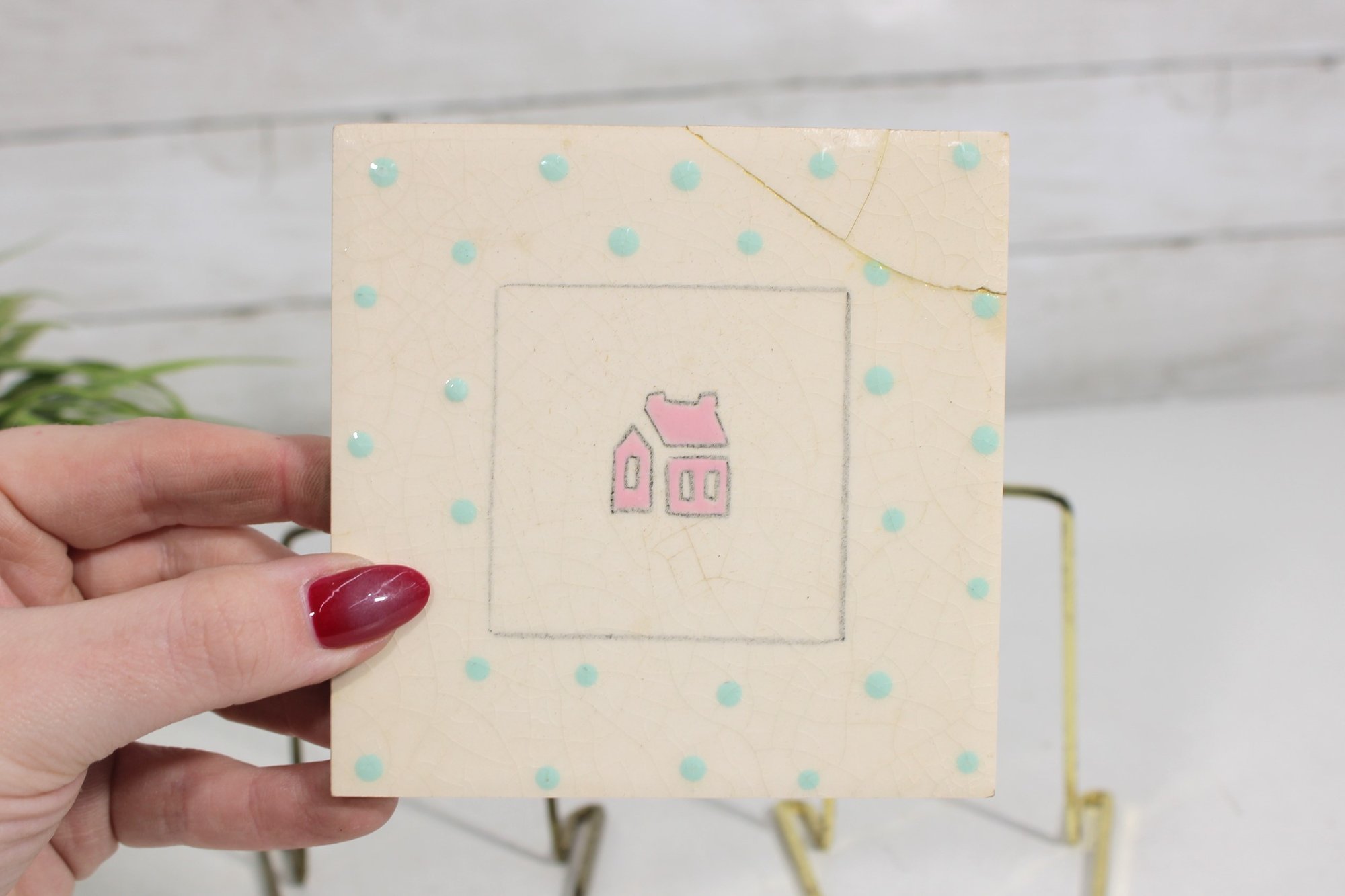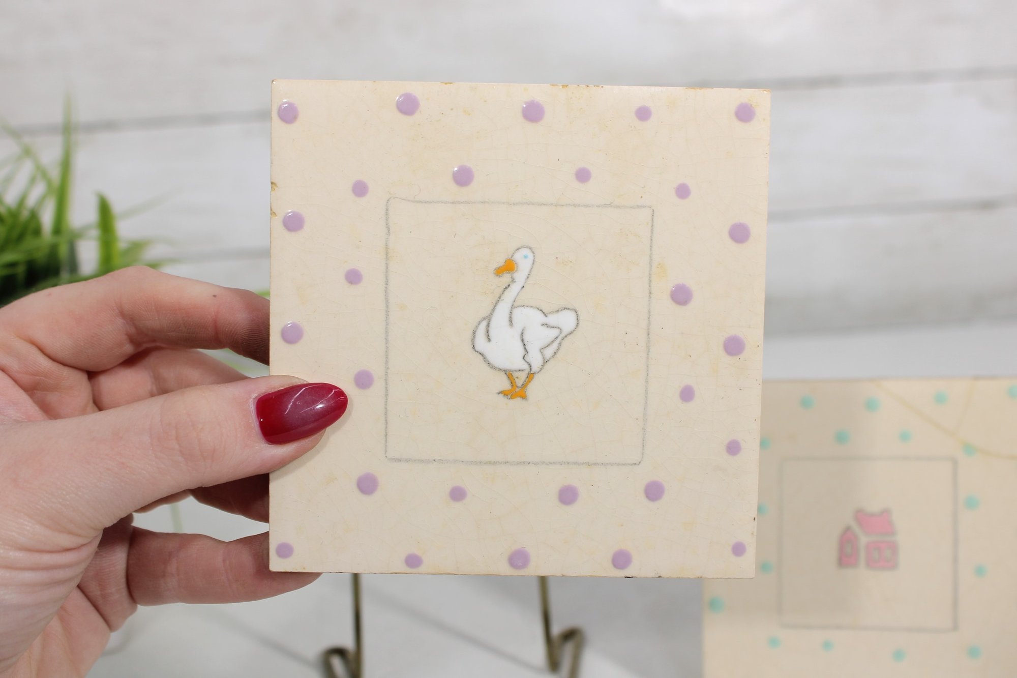Charming vintage hand-painted ceramic tile featuring a sweet, minimalist design. One tile displays a white goose, while the other shows a small pink house, both centered within a bordered square and accented by pastel polka dots. The soft cream background and delicate detailing give these pieces a quaint, cottage-style appeal.