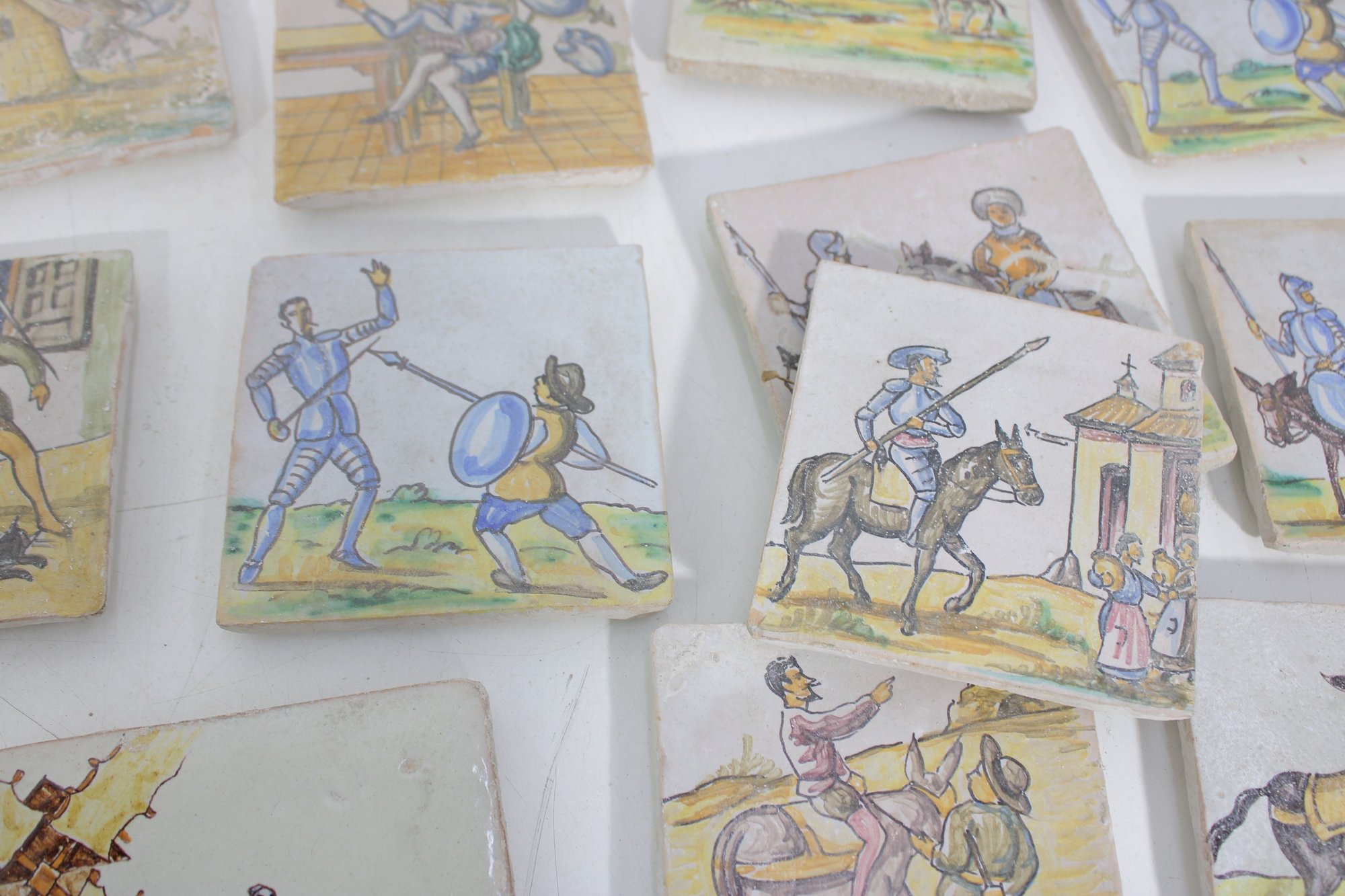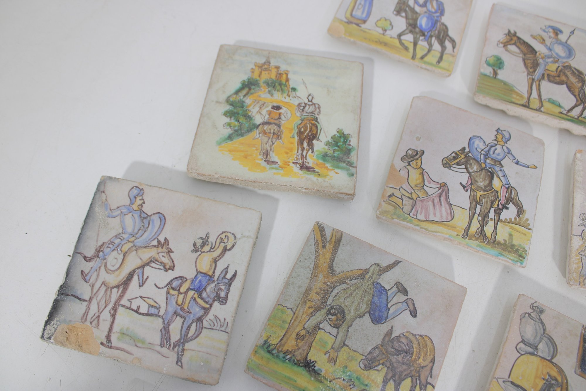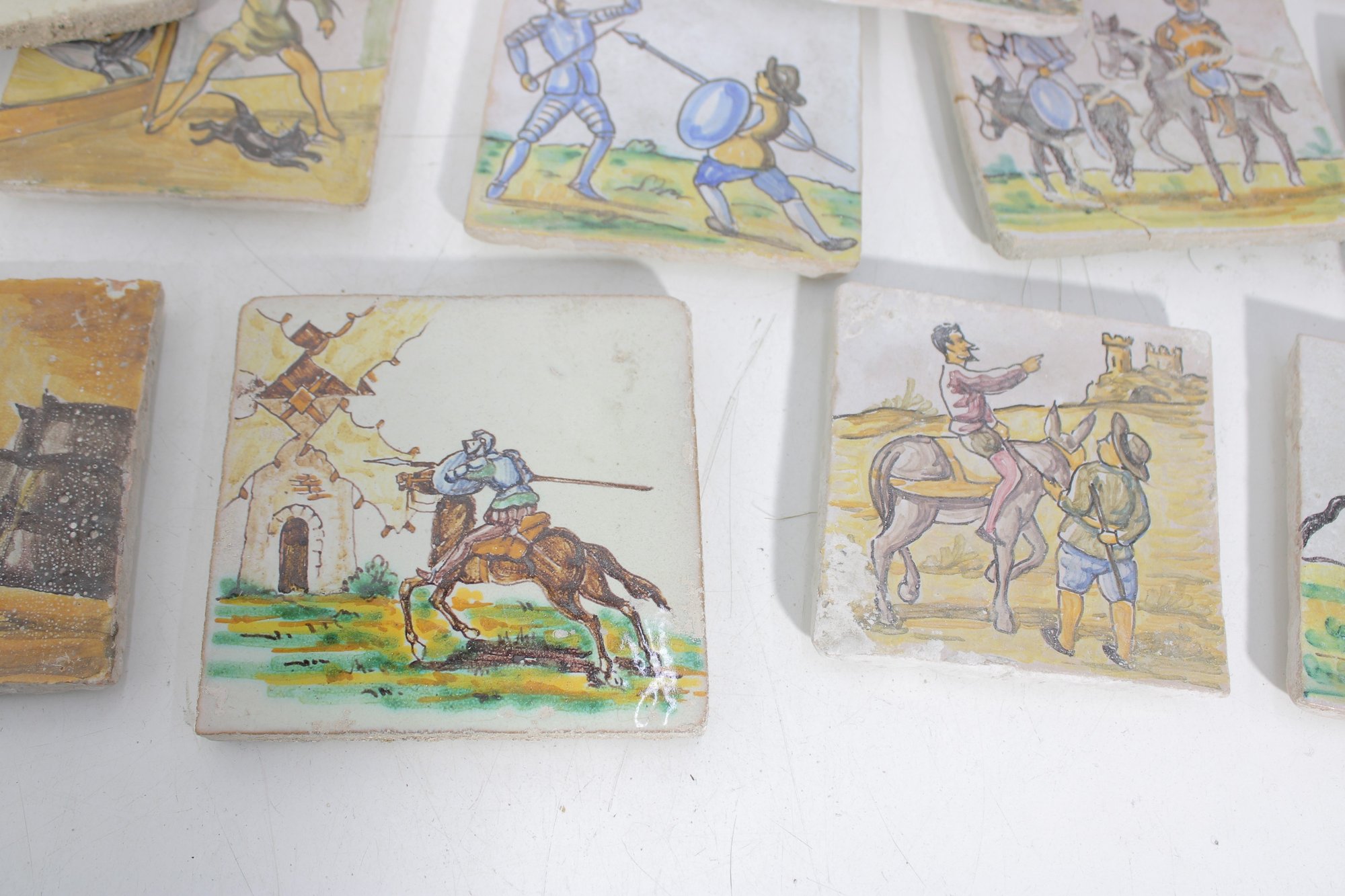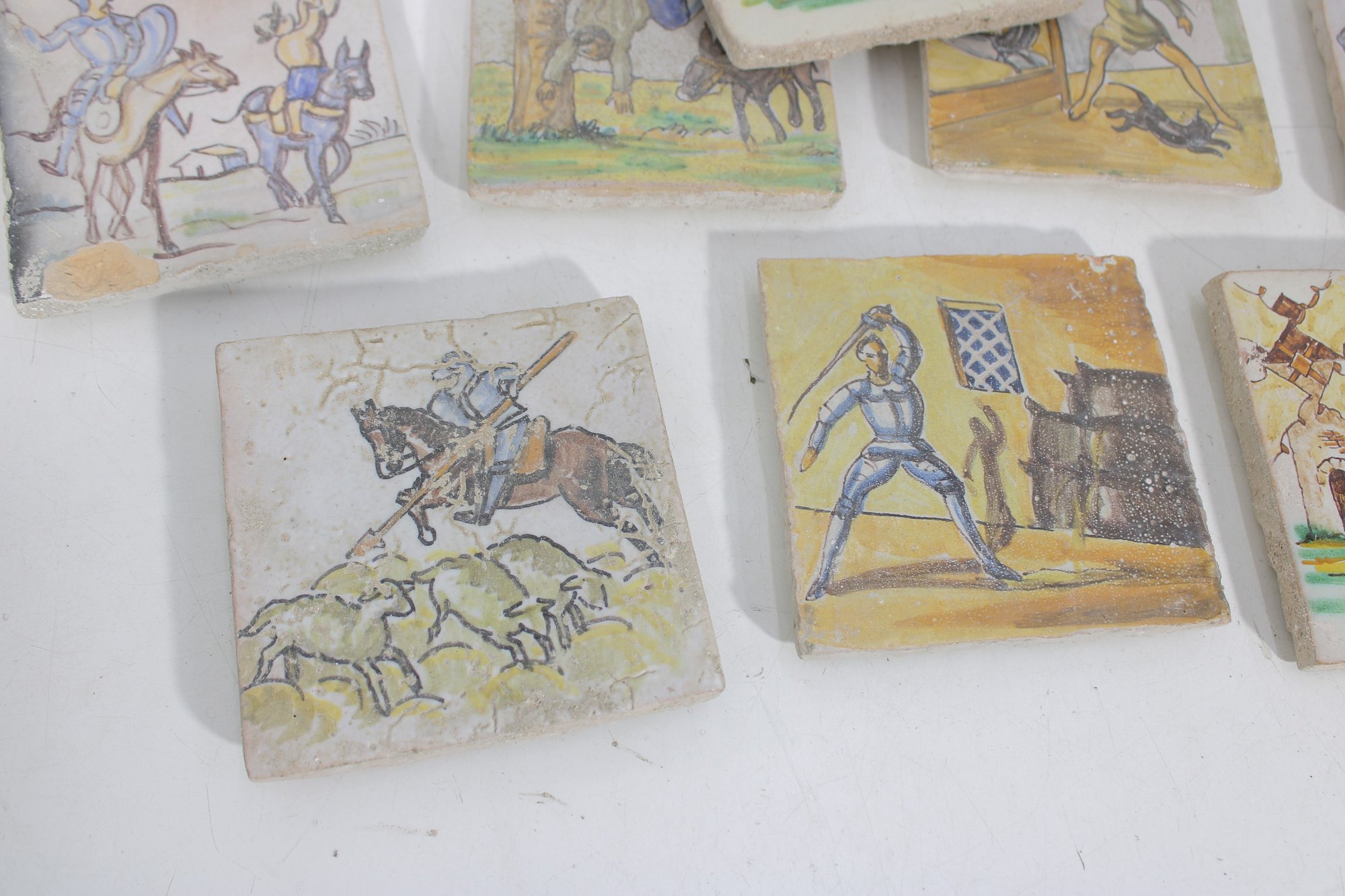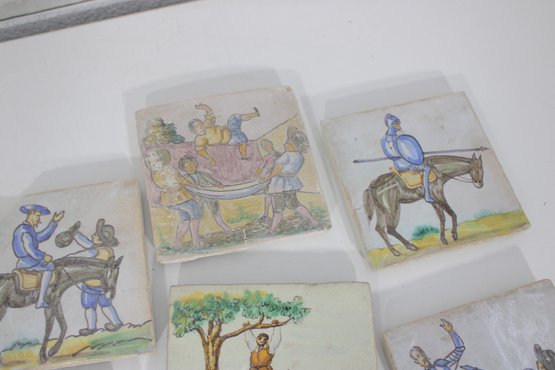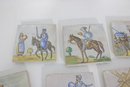 Wonderful large lot of vintage hand-painted ceramic tiles featuring medieval and Don Quixote–style scenes. Each tile showcases detailed illustrations of knights, horseback riders, windmills, and classic storybook battle scenes in soft earthy tones and pastel colors.